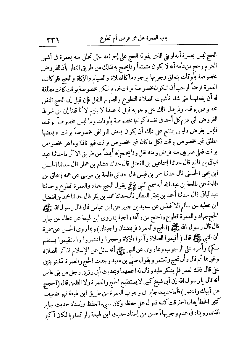 فَأَمَّا حَدِيثُ جَابِرٍ فِي وُجُوبِ الْعُمْرَةِ مِنْ طَرِيقِ ابْنِ لَهِيعَةَ فَهُوَ ضَعِيفٌ كَثِيرُ الْخَطَإِ يُقَالُ احْتَرَقَتْ كُتُبُهُ فَعَوَّلَ عَلَى حِفْظِهِ وَكَانَ سَيِّئَ الْحِفْظِ وَإِسْنَادُ حَدِيثِ جَابِرٍ الَّذِي رَوَيْنَاهُ فِي عَدَمِ وُجُوبِهَا أَحْسَنُ مِنْ إسناد حديث ابن لهيعة ولو تساويا لكان أكبر
