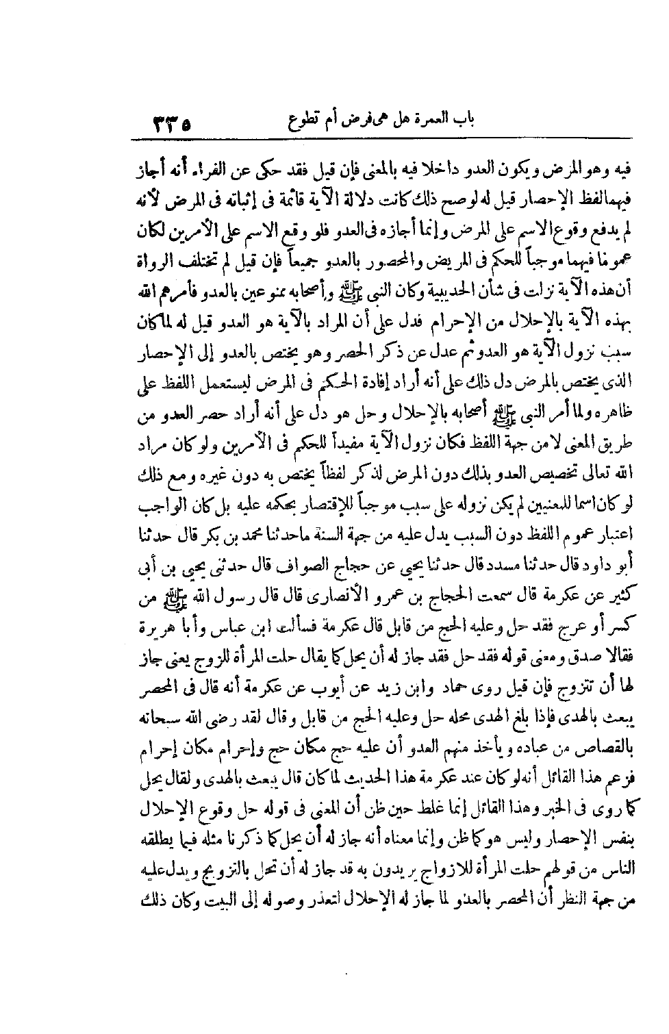 فِيهِ وَهُوَ الْمَرَضُ وَيَكُونَ الْعَدُوُّ دَاخِلًا فِيهِ بِالْمَعْنَى فَإِنْ قِيلَ فَقَدْ حُكِيَ عَنْ الْفَرَّاءِ أَنَّهُ أَجَازَ فِيهِمَا لَفْظَ الْإِحْصَارِ قِيلَ لَهُ لَوْ صَحَّ ذَلِكَ كَانَتْ دَلَالَةُ الْآيَةِ قَائِمَةٌ فِي إثْبَاتِهِ فِي الْمَرَضِ لِأَنَّهُ لَمْ يَدْفَعْ وُقُوعَ الِاسْمِ عَلَى الْمَرَضِ وَإِنَّمَا أَجَازَهُ فِي الْعَدُوِّ فَلَوْ وَقَعَ الِاسْمُ عَلَى الْأَمْرَيْنِ لَكَانَ عُمُومًا فِيهِمَا مُوجِبًا لِلْحُكْمِ فِي الْمَرِيضِ وَالْمَحْصُورِ بِالْعَدُوِّ جَمِيعًا فَإِنْ قِيلَ لَمْ تَخْتَلِفْ الرُّوَاةُ أَنَّ هَذِهِ الْآيَةَ نَزَلَتْ فِي شَأْنِ الْحُدَيْبِيَةِ وكان النبي صلّى الله عليه سلم وَأَصْحَابُهُ مَمْنُوعِينَ بِالْعَدُوِّ فَأَمَرَهُمْ اللَّهُ بِهَذِهِ الْآيَةِ بِالْإِحْلَالِ مِنْ الْإِحْرَامِ فَدَلَّ عَلَى أَنَّ الْمُرَادَ بِالْآيَةِ هُوَ الْعَدُوُّ قِيلَ لَهُ لَمَّا كَانَ سَبَبُ نُزُولِ الْآيَةِ هُوَ الْعَدُوَّ ثُمَّ عَدَلَ عَنْ ذِكْرِ الْحَصْرِ وَهُوَ يَخْتَصُّ بِالْعَدُوِّ إلَى الْإِحْصَارِ الَّذِي يَخْتَصُّ بِالْمَرَضِ دَلَّ ذَلِكَ عَلَى أَنَّهُ أَرَادَ إفَادَةَ الْحُكْمِ فِي الْمَرَضِ لِيُسْتَعْمَلَ اللَّفْظُ عَلَى ظَاهِرِهِ وَلَمَّا أَمَرَ النَّبِيُّ صَلَّى اللَّهُ عَلَيْهِ وَسَلَّمَ أَصْحَابَهُ بِالْإِحْلَالِ وَحَلَّ هُوَ دَلَّ عَلَى أَنَّهُ أَرَادَ حَصْرَ الْعَدُوُّ مِنْ طَرِيقِ الْمَعْنَى لَا مِنْ جِهَةِ اللَّفْظِ فَكَانَ نُزُولُ الْآيَةِ مُفِيدًا لِلْحُكْمِ فِي الْأَمْرَيْنِ وَلَوْ كَانَ مُرَادُ اللَّهِ تَعَالَى تَخْصِيصَ الْعَدُوِّ بِذَلِكَ دُونَ الْمَرَضِ لَذَكَرَ لَفْظًا يَخْتَصُّ بِهِ دُونَ غَيْرِهِ وَمَعَ ذَلِكَ لَوْ كَانَ اسْمًا لِلْمَعْنَيَيْنِ لَمْ يَكُنْ نُزُولَهُ عَلَى سَبَبٍ مُوجِبًا لِلِاقْتِصَارِ بِحُكْمِهِ عَلَيْهِ بَلْ كَانَ الْوَاجِبُ اعْتِبَارَ عُمُومِ اللفظ دون السبب يدل عَلَيْهِ مِنْ جِهَةِ السُّنَّةِ مَا