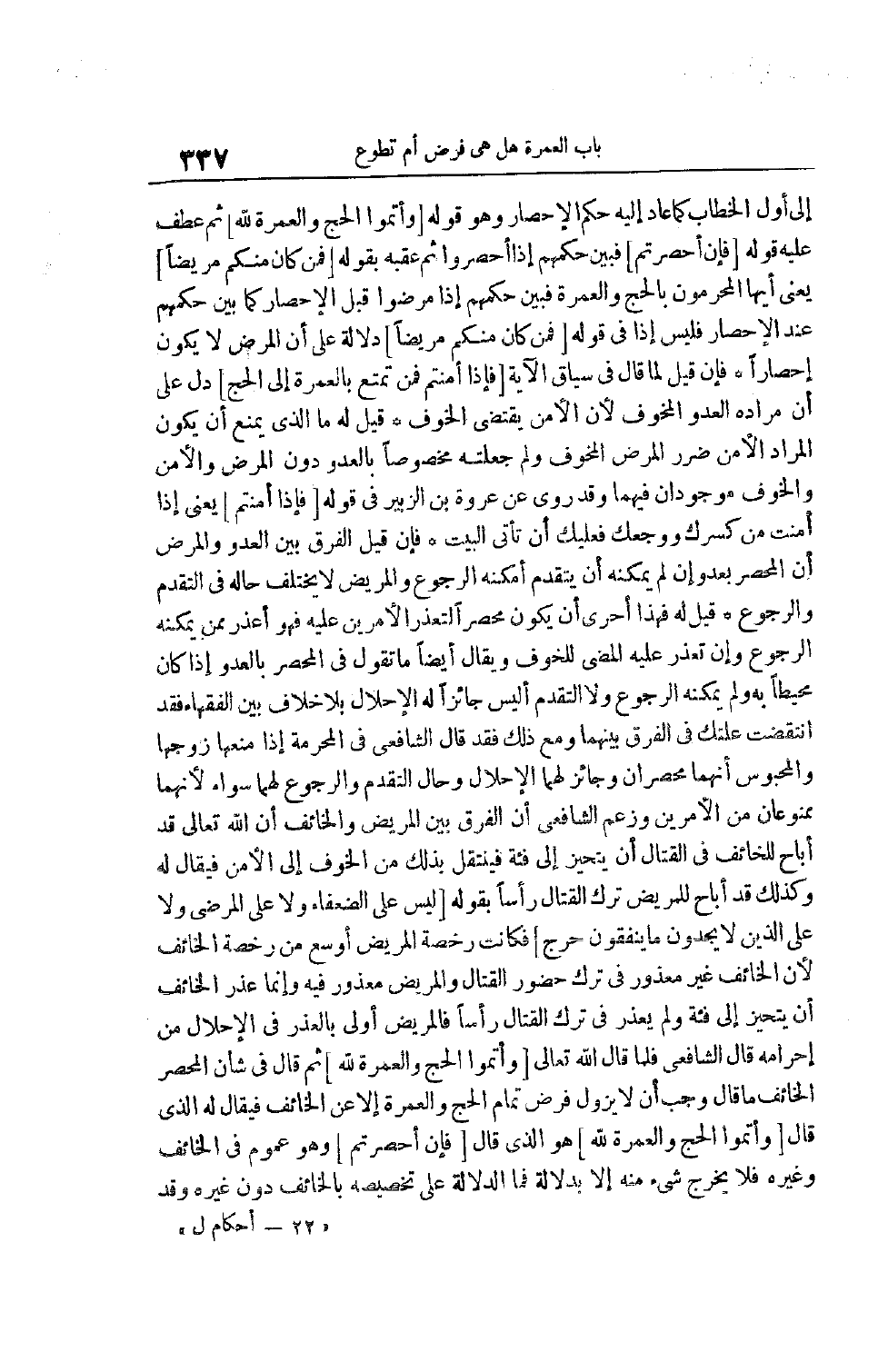 إلَى أَوَّلِ الْخِطَابِ كَمَا عَادَ إلَيْهِ حُكْمُ الْإِحْصَارِ وَهُوَ قَوْلُهُ [وَأَتِمُّوا الْحَجَّ وَالْعُمْرَةَ لِلَّهِ] ثم عطف عليه قوله [فَإِنْ أُحْصِرْتُمْ] فَبَيَّنَ حُكْمَهُمْ إذَا أُحْصِرُوا ثُمَّ عَقَّبَهُ بِقَوْلِهِ [فَمَنْ كانَ مِنْكُمْ مَرِيضاً] يعنى أيها الْمُحْرِمُونَ بِالْحَجِّ وَالْعُمْرَةِ فَبَيَّنَ حُكْمَهُمْ إذَا مَرِضُوا قَبْلَ الْإِحْصَارِ كَمَا بَيَّنَ حُكْمَهُمْ عِنْدَ الْإِحْصَارِ فَلَيْسَ إذًا فِي قَوْلِهِ [فَمَنْ كانَ مِنْكُمْ مَرِيضاً] دَلَالَةٌ عَلَى أَنَّ الْمَرَضَ لَا يَكُونُ إحْصَارًا فَإِنْ قِيلَ لَمَّا قَالَ فِي سِيَاقِ الْآيَةِ [فَإِذا أَمِنْتُمْ فَمَنْ تَمَتَّعَ بِالْعُمْرَةِ إِلَى الْحَجِ] دَلَّ عَلَى أَنَّ مُرَادَهُ الْعَدُوُّ الْمَخُوفُ لِأَنَّ الْأَمْنَ يَقْتَضِي الْخَوْفَ قِيلَ لَهُ مَا الَّذِي يمنع أن يكون المراد الأمن ضَرَرِ الْمَرَضِ الْمَخُوفِ وَلِمَ جَعَلْتَهُ مَخْصُوصًا بِالْعَدُوِّ دُونَ الْمَرَضِ وَالْأَمْنُ وَالْخَوْفُ مَوْجُودَانِ فِيهِمَا وَقَدْ رُوِيَ عَنْ عُرْوَةَ بْنُ الزُّبَيْرِ فِي قَوْلِهِ [فَإِذا أَمِنْتُمْ] يَعْنِي إذَا أَمِنْتَ مِنْ كَسْرِكَ وَوَجَعِكَ فَعَلَيْكَ أَنْ تَأْتِيَ الْبَيْتَ فَإِنْ قِيلَ الْفَرْقُ بَيْنَ الْعَدُوِّ وَالْمَرَضِ أَنَّ الْمُحْصَرَ بِعَدُوٍّ إنْ لَمْ يمكنه أن يتقدم أمكنه الرجوع والمريض لَا يَخْتَلِفُ حَالُهُ فِي التَّقَدُّمِ وَالرُّجُوعِ قِيلَ لَهُ فَهَذَا أَحْرَى أَنْ يَكُونَ مُحْصَرًا لِتَعَذُّرِ الْأَمْرَيْنِ عَلَيْهِ فَهُوَ أَعْذَرُ مِمَّنْ يُمْكِنُهُ الرُّجُوعُ وَإِنْ تَعَذَّرَ عَلَيْهِ الْمُضِيُّ لِلْخَوْفِ وَيُقَالُ أَيْضًا مَا تَقُولُ فِي الْمُحْصَرِ بِالْعَدُوِّ إذَا كَانَ مُحِيطًا بِهِ وَلَمْ يُمْكِنْهُ الرُّجُوعُ وَلَا التَّقَدُّمُ أَلَيْسَ جَائِزًا لَهُ الْإِحْلَالُ بِلَا خِلَافٍ بَيْنَ الْفُقَهَاءِ فَقَدْ انْتَقَضَتْ عِلَّتُكَ فِي الْفَرْقِ بَيْنَهُمَا وَمَعَ ذَلِكَ فَقَدْ قَالَ الشَّافِعِيُّ فِي الْمُحْرِمَةِ إذَا مَنَعَهَا زَوْجُهَا وَالْمَحْبُوسِ إنَّهُمَا مُحْصَرَانِ وَجَائِزٌ لَهُمَا الْإِحْلَالُ وَحَالُ التَّقَدُّمِ وَالرُّجُوعِ لَهُمَا سَوَاءٌ لِأَنَّهُمَا مَمْنُوعَانِ مِنْ الْأَمْرَيْنِ وَزَعَمَ الشَّافِعِيُّ أَنَّ الْفَرْقَ بَيْنَ الْمَرِيضِ وَالْخَائِفِ أَنَّ اللَّهَ تَعَالَى قَدْ أَبَاحَ لِلْخَائِفِ فِي الْقِتَالِ أَنْ يَتَحَيَّزَ إلَى فِئَةٍ فَيَنْتَقِلَ بِذَلِكَ مِنْ الْخَوْفِ إلَى الْأَمْنِ فَيُقَالُ لَهُ وَكَذَلِكَ قَدْ أَبَاحَ لِلْمَرِيضِ تَرْكَ الْقِتَالِ رَأْسًا بِقَوْلِهِ [لَيْسَ عَلَى الضُّعَفاءِ وَلا عَلَى الْمَرْضى وَلا عَلَى الَّذِينَ لا يَجِدُونَ مَا يُنْفِقُونَ حَرَجٌ] فَكَانَتْ رُخْصَةُ الْمَرِيضِ أَوْسَعَ مِنْ رُخْصَةِ الْخَائِفِ لِأَنَّ الْخَائِفَ غَيْرُ مَعْذُورٍ فِي تَرْكِ حُضُورِ الْقِتَالِ وَالْمَرِيضُ مَعْذُورٌ فِيهِ وَإِنَّمَا عُذِرَ الْخَائِفَ أَنْ يَتَحَيَّزَ إلَى فِئَةٍ وَلَمْ يُعْذَرْ فِي تَرْكِ الْقِتَالِ رَأْسًا فَالْمَرِيضُ أَوْلَى بِالْعُذْرِ فِي الْإِحْلَالِ مِنْ إحْرَامِهِ قَالَ الشَّافِعِيُّ فَلَمَّا قَالَ الله تعالى [وَأَتِمُّوا الْحَجَّ وَالْعُمْرَةَ لِلَّهِ] ثُمَّ قَالَ فِي شَأْنِ الْمُحْصَرِ الْخَائِفِ مَا قَالَ وَجَبَ أَنْ لَا يَزُولَ فَرْضُ تَمَامِ الْحَجِّ وَالْعُمْرَةِ إلَّا عَنْ الْخَائِفِ فَيُقَالُ لَهُ الذي قال [وَأَتِمُّوا الْحَجَّ وَالْعُمْرَةَ لِلَّهِ] هو الذي قال [فَإِنْ أُحْصِرْتُمْ] وَهُوَ عُمُومٌ فِي الْخَائِفِ وَغَيْرِهِ فَلَا يَخْرُجُ شَيْءٌ مِنْهُ إلَّا بِدَلَالَةٍ فَمَا الدَّلَالَةُ عَلَى تَخْصِيصِهِ بِالْخَائِفِ دُونَ غَيْرِهِ وَقَدْ