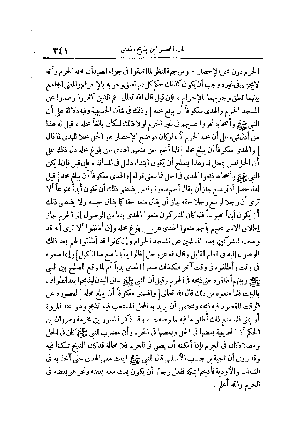 الْمَقْصُودِ فِيهِ ذَبْحُهُ وَيُحْتَمَلُ أَنْ يُرِيدَ بِهِ الْمَحِلَّ الْمُسْتَحَبَّ فِيهِ الذَّبْحُ وَهُوَ عِنْدَ الْمَرْوَةِ أَوْ بِمِنًى فَلَمَّا مَنَعَ ذَلِكَ أَطْلَقَ مَا فِيهِ مَا وَصَفْتُ وَقَدْ ذَكَرَ الْمِسْوَرُ بْنُ مَخْرَمَةَ وَمَرْوَانُ بْنُ الْحَكَمِ أَنَّ الْحُدَيْبِيَةَ بَعْضُهَا فِي الْحِلِّ وَبَعْضُهَا فِي الحرم وأن مضرب النبي صلى الله عليه وسلم كَانَ فِي الْحِلِّ وَمُصَلَّاهُ كَانَ فِي الْحَرَمِ فَإِذَا أَمْكَنَهُ أَنْ يُصَلِّيَ فِي الْحَرَمِ فَلَا مَحَالَةَ قَدْ كَانَ الذَّبْحُ مُمْكِنًا فِيهِ