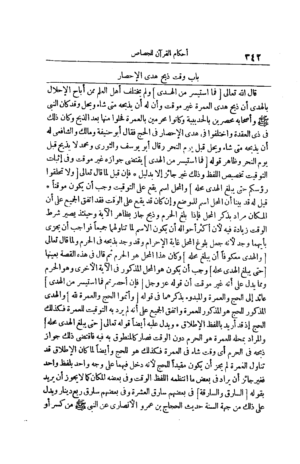قَالَ الله تعالى [فَمَا اسْتَيْسَرَ مِنَ الْهَدْيِ] وَلَمْ يَخْتَلِفْ أَهْلُ الْعِلْمِ مِمَّنْ أَبَاحَ الْإِحْلَالَ بِالْهَدْيِ أَنَّ ذَبْحَ هَدْيِ الْعُمْرَةِ غَيْرُ مُوَقَّتٍ وأن لَهُ أَنْ يَذْبَحَهُ مَتَى شَاءَ وَيَحِلَّ وَقَدْ كَانَ النَّبِيُّ صَلَّى اللَّهُ عَلَيْهِ وَسَلَّمَ وَأَصْحَابُهُ مُحْصَرِينَ بِالْحُدَيْبِيَةِ وَكَانُوا مُحْرِمِينَ بِالْعُمْرَةِ فَحَلُّوا مِنْهَا بعد الذبح وكان ذلك في ذي العقدة وَاخْتَلَفُوا فِي هَدْيِ الْإِحْصَارِ فِي الْحَجِّ فَقَالَ أَبُو حَنِيفَةَ وَمَالِكٌ وَالشَّافِعِيُّ لَهُ أَنْ يَذْبَحَهُ مَتَى شَاءَ وَيَحِلَّ قَبْلَ يَوْمِ النَّحْرِ وَقَالَ أَبُو يُوسُفَ وَالثَّوْرِيُّ وَمُحَمَّدٌ لَا يَذْبَحُ قَبْلَ يَوْمِ النَّحْرِ وَظَاهِرُ قَوْلِهِ [فَمَا اسْتَيْسَرَ مِنَ الْهَدْيِ] يَقْتَضِي جَوَازَهُ غَيْرَ مُوَقَّتٍ وَفِي إثْبَاتِ التَّوْقِيتِ تَخْصِيصُ اللَّفْظِ وَذَلِكَ غَيْرُ جَائِزٍ إلَّا بِدَلِيلٍ فَإِنْ قِيلَ لَمَّا قَالَ تَعَالَى [وَلا تَحْلِقُوا رُؤُسَكُمْ حَتَّى يَبْلُغَ الْهَدْيُ مَحِلَّهُ] وَالْمَحِلُّ اسْمٌ يَقَعُ عَلَى التَّوْقِيتِ وَجَبَ أَنْ يَكُونَ مُوَقَّتًا قِيلَ لَهُ قَدْ بَيَّنَّا أَنَّ الْمَحِلَّ اسْمٌ لِلْمَوْضِعِ وَإِنْ كَانَ قَدْ يَقَعُ عَلَى الْوَقْتِ فَقَدْ اتَّفَقَ الْجَمِيعُ عَلَى أَنَّ الْمَكَانَ مُرَادٌ بِذِكْرِ الْمَحِلِّ فَإِذَا بَلَغَ الْحَرَمَ وَذَبَحَ جَازَ بِظَاهِرِ الْآيَةِ وَحِينَئِذٍ يَصِيرُ شَرْطُ الْوَقْتِ زِيَادَةً فِيهِ لِأَنَّ أَكْثَرَ أَحْوَالِهِ أَنْ يَكُونَ الِاسْمُ لِمَا تَنَاوَلَهُمَا جَمِيعًا فَوَاجِبٌ أَنْ يُجْزِيَ بِأَيِّهِمَا وُجِدَ لِأَنَّهُ جَعَلَ بُلُوغَ الْمَحِلِّ غَايَةَ الْإِحْرَامِ وَقَدْ وُجِدَ بِذَبْحِهِ فِي الْحَرَمِ وَلَمَّا قَالَ تَعَالَى [وَالْهَدْيَ مَعْكُوفاً أَنْ يَبْلُغَ مَحِلَّهُ] وَكَانَ هَذَا الْمَحِلُّ هُوَ الْحَرَمَ ثُمَّ قَالَ فِي هَذِهِ الْقِصَّةِ بِعَيْنِهَا [حَتَّى يَبْلُغَ الْهَدْيُ مَحِلَّهُ] وَجَبَ أَنْ يَكُونَ هُوَ الْمَحِلَّ الْمَذْكُورَ فِي الْآيَةِ الْأُخْرَى وَهُوَ الْحَرَمُ وَمِمَّا يَدُلَّ عَلَى أَنَّهُ غَيْرُ مُوَقَّتٍ أَنَّ قَوْلَهُ عَزَّ وَجَلَّ [فَإِنْ أُحْصِرْتُمْ فَمَا اسْتَيْسَرَ مِنَ الْهَدْيِ] عائد إلى الحج والعمرة والمبدوء بِذِكْرِهِمَا فِي قَوْلِهِ [وَأَتِمُّوا الْحَجَّ وَالْعُمْرَةَ لِلَّهِ] وَالْهَدْيُ الْمَذْكُورُ لِلْحَجِّ هُوَ الْمَذْكُورُ لِلْعُمْرَةِ وَاتَّفَقَ الْجَمِيعُ عَلَى أَنَّهُ لَمْ يُرِدْ بِهِ التَّوْقِيتَ لِلْعُمْرَةِ فَكَذَلِكَ الْحَجُّ إذْ قَدْ أُرِيدَ بِاللَّفْظِ الْإِطْلَاقُ وَيَدُلُّ عَلَيْهِ أَيْضًا قَوْله تَعَالَى [حَتَّى يَبْلُغَ الْهَدْيُ مَحِلَّهُ] وَالْمُرَادُ بِمَحِلِّهِ لِلْعُمْرَةِ هُوَ الْحَرَمُ دُونَ الْوَقْتِ فَصَارَ كَالْمَنْطُوقِ بِهِ فِيهِ فَاقْتَضَى ذَلِكَ جَوَازَ ذَبْحِهِ فِي الْحَرَمِ أَيَّ وَقْتٍ شَاءَ فِي الْعُمْرَةِ فَكَذَلِكَ هُوَ لِلْحَجِّ وَأَيْضًا لَمَّا كَانَ الْإِطْلَاقُ قَدْ تَنَاوَلَ الْعُمْرَةَ لَمْ يَجُزْ أَنْ يَكُونَ مُقَيِّدًا لِلْحَجِّ لِأَنَّهُ دَخَلَ فِيهِمَا عَلَى وَجْهٍ وَاحِدٍ بِلَفْظٍ وَاحِدٍ فَغَيْرُ جَائِزٍ أَنْ يُرَادَ فِي بَعْضِ مَا انْتَظَمَهُ اللَّفْظُ الْوَقْتُ وَفِي بَعْضِهِ الْمَكَانُ كَمَا لَا يَجُوزُ أَنْ يريد بقوله [السَّارِقُ وَالسَّارِقَةُ] فِي بَعْضِهِمْ سَارِقِ الْعَشَرَةِ وَفِي بَعْضِهِمْ سَارِقِ رُبْعِ دِينَارٍ وَيَدُلُّ عَلَى ذَلِكَ مِنْ جِهَةِ السُّنَّةِ