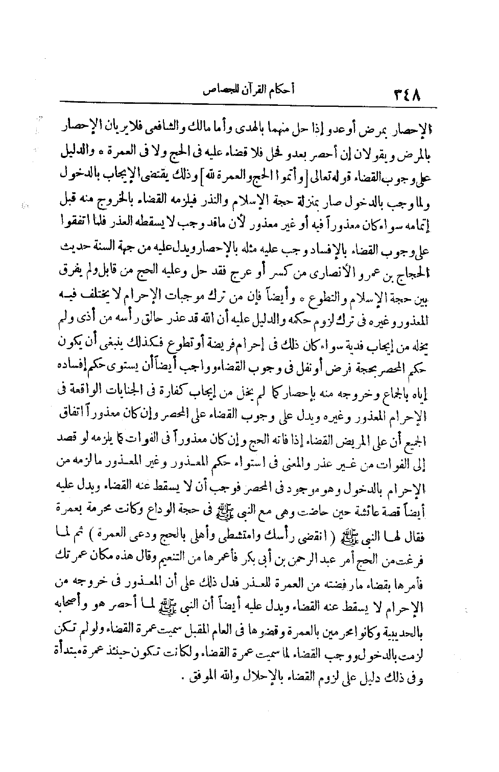 الْإِحْصَارُ بِمَرَضٍ أَوْ عَدُوٍّ إذَا حَلَّ مِنْهُمَا بِالْهَدْيِ وَأَمَّا مَالِكٌ وَالشَّافِعِيُّ فَلَا يَرَيَانِ الْإِحْصَارَ بِالْمَرَضِ وَيَقُولَانِ إنْ أُحْصِرَ بِعَدُوٍّ فَحَلَّ فَلَا قضاء عليه في الحج ولا في الْعُمْرَةِ وَالدَّلِيلُ عَلَى وُجُوبِ الْقَضَاءِ قَوْله تَعَالَى [وَأَتِمُّوا الْحَجَّ وَالْعُمْرَةَ لِلَّهِ] وَذَلِكَ يَقْتَضِي الْإِيجَابَ بِالدُّخُولِ وَلَمَّا وَجَبَ بِالدُّخُولِ صَارَ بِمَنْزِلَةِ حُجَّةِ الْإِسْلَامِ وَالنَّذْرِ فَيَلْزَمُهُ الْقَضَاءُ بِالْخُرُوجِ مِنْهُ قَبْلِ إتْمَامِهِ سَوَاءٌ كَانَ مَعْذُورًا فِيهِ أَوْ غَيْرَ مَعْذُورِ لِأَنَّ مَا قَدْ وَجَبَ لَا يُسْقِطُهُ الْعُذْرُ فَلَمَّا اتَّفَقُوا عَلَى وُجُوبِ الْقَضَاءِ بِالْإِفْسَادِ وَجَبَ عَلَيْهِ مِثْلُهُ بِالْإِحْصَارِ وَيَدُلُّ عَلَيْهِ مِنْ جِهَةِ السُّنَّةِ حَدِيثُ الْحَجَّاجِ بْنِ عَمْرٍو الْأَنْصَارِيِّ مَنْ كُسِرَ أَوْ عَرَجَ فَقَدْ حَلَّ وَعَلَيْهِ الْحَجُّ مِنْ قَابِلٍ وَلَمْ يُفَرِّقْ بَيْنَ حَجَّةِ الْإِسْلَامِ وَالتَّطَوُّعِ وَأَيْضًا فَإِنَّ مَنْ تَرَكَ مُوجِبَاتِ الْإِحْرَامِ لَا يَخْتَلِفُ فِيهِ الْمَعْذُورُ وَغَيْرُهُ فِي تَرْكِ لُزُومِ حُكْمِهِ وَالدَّلِيلُ عليه أن الله قَدْ عَذَرَ حَالِقَ رَأْسِهِ مِنْ أَذَى وَلَمْ يُخْلِهِ مِنْ إيجَابِ فِدْيَةٍ سَوَاءٌ كَانَ ذَلِكَ فِي إحْرَامِ فَرِيضَةٍ أَوْ تَطَوُّعٍ فَكَذَلِكَ يَنْبَغِي أَنْ يَكُونَ حُكْمُ الْمُحْصَرِ بِحَجَّةٍ فَرْضٌ أَوْ نَفْلٌ فِي وُجُوبِ الْقَضَاءَ وَوَاجِبٌ أَيْضًا أَنْ يَسْتَوِيَ حُكْمُ إفْسَادِهِ إيَّاهُ بِالْجِمَاعِ وَخُرُوجِهِ مِنْهُ بِإِحْصَارِ كَمَا لَمْ يَخْلُ مِنْ إيجَابِ كَفَّارَةٍ فِي الْجِنَايَاتِ الْوَاقِعَةِ فِي الْإِحْرَامِ الْمَعْذُورِ وَغَيْرِهِ وَيَدُلُّ عَلَى وُجُوبِ الْقَضَاءِ عَلَى الْمُحْصَرِ وَإِنْ كَانَ مَعْذُورًا اتِّفَاقُ الْجَمِيعِ أَنَّ عَلَى الْمَرِيضِ الْقَضَاءَ إذَا فَاتَهُ الْحَجُّ وَإِنْ كَانَ مَعْذُورًا فِي الْفَوَاتِ كَمَا يَلْزَمُهُ لَوْ قَصَدَ إلَى الْفَوَاتِ مِنْ غَيْرِ عُذْرِ وَالْمَعْنَى فِي اسْتِوَاءِ حُكْمِ الْمَعْذُورِ وَغَيْرِ الْمَعْذُورِ مَا لَزِمَهُ مِنْ الْإِحْرَامِ بِالدُّخُولِ وَهُوَ مَوْجُودُ فِي الْمُحْصَرِ فَوَجَبَ أَنْ لَا يَسْقُطَ عَنْهُ الْقَضَاءُ وَيَدُلُّ عَلَيْهِ أَيْضًا قِصَّةُ عَائِشَةَ حِينَ حَاضَتْ وَهِيَ مَعَ النَّبِيِّ صَلَّى اللَّهُ عَلَيْهِ وَسَلَّمَ فِي حجة الْوَدَاعِ وَكَانَتْ مُحْرِمَةً بِعُمْرَةٍ