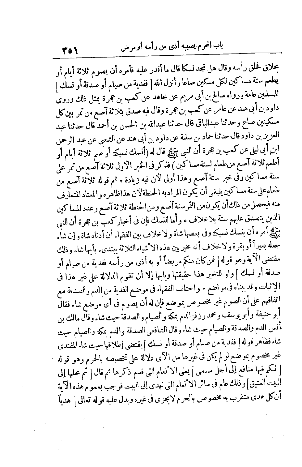 وَحَدَّثَنَا عَبْدُ الْبَاقِي قَالَ حَدَّثَنَا عَبْدُ اللَّهِ بْنُ الْحَسَنِ بْنِ أَحْمَدَ قَالَ حَدَّثَنَا عَبْدُ الْعَزِيزِ بْنُ دَاوُد قَالَ حَدَّثَنَا حَمَّادُ بْنُ سَلَمَةَ عَنْ دَاوُد بْنِ أَبِي هِنْدٍ عن الشعبي عن عبد الرحمن ابن أَبِي لَيْلَى عَنْ كَعْبِ بْنِ عُجْرَةَ أَنَّ النَّبِيَّ صَلَّى اللَّهُ عَلَيْهِ وَسَلَّمَ قَالَ لَهُ (اُنْسُكْ نَسِيكَةً أَوْ صُمْ ثَلَاثَةَ أَيَّامٍ أَوْ أَطْعِمْ ثَلَاثَةَ آصُعٍ مِنْ طَعَامٍ لِسِتَّةِ مَسَاكِينَ)