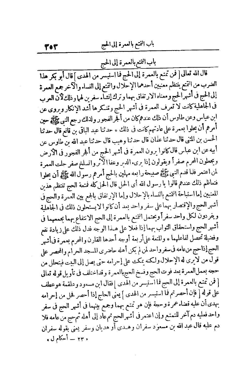 فَمُتْعَةُ الْحَجِّ تَنْتَظِمْ هَذَيْنِ الْمَعْنَيَيْنِ إمَّا اسْتِبَاحَةُ التَّمَتُّعِ بِالنِّسَاءِ بِالْإِحْلَالِ وَإِمَّا الِارْتِفَاقُ بِالْجَمْعِ بَيْنَ الْعُمْرَةِ وَالْحَجِّ فِي أَشْهُرِ الْحَجِّ وَالِاقْتِصَارُ بِهِمَا عَلَى سَفَرٍ وَاحِدٍ بَعْدَ أَنْ كَانُوا لَا يَسْتَحِلُّونَ ذَلِكَ فِي الْجَاهِلِيَّةِ وَيُفْرِدُونَ لِكُلِّ وَاحِدٍ سَفَرًا وَيُحْتَمَلُ التَّمَتُّعُ بِالْعُمْرَةِ إلَى الْحَجِّ الِانْتِفَاعِ بِهِمَا بِجَمْعِهِمَا فِي أَشْهُرِ الْحَجِّ وَاسْتِحْقَاقِ الثَّوَابِ بِهِمَا إذَا فُعِلَا عَلَى هَذَا الْوَجْهِ فَدَلَّ ذَلِكَ عَلَى زِيَادَةِ نَفْعٍ وَفَضِيلَةٍ تَحْصُلُ لِفَاعِلِهِمَا وَالْمُتْعَةُ عَلَى أَرْبَعَةِ أَوْجُهٍ أَحَدُهَا الْقَارِنُ وَالْمُحْرِمُ بِعُمْرَةٍ فِي أَشْهُرِ الْحَجِّ إذَا حَجَّ مِنْ عَامِهِ فِي سَفَرٍ وَاحِدٍ لِمَنْ لَمْ يَكُنْ أَهْلُهُ حَاضِرِي الْمَسْجِدِ الْحَرَامِ وَالْمُحْصِرُ عَلَى قَوْلِ مَنْ لَا يَرَى لَهُ الْإِحْلَالَ وَلَكِنَّهُ يَمْكُثُ عَلَى إحْرَامِهِ حَتَّى يَصِلَ إلَى الْبَيْتِ فَيَتَحَلَّلَ مِنْ حَجِّهِ بِعَمَلِ الْعُمْرَةِ بَعْدَ فَوْتِ الْحَجِّ وَفَسْخِ الْحَجِّ بِالْعُمْرَةِ وَقَدْ اُخْتُلِفَ فِي تَأْوِيلِ قَوْله تَعَالَى [فَمَنْ تَمَتَّعَ بِالْعُمْرَةِ إِلَى الْحَجِّ فَمَا اسْتَيْسَرَ مِنَ الْهَدْيِ] فَقَالَ ابْنُ مَسْعُودٍ وَعَلْقَمَةُ هُوَ عَطْفٌ عَلَى قَوْلِهِ [فَإِنْ أُحْصِرْتُمْ فَمَا اسْتَيْسَرَ مِنَ الْهَدْيِ] يَعْنِي الْحَاجِّ إذَا أُحْصِرَ فَحَلَّ مِنْ إحْرَامِهِ بِهَدْيٍ أَنَّ عَلَيْهِ قَضَاءُ عُمْرَةٍ وَحَجَّةٍ فَإِنْ هُوَ تَمَتَّعَ بِهِمَا وَجَمَعَ بَيْنَهُمَا فِي أَشْهُرِ الْحَجِّ فِي سَفَرٍ وَاحِدٍ فَعَلَيْهِ دَمٌ آخَرُ لِلتَّمَتُّعِ وَإِنْ اعْتَمَرَ فِي أَشْهُرِ الْحَجِّ ثُمَّ عَادَ إلَى أَهْلِهِ ثُمَّ حَجَّ مِنْ عَامِهِ فَلَا دَمَ عَلَيْهِ قَالَ عَبْدُ اللَّهِ بْنُ مَسْعُودٍ سَفَرَانِ وَهَدْيٌ أَوْ هَدْيَانِ وَسَفَرٌ يَعْنِي بقوله سفران