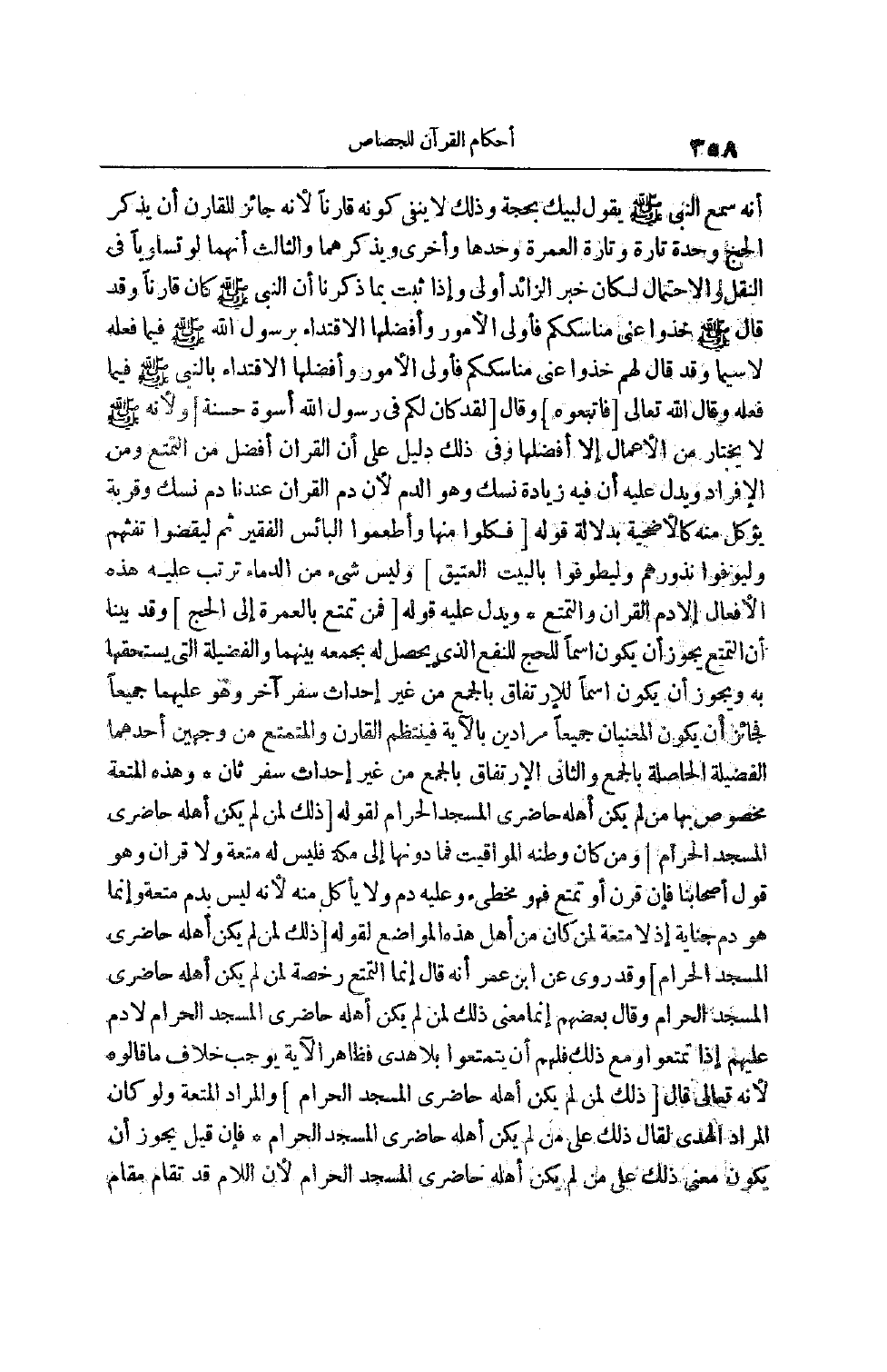 فَأَوْلَى الْأُمُورِ وَأَفْضَلُهَا الِاقْتِدَاءُ بالنبي صلّى الله عليه وسلم فيما فعله وقال الله تعالى [فَاتَّبِعُوهُ] وَقَالَ [لَقَدْ كانَ لَكُمْ فِي رَسُولِ اللَّهِ أُسْوَةٌ حَسَنَةٌ] ولأنه صلّى الله عليه وسلم لَا يَخْتَارُ مِنْ الْأَعْمَالِ إلَّا أَفْضَلَهَا وَفِي ذَلِكَ دَلِيلٌ عَلَى أَنَّ الْقِرَانَ أَفْضَلُ مِنْ التَّمَتُّعِ وَمِنْ الْإِفْرَادِ وَيَدُلَّ عَلَيْهِ أَنَّ فِيهِ زِيَادَةَ نُسُكٍ وَهُوَ الدَّمُ لِأَنَّ دَمَ الْقِرَانِ عِنْدَنَا دَمُ نُسُكٍ وَقُرْبَةٍ يُؤْكَلُ مِنْهُ كَالْأُضْحِيَّةِ بِدَلَالَةِ قَوْلِهِ [فَكُلُوا مِنْها وَأَطْعِمُوا الْبائِسَ الْفَقِيرَ ثُمَّ لْيَقْضُوا تَفَثَهُمْ وَلْيُوفُوا نُذُورَهُمْ وَلْيَطَّوَّفُوا بِالْبَيْتِ الْعَتِيقِ] وَلَيْسَ شَيْءٌ مِنْ الدِّمَاءِ تُرَتَّبُ عَلَيْهِ هَذِهِ الْأَفْعَالُ إلَّا دَمَ الْقِرَانِ وَالتَّمَتُّعِ وَيَدُلُّ عَلَيْهِ قوله [فَمَنْ تَمَتَّعَ بِالْعُمْرَةِ إِلَى الْحَجِ] وَقَدْ بَيَّنَّا أَنَّ التَّمَتُّعَ يَجُوزُ أَنْ يَكُونَ اسْمًا لِلْحَجِّ لِلنَّفْعِ الَّذِي يَحْصُلُ لَهُ بِجَمْعِهِ بَيْنَهُمَا وَالْفَضِيلَةِ الَّتِي يَسْتَحِقُّهَا بِهِ وَيَجُوزُ أَنْ يَكُونَ اسْمًا لِلِارْتِفَاقِ بِالْجَمْعِ مِنْ غَيْرِ إحْدَاثِ سَفَرٍ آخَرَ وَهُوَ عَلَيْهِمَا جَمِيعًا فَجَائِزٌ أَنْ يَكُونَ الْمَعْنَيَانِ جَمِيعًا مُرَادَيْنِ بِالْآيَةِ فَيَنْتَظِمُ الْقَارِنَ وَالْمُتَمَتِّعَ مِنْ وَجْهَيْنِ أَحَدُهُمَا الْفَضِيلَةُ الْحَاصِلَةُ بِالْجَمْعِ وَالثَّانِي الِارْتِفَاقُ بِالْجَمْعِ مِنْ غَيْرِ إحْدَاثِ سَفَرٍ ثَانٍ وَهَذِهِ الْمُتْعَةُ مَخْصُوصٌ بِهَا مَنْ لَمْ يَكُنْ أَهْلُهُ حَاضِرِي الْمَسْجِد الْحَرَامَ لِقَوْلِهِ [ذلِكَ لِمَنْ لَمْ يَكُنْ أَهْلُهُ حاضِرِي الْمَسْجِدِ الْحَرامِ] وَمَنْ كَانَ وَطَنُهُ الْمَوَاقِيتَ فَمَا دُونَهَا إلَى مَكَّةَ فَلَيْسَ لَهُ مُتْعَةٌ وَلَا قِرَانٌ وَهُوَ قَوْلُ أَصْحَابِنَا فَإِنْ قَرَنَ أَوْ تَمَتَّعَ فَهُوَ مُخْطِئٌ وَعَلَيْهِ دَمٌ وَلَا يَأْكُلُ مِنْهُ لِأَنَّهُ لَيْسَ بِدَمِ مُتْعَةٍ وَإِنَّمَا هُوَ دَمُ جِنَايَةٍ إذْ لَا مُتْعَةَ لِمَنْ كَانَ مِنْ أَهْلِ هَذِهِ الْمَوَاضِعِ لِقَوْلِهِ [ذلِكَ لِمَنْ لَمْ يَكُنْ أَهْلُهُ حاضِرِي الْمَسْجِدِ الْحَرامِ] وَقَدْ رُوِيَ عَنْ ابْنِ عُمَرَ أَنَّهُ قَالَ إنَّمَا التَّمَتُّعُ رُخْصَةٌ لِمَنْ لَمْ يَكُنْ أَهْلُهُ حَاضِرِي الْمَسْجِدِ الْحَرَامِ وَقَالَ بَعْضُهُمْ إنَّمَا مَعْنَى ذلك لمن لم يكن أهله حاضري المسجد الْحَرَامِ لَا دَمَ عَلَيْهِمْ إذَا تَمَتَّعُوا وَمَعَ ذَلِكَ فَلَهُمْ أَنْ يَتَمَتَّعُوا بِلَا هَدْيٍ فَظَاهِرُ الْآيَةِ يُوجِبُ خِلَافَ مَا قَالُوهُ لِأَنَّهُ تَعَالَى قَالَ [ذلِكَ لِمَنْ لَمْ يَكُنْ أَهْلُهُ حاضِرِي الْمَسْجِدِ الْحَرامِ] وَالْمُرَادُ الْمُتْعَةُ وَلَوْ كَانَ الْمُرَادُ الْهَدْيَ لَقَالَ ذَلِكَ عَلَى مَنْ لَمْ يَكُنْ أَهْلُهُ حَاضِرِي الْمَسْجِدِ الْحَرَامِ فَإِنْ قِيلَ يَجُوزُ أَنْ يَكُونَ مَعْنَى ذَلِكَ عَلَى مَنْ لَمْ يَكُنْ أَهْلُهُ حَاضِرِي الْمَسْجِدِ الْحَرَامِ لِأَنَّ اللَّامَ قَدْ تُقَامُ مقام