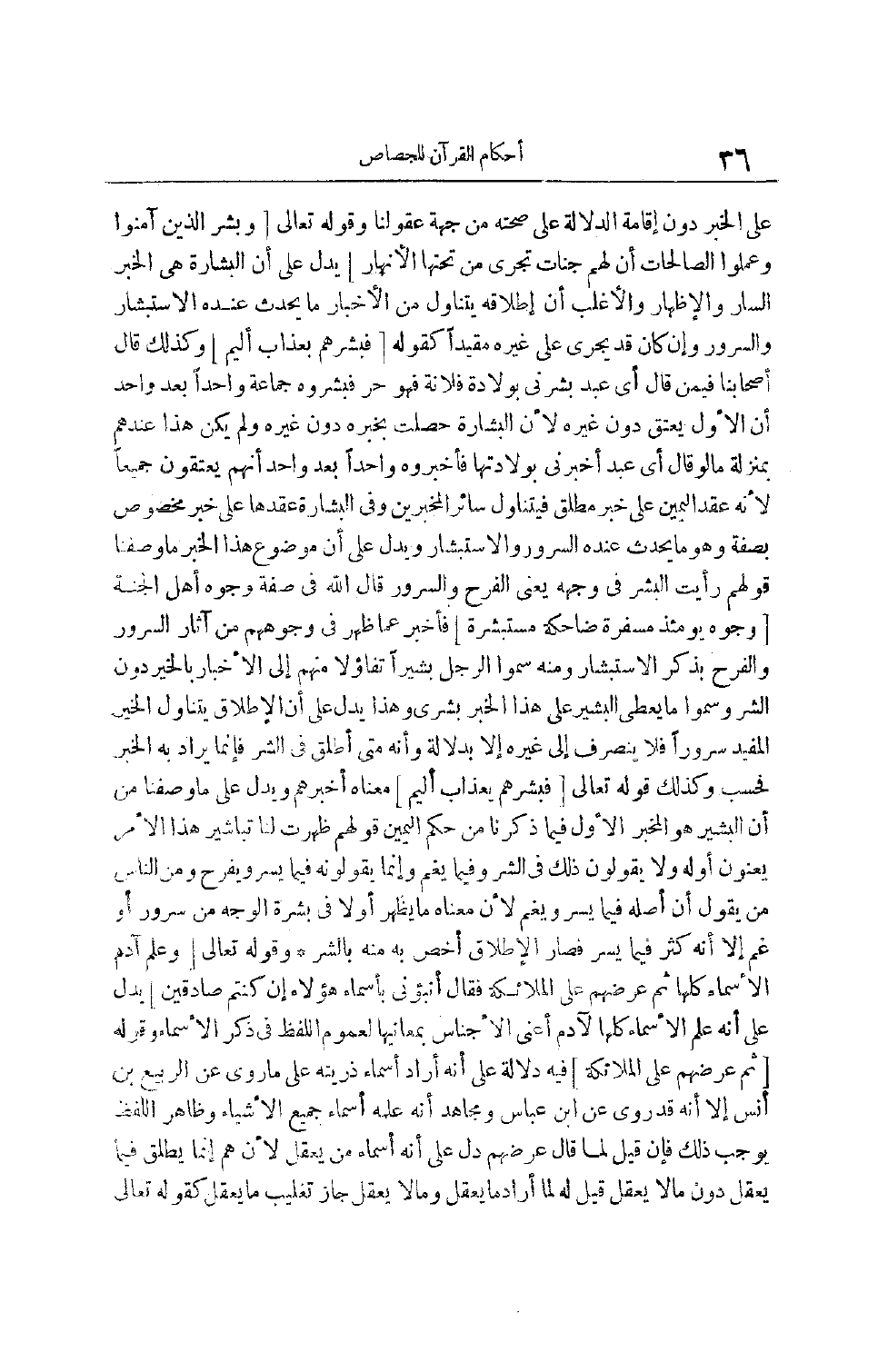 عَلَى الْخَبَرِ دُونَ إقَامَةِ الدَّلَالَةِ عَلَى صِحَّتِهِ مِنْ جِهَةِ عُقُولِنَا وقَوْله تَعَالَى [وَبَشِّرِ الَّذِينَ آمَنُوا وَعَمِلُوا الصَّالِحاتِ أَنَّ لَهُمْ جَنَّاتٍ تَجْرِي مِنْ تَحْتِهَا الْأَنْهارُ] يَدُلُّ عَلَى أَنَّ الْبِشَارَةَ هِيَ الْخَبَرُ السَّارُّ والإظهار وَالْأَغْلَبُ أَنَّ إطْلَاقَهُ يَتَنَاوَلُ مِنْ الْأَخْبَارِ مَا يُحْدِثُ عِنْدَهُ الِاسْتِبْشَارَ وَالسُّرُورَ وَإِنْ كَانَ قَدْ يَجْرِي عَلَى غَيْرِهِ مُقَيَّدًا كَقَوْلِهِ [فَبَشِّرْهُمْ بِعَذابٍ أَلِيمٍ] وَكَذَلِكَ قَالَ أَصْحَابُنَا فِيمَنْ قَالَ أَيُّ عَبْدٍ بَشَّرَنِي بِوِلَادَةِ فُلَانَةَ فَهُوَ حُرٌّ فَبَشَّرُوهُ جَمَاعَةً وَاحِدًا بَعْدَ وَاحِدٍ أَنَّ الْأَوَّلَ يَعْتِقُ دُونَ غَيْرِهِ لِأَنَّ الْبِشَارَةَ حَصَلَتْ بِخَبَرِهِ دُونَ غَيْرِهِ وَلَمْ يَكُنْ هَذَا عِنْدَهُمْ بِمَنْزِلَةِ مَا لَوْ قَالَ أَيُّ عَبْدِ أَخْبَرَنِي بِوِلَادَتِهَا فَأَخْبَرُوهُ وَاحِدًا بَعْدَ وَاحِدٍ أَنَّهُمْ يَعْتِقُونَ جَمِيعًا لِأَنَّهُ عَقَدَ الْيَمِينَ عَلَى خَبَرٍ مُطْلَقٍ فَيَتَنَاوَلُ سَائِرَ الْمُخْبِرِينَ وَفِي الْبِشَارَةِ عَقَدَهَا عَلَى خَبَرٍ مَخْصُوصٍ بِصِفَةٍ وَهُوَ مَا يُحْدِثُ عِنْدَهُ السُّرُورَ وَالِاسْتِبْشَارَ وَيَدُلُّ عَلَى أَنَّ مَوْضُوعَ هَذَا الْخَبَرِ مَا وَصَفْنَا قَوْلُهُمْ رَأَيْت الْبِشْرَ فِي وَجْهِهِ يَعْنِي الْفَرَحَ وَالسُّرُورَ قَالَ اللَّهُ فِي صِفَةِ وُجُوهِ أَهْلِ الجنة [وُجُوهٌ يَوْمَئِذٍ مُسْفِرَةٌ ضاحِكَةٌ مُسْتَبْشِرَةٌ] فَأَخْبَرَ عَمَّا ظَهَرَ فِي وُجُوهِهِمْ مِنْ آثَارِ السُّرُورِ وَالْفَرَحِ بِذِكْرِ الِاسْتِبْشَارِ وَمِنْهُ سَمُّوا الرَّجُلَ بَشِيرًا تَفَاؤُلًا مِنْهُمْ إلَى الْإِخْبَارِ بِالْخَيْرِ دُونَ الشَّرِّ وَسَمُّوا مَا يُعْطَى الْبَشِيرَ عَلَى هَذَا الْخَبَرِ بُشْرَى وَهَذَا يَدُلُّ عَلَى أَنَّ الْإِطْلَاقَ يتناول الخير الْمُفِيدَ سُرُورًا فَلَا يَنْصَرِفُ إلَى غَيْرِهِ إلَّا بِدَلَالَةٍ وَأَنَّهُ مَتَى أُطْلِقَ فِي الشَّرِّ فَإِنَّمَا يُرَادُ بِهِ الْخَبَرُ فَحَسْبُ وَكَذَلِكَ قَوْله تَعَالَى [فَبَشِّرْهُمْ بِعَذابٍ أَلِيمٍ] مَعْنَاهُ أُخْبِرْهُمْ وَيَدُلُّ عَلَى مَا وَصَفْنَا مِنْ أَنَّ الْبَشِيرَ هُوَ الْمُخْبِرُ الْأَوَّلُ فِيمَا ذَكَرْنَا مِنْ حُكْمِ الْيَمِينِ قَوْلُهُمْ ظَهَرَتْ لَنَا تَبَاشِيرُ هَذَا الْأَمْرِ يَعْنُونَ أَوَّلَهُ وَلَا يَقُولُونَ ذَلِكَ فِي الشَّرِّ وَفِيمَا يَغُمُّ وَإِنَّمَا يَقُولُونَهُ فِيمَا يَسُرُّ وَيُفْرِحُ وَمِنْ النَّاسِ مَنْ يَقُولُ إنَّ أَصْلَهُ فِيمَا يَسُرُّ وَيَغُمُّ لِأَنَّ مَعْنَاهُ مَا يَظْهَرُ أَوَّلًا فِي بَشَرَةِ الْوَجْهِ مِنْ سُرُورٍ أَوْ غَمٍّ إلَّا أَنَّهُ كَثُرَ فِيمَا يَسُرُّ فَصَارَ الْإِطْلَاقُ أَخَصَّ بِهِ مِنْهُ بِالشَّرِّ