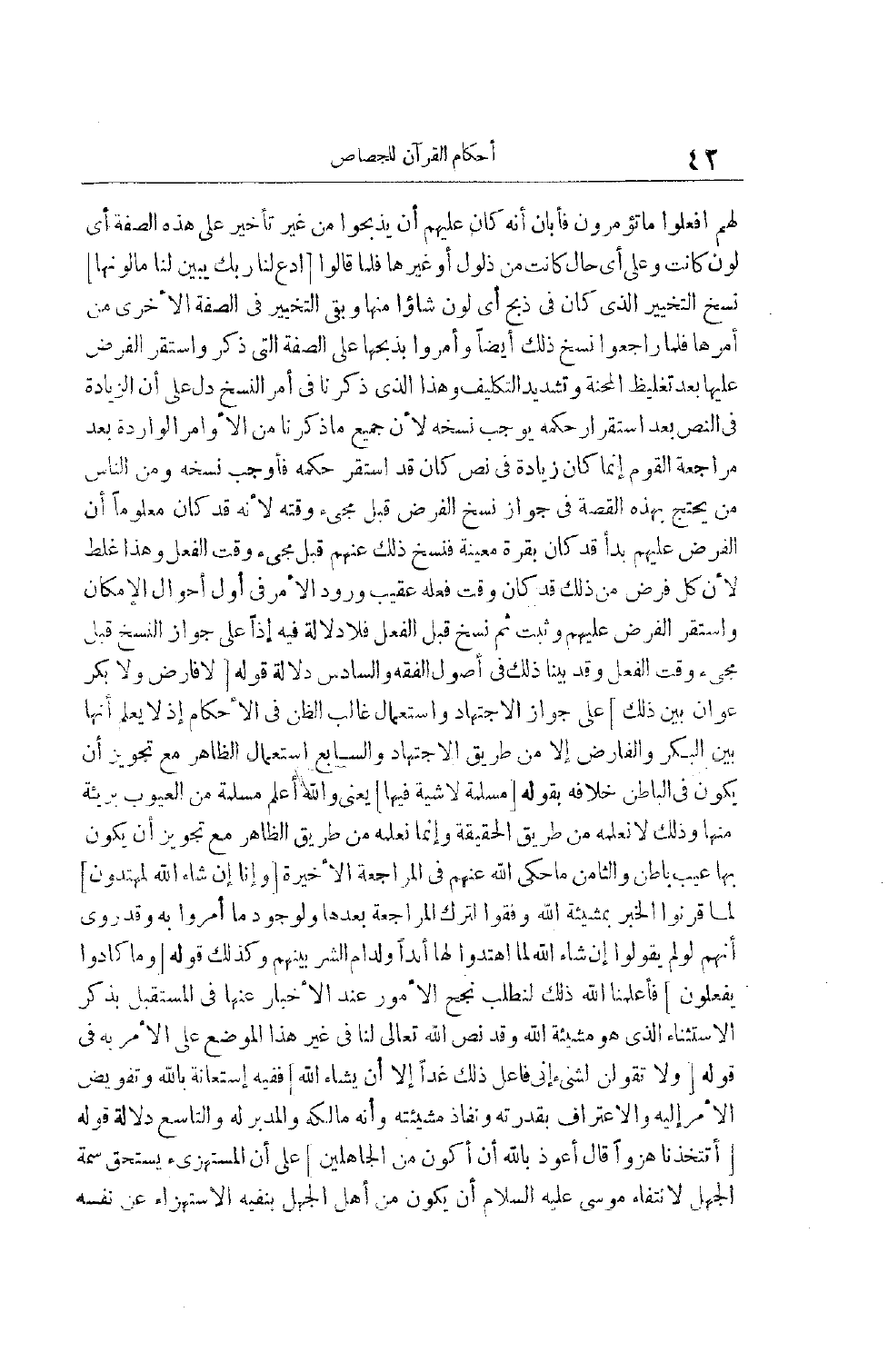 لهم افعلوا ما تؤمرون فَأَبَانَ أَنَّهُ كَانَ عَلَيْهِمْ أَنْ يَذْبَحُوا مِنْ غَيْرِ تَأْخِيرٍ عَلَى هَذِهِ الصِّفَةِ أَيُّ لَوْنٍ كَانَتْ وَعَلَى أَيِّ حَالِ كَانَتْ مِنْ ذَلُولٍ أَوْ غَيْرِهَا فَلَمَّا قَالُوا [ادْعُ لَنا رَبَّكَ يُبَيِّنْ لَنا ما لَوْنُها] نَسَخَ التَّخْيِيرَ الَّذِي كَانَ فِي ذَبْحِ أَيِّ لَوْنٍ شَاءُوا مِنْهَا وَبَقِيَ التَّخْيِيرُ فِي الصِّفَةِ الْأُخْرَى مِنْ أَمْرِهَا فَلَمَّا رَاجَعُوا نُسِخَ ذَلِكَ أَيْضًا وَأُمِرُوا بِذَبْحِهَا عَلَى الصِّفَةِ الَّتِي ذَكَرَ وَاسْتَقَرَّ الْفَرْضُ عَلَيْهَا بَعْدَ تَغْلِيظِ الْمِحْنَةِ وَتَشْدِيدِ التَّكْلِيفِ وَهَذَا الَّذِي ذَكَرْنَا فِي أَمْرِ النَّسْخِ دل على أَنَّ الزِّيَادَةَ فِي النَّصِّ بَعْدَ اسْتِقْرَارِ حُكْمِهِ يُوجِبُ نَسْخَهُ لِأَنَّ جَمِيعَ مَا ذَكَرْنَا مِنْ الْأَوَامِر الْوَارِدَةِ بَعْدَ مُرَاجَعَةِ الْقَوْمِ إنَّمَا كَانَ زِيَادَةً فِي نَصٍّ كَانَ قَدْ اسْتَقَرَّ حُكْمُهُ فَأَوْجَبَ نَسْخَهُ وَمِنْ النَّاسِ مَنْ يَحْتَجُّ بِهَذِهِ الْقِصَّةِ فِي جَوَازِ نَسْخِ الْفَرْضِ قَبْلَ مَجِيءِ وَقْتَهُ لِأَنَّهُ قَدْ كَانَ مَعْلُومًا أَنَّ الْفَرْضَ عليهم بدأ قَدْ كَانَ بَقَرَةً مُعَيَّنَةً فَنُسِخَ ذَلِكَ عَنْهُمْ قَبْلَ مَجِيءِ وَقْتِ الْفِعْلِ وَهَذَا غَلَطٌ لِأَنَّ كُلَّ فَرْضٍ مِنْ ذَلِكَ قَدْ كَانَ وَقْتُ فِعْلِهِ عَقِيبَ وُرُودِ الْأَمْرِ فِي أَوَّلِ أَحْوَالِ الْإِمْكَانِ وَاسْتَقَرَّ الْفَرْضُ عَلَيْهِمْ وَثَبَتَ ثُمَّ نُسِخَ قَبْلَ الْفِعْلِ فَلَا دَلَالَةَ فِيهِ إذَا عَلَى جَوَازِ النَّسْخِ قَبْلَ مَجِيءِ وَقْتِ الْفِعْلِ وَقَدْ بَيَّنَّا ذَلِكَ فِي أُصُولِ الْفِقْهِ وَالسَّادِسُ دَلَالَةُ قَوْلِهِ [لا فارِضٌ وَلا بِكْرٌ عَوانٌ بَيْنَ ذلِكَ] عَلَى جَوَازِ الِاجْتِهَادِ وَاسْتِعْمَالِ غَالِبِ الظَّنّ فِي الْأَحْكَامِ إذْ لَا يُعْلَمُ أَنَّهَا بَيْنَ الْبِكْرِ وَالْفَارِضِ إلَّا مِنْ طَرِيقِ الِاجْتِهَادِ وَالسَّابِعُ اسْتِعْمَالُ الظَّاهِرِ مَعَ تَجْوِيزِ أَنْ يَكُونَ فِي الْبَاطِنِ خلافه بقوله [مُسَلَّمَةٌ لا شِيَةَ فِيها] يَعْنِي وَاَللَّهُ أَعْلَمُ مُسَلَّمَةٌ مِنْ الْعُيُوبِ بَرِيئَةٌ مِنْهَا وَذَلِكَ لَا نَعْلَمُهُ مِنْ طَرِيقِ الْحَقِيقَةِ وَإِنَّمَا نَعْلَمُهُ مِنْ طَرِيقِ الظَّاهِرِ مَعَ تَجْوِيزِ أَنْ يَكُون بِهَا عَيْبٌ بَاطِنٌ وَالثَّامِنُ مَا حَكَى اللَّهُ عَنْهُمْ فِي الْمُرَاجَعَةِ الْأَخِيرَةِ [وَإِنَّا إِنْ شاءَ اللَّهُ لَمُهْتَدُونَ] لَمَّا قَرَنُوا الْخَبَرَ بِمَشِيئَةِ اللَّهِ وُفِّقُوا لِتَرْكِ الْمُرَاجَعَةِ بَعْدَهَا وَلِوُجُودِ مَا أُمِرُوا بِهِ وَقَدْ رُوِيَ أَنَّهُمْ لَوْ لَمْ يَقُولُوا إنْ شَاءَ اللَّهُ لَمَا اهْتَدَوْا لَهَا أَبَدًا وَلَدَامَ الشَّرُّ بينهم وكذلك قوله [وَما كادُوا يَفْعَلُونَ] فأعلمنا الله ذلك لنطلب نجح الْأُمُورِ عِنْدَ الْإِخْبَارِ عَنْهَا فِي الْمُسْتَقْبِلِ بِذِكْرِ الِاسْتِثْنَاءِ الَّذِي هُوَ مَشِيئَةُ اللَّهِ وَقَدْ نَصَّ اللَّهُ تَعَالَى لَنَا فِي غَيْرِ هَذَا الْمَوْضِعِ عَلَى الْأَمْرِ بِهِ فِي قَوْلِهِ [وَلا تَقُولَنَّ لِشَيْءٍ إِنِّي فاعِلٌ ذلِكَ غَداً إِلَّا أَنْ يَشاءَ اللَّهُ] فَفِيهِ اسْتِعَانَةٌ بِاَللَّهِ وَتَفْوِيضُ الْأَمْرِ إلَيْهِ وَالِاعْتِرَافُ بِقُدْرَتِهِ وَنَفَاذِ مَشِيئَتِهِ وَأَنَّهُ مَالِكُهُ وَالْمُدَبِّرُ لَهُ وَالتَّاسِعُ دَلَالَةُ قَوْلِهِ [أَتَتَّخِذُنا هُزُواً قالَ أَعُوذُ بِاللَّهِ أَنْ أَكُونَ مِنَ الْجاهِلِينَ] عَلَى أَنَّ الْمُسْتَهْزِئَ يَسْتَحِقُّ سِمَةَ الْجَهْلِ لِانْتِفَاءِ مُوسَى عَلَيْهِ السَّلَامُ أَنْ يَكُونَ مِنْ أَهْلِ الْجَهْل