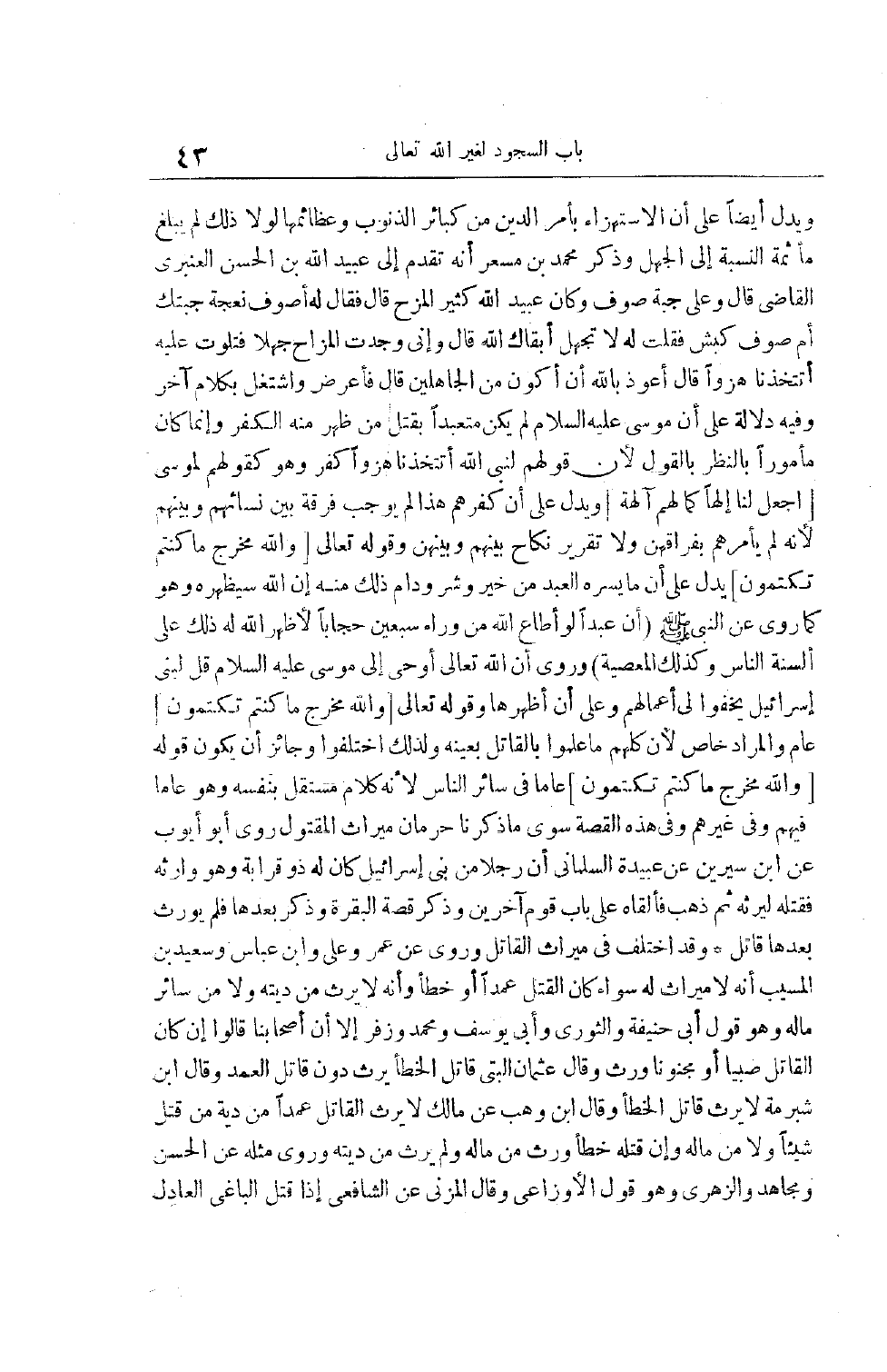وَيَدُلُّ أَيْضًا عَلَى أَنَّ الِاسْتِهْزَاءَ بِأَمْرِ الدِّينِ مِنْ كَبَائِرِ الذُّنُوبِ وَعَظَائِمِهَا لَوْلَا ذَلِكَ لَمْ يَبْلُغْ مَأْثَمُهُ النِّسْبَةَ إلَى الْجَهْلِ وَذَكَرَ مُحَمَّدُ بْنُ مِسْعَرٍ أَنَّهُ تَقَدَّمَ إلَى عُبَيْدِ اللَّهِ بْنِ الْحَسَنِ الْعَنْبَرِيِّ الْقَاضِي قَالَ وَعَلَيَّ جُبَّةُ صُوفٍ وَكَانَ عُبَيْدُ اللَّهِ كَثِيرَ الْمَزْحِ قَالَ فَقَالَ لَهُ أَصُوفُ نَعْجَةٍ جُبَّتُك أَمْ صُوفُ كَبْشٍ فَقُلْت لَهُ لَا تَجْهَلْ أَبْقَاكَ اللَّهُ قَالَ وَأَنَّى وَجَدْت الْمِزَاحَ جَهْلًا فَتَلَوْت عَلَيْهِ أَتَتَّخِذُنَا هُزُوًا قَالَ أَعُوذُ بِاللَّهِ أَنْ أَكُونَ من الجاهلين قَالَ فَأَعْرَضِ وَاشْتَغَلَ بِكَلَامٍ آخَرَ وَفِيهِ دَلَالَةٌ عَلَى أَنَّ مُوسَى عَلَيْهِ السَّلَامُ لَمْ يَكُنْ مُتَعَبِّدًا بِقَتْلِ مَنْ ظَهَرَ مِنْهُ الْكُفْرُ وَإِنَّمَا كَانَ مَأْمُورًا بِالنَّظَرِ بِالْقَوْلِ لِأَنَّ قَوْلَهُمْ لِنَبِيِّ الله أتتخذنا هزوا كُفْرٌ وَهُوَ كَقَوْلِهِمْ لِمُوسَى [اجْعَلْ لَنا إِلهاً كَما لَهُمْ آلِهَةٌ] ويدل عَلَى أَنَّ كُفْرَهُمْ هَذَا لَمْ يُوجِبْ فُرْقَةً بين نسائهم وبينهم لأنه لم يأمرهم بِفِرَاقِهِنَّ وَلَا تَقْرِيرِ نِكَاحٍ بَيْنَهُمْ وَبَيْنَهُنَّ وقَوْله تعالى [وَاللَّهُ مُخْرِجٌ ما كُنْتُمْ تَكْتُمُونَ] يَدُلُّ عَلَى أَنَّ مَا يَسَّرَهُ الْعَبْدُ مِنْ خَيْرٍ وَشَرٍّ وَدَامَ ذَلِكَ مِنْهُ أَنَّ اللَّهَ سيظهره وهو كَمَا