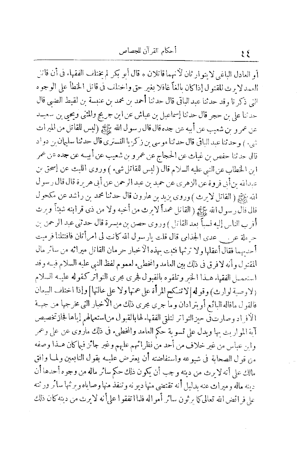 فَثَبَتَ بِهَذِهِ الْأَخْبَارِ حِرْمَانُ الْقَاتِلِ مِيرَاثَهُ مِنْ سَائِرِ مَالِ الْمَقْتُولِ وَأَنَّهُ لَا فَرْقَ فِي ذَلِكَ بَيْنَ الْعَامِدِ وَالْمُخْطِئِ لِعُمُومِ لَفْظِ النَّبِيِّ عَلَيْهِ السَّلَامُ فِيهِ وَقَدْ اسْتَعْمَلَ الْفُقَهَاءُ هَذَا الْخَبَرَ وَتَلَقَّوْهُ بِالْقَبُولِ فَجَرَى مَجْرَى التَّوَاتُرِ