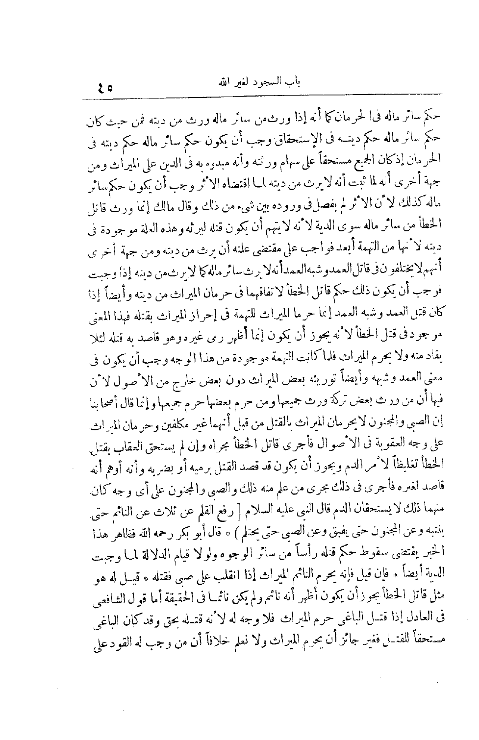 قَالَ أَبُو بَكْرٍ رَحِمَهُ اللَّهُ فَظَاهِرُ هَذَا الْخَبَرِ يَقْتَضِي سُقُوطَ حُكْمِ قَتْلِهِ رَأْسًا مِنْ سَائِرِ الْوُجُوهِ وَلَوْلَا قِيَامُ الدَّلَالَةِ لَمَا وَجَبَتْ الدِّيَةُ أَيْضًا فَإِنْ قِيلَ فَإِنَّهُ يُحْرَمُ النَّائِمُ الْمِيرَاثَ إذَا انْقَلَبَ عَلَى صَبِيِّ فَقَتَلَهُ قِيلَ لَهُ هُوَ مِثْلُ قَاتِلِ الْخَطَإِ يَجُوزَ أَنْ يَكُونَ أَظْهَرَ أَنَّهُ نَائِمٌ ولم يكن نائما في الحقيقة أما قَوْلُ الشَّافِعِيِّ فِي الْعَادِلِ إذَا قَتَلَ الْبَاغِيَ حُرِمَ الْمِيرَاثَ فَلَا وَجْه لَهُ لِأَنَّهُ قَتَلَهُ بِحَقٍّ وَقَدْ كَانَ الْبَاغِي مُسْتَحِقًّا لِلْقَتْلِ فَغَيْرُ جَائِزٍ أَنْ يُحْرَمَ الْمِيرَاثَ وَلَا نَعْلَمُ خِلَافًا أَنَّ مَنْ وَجَبَ لَهُ الْقَوَدُ عَلَى