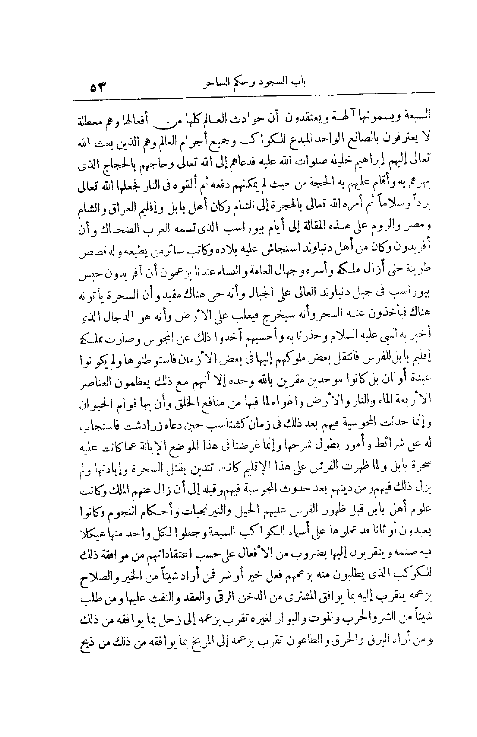 الْعَرَبُ الضَّحَّاكَ وَإِنَّ أَفْرِيدُونَ وَكَانَ مِنْ أَهْلِ دنباوند اسْتَجَاشَ عَلَيْهِ بِلَادَهُ وَكَاتَبَ سَائِرَ مَنْ يُطِيعُهُ وَلَهُ قِصَصٌ طَوِيلَةٌ حَتَّى أَزَالَ مُلْكَهُ وَأَسَرَهُ وَجُهَّالُ الْعَامَّةِ وَالنِّسَاءِ عِنْدَنَا يَزْعُمُونَ أَنَّ أَفْرِيدُونَ حَبَسَ بيوراسب فِي جَبَلٍ دنباوند الْعَالِي عَلَى الْجِبَالِ وَأَنَّهُ حَيٌّ هُنَاكَ مُقَيَّدٌ وَأَنَّ السَّحَرَةَ يَأْتُونَهُ هُنَاكَ فَيَأْخُذُونَ عَنْهُ السِّحْرَ وَأَنَّهُ سَيَخْرُجُ فَيَغْلِبُ عَلَى الْأَرْضِ وَأَنَّهُ هُوَ الدَّجَّالُ الذي أخبر به النبي عليه السلام وحذرنا به وَأَحْسَبُهُمْ أَخَذُوا ذَلِكَ عَنْ الْمَجُوسِ وَصَارَتْ مَمْلَكَةُ إقْلِيمِ بَابِلَ لِلْفُرْسِ فَانْتَقَلَ بَعْضُ مُلُوكِهِمْ إلَيْهَا فِي بَعْضِ الْأَزْمَانِ فَاسْتَوْطَنُوهَا وَلَمْ يَكُونُوا عَبَدَةَ أَوْثَانٍ بَلْ كَانُوا مُوَحِّدِينَ مُقِرِّينَ بِاَللَّهِ وَحْدَهُ إلَّا أَنَّهُمْ مَعَ ذَلِكَ يُعَظِّمُونَ الْعَنَاصِرَ الْأَرْبَعَةَ الْمَاءَ وَالنَّارَ وَالْأَرْضَ وَالْهَوَاءَ لِمَا فِيهَا مِنْ مَنَافِعِ الْخَلْقِ وَأَنَّ بِهَا قِوَامُ الْحَيَوَانِ وَإِنَّمَا حَدَثَتْ الْمَجُوسِيَّةَ فِيهِمْ بَعْد ذَلِكَ فِي زَمَانِ كشتاسب حِينَ دَعَاهُ زَرَادُشْتُ فَاسْتَجَابَ لَهُ عَلَى شرائط وأمور يطول شرحها وإنما غرضنا فِي هَذَا الْمَوْضِعِ الْإِبَانَةَ عَمَّا كَانَتْ عَلَيْهِ سَحَرَةُ بَابِلَ وَلَمَّا ظَهَرَتْ الْفُرْسُ عَلَى هَذَا الْإِقْلِيمِ كَانَتْ تَتَدَيَّنُ بِقَتْلِ السَّحَرَةِ وَإِبَادَتِهَا وَلَمْ يَزُلْ ذَلِكَ فِيهِمْ وَمِنْ دِينِهِمْ بَعْدَ حُدُوثِ الْمَجُوسِيَّةِ فِيهِمْ وَقَبْلَهُ إلَى أَنْ زَالَ عَنْهُمْ الْمُلْكُ وَكَانَتْ عُلُومُ أَهْلِ بَابِل قَبْلَ ظُهُورِ الْفُرْسِ عَلَيْهِمْ الْحِيَلَ والنيرنجيات وَأَحْكَامِ النُّجُومِ وَكَانُوا يَعْبُدُونَ أَوْثَانًا قَدْ عَمِلُوهَا عَلَى أَسْمَاءِ الْكَوَاكِبِ السَّبْعَةِ وَجَعَلُوا لِكُلِّ وَاحِدٍ مِنْهَا هَيْكَلًا فِيهِ صَنَمُهُ وَيَتَقَرَّبُونَ إلَيْهَا بِضُرُوبٍ مِنْ الْأَفْعَالِ عَلَى حَسَبِ اعْتِقَادَاتِهِمْ مِنْ مُوَافَقَةِ ذَلِكَ لِلْكَوْكَبِ الَّذِي يَطْلُبُونَ مِنْهُ بِزَعْمِهِمْ فِعْلَ خَيْرٍ أَوْ شَرٍّ فَمَنْ أَرَادَ شَيْئًا مِنْ الْخَيْرِ وَالصَّلَاحِ بِزَعْمِهِ يَتَقَرَّبُ إلَيْهِ بِمَا يُوَافِقُ الْمُشْتَرَى مِنْ الدَّخَنِ الرقى وَالْعَقْدِ وَالنَّفْثِ عَلَيْهَا وَمَنْ طَلَبِ شَيْئًا مِنْ الشَّرِّ وَالْحَرْبِ وَالْمَوْتِ وَالْبَوَارِ لِغَيْرِهِ تَقَرَّبَ بِزَعْمِهِ إلَى زُحَلَ بِمَا يُوَافِقُهُ مِنْ ذَلِكَ وَمَنْ أَرَادَ الْبَرْقَ وَالْحَرْقَ وَالطَّاعُونَ تَقَرَّبَ بِزَعْمِهِ إلَى الْمِرِّيخِ بِمَا يُوَافِقُهُ مِنْ ذَلِكَ مِنْ ذَبْحِ