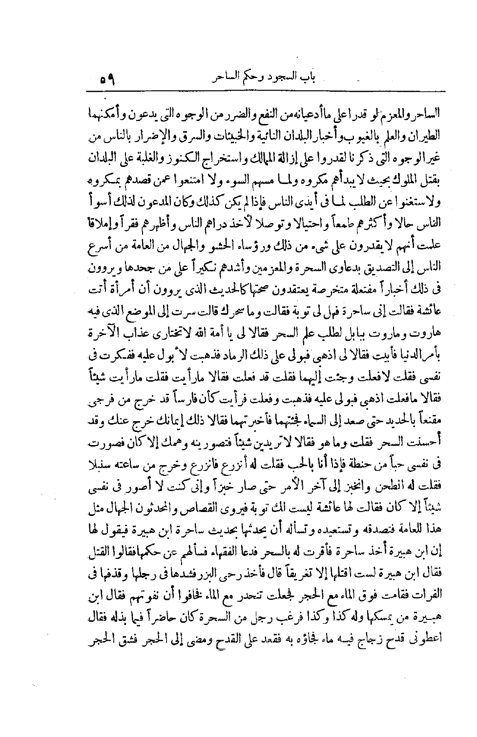 الساحر والمعزم لو قدرا على ما أدعيا مِنْ النَّفْعِ وَالضَّرَرِ مِنْ الْوُجُوهِ الَّتِي يَدَّعُونَ وَأَمْكَنَهُمَا الطَّيَرَانُ وَالْعِلْمُ بِالْغُيُوبِ وَأَخْبَارِ الْبُلْدَانِ النَّائِيَةِ وَالْخَبِيئَاتِ وَالسُّرُقِ وَالْإِضْرَارِ بِالنَّاسِ مِنْ غَيْرِ الْوُجُوهِ الَّتِي ذَكَرْنَا لَقَدَرُوا عَلَى إزَالَةِ الْمَمَالِكِ وَاسْتِخْرَاجِ الْكُنُوزِ وَالْغَلَبَةِ عَلَى الْبُلْدَانِ بِقَتْلِ الْمُلُوكِ بِحَيْثُ لَا يَبْدَأهُمْ مَكْرُوهٌ وَلَمَا مَسَّهُمْ السُّوءُ وَلَا امْتَنَعُوا عَمَّنْ قَصَدَهُمْ بِمَكْرُوهٍ وَلَاسْتَغْنَوْا عَنْ الطَّلَبِ لِمَا فِي أَيْدِي النَّاسِ فَإِذَا لَمْ يَكُنْ كَذَلِكَ وَكَانَ الْمُدَّعُونَ لِذَلِكَ أَسْوَأَ النَّاسِ حَالًا وَأَكْثَرَهُمْ طَمَعًا وَاحْتِيَالًا وَتَوَصُّلًا لِأَخْذِ دَرَاهِمِ النَّاسِ وَأَظْهَرَهُمْ فَقْرًا وَإِمْلَاقًا عَلِمْت أَنَّهُمْ لَا يَقْدِرُونَ على شيء من ذلك ورؤساء الحشو وَالْجُهَّالُ مِنْ الْعَامَّةِ مِنْ أَسْرَعِ النَّاسِ إلَى التَّصْدِيقِ بِدَعَاوَى السَّحَرَةِ وَالْمُعَزِّمِينَ وَأَشَدِّهِمْ نَكِيرًا عَلَى مَنْ جَحَدَهَا وَيَرْوُونَ فِي ذَلِكَ أَخْبَارًا مُفْتَعَلَةً مُتَخَرِّصَةً يَعْتَقِدُونَ صِحَّتَهَا كَالْحَدِيثِ الَّذِي يَرْوُونَ أَنَّ امْرَأَةً أَتَتْ عَائِشَةَ فَقَالَتْ إنِّي سَاحِرَةٌ فَهَلْ لِي تَوْبَةٌ فَقَالَتْ وَمَا سِحْرُك قَالَتْ سِرْت إلَى الْمَوْضِعِ الَّذِي فِيهِ هَارُوتُ وَمَارُوتُ بِبَابِلَ لِطَلَبِ عِلْمِ السِّحْرِ فَقَالَا لِي يَا أَمَةَ اللَّهِ لَا تَخْتَارِي عَذَابَ الْآخِرَةِ بِأَمْرِ الدُّنْيَا فَأَبَيْت فَقَالَا لِي اذْهَبِي فَبُولِي عَلَى ذَلِكَ الرَّمَادِ فَذَهَبْت لِأَبُولَ عَلَيْهِ فَفَكَّرْتُ فِي نَفْسِي فَقُلْت لَا فَعَلْت وَجِئْت إلَيْهِمَا فَقُلْت قَدْ فَعَلْت فَقَالَا مَا رَأَيْت فَقُلْت مَا رَأَيْت شيئا فقالا ما فعلت اذْهَبِي فَبُولِي عَلَيْهِ فَذَهَبْت وَفَعَلْت فَرَأَيْت كَأَنَّ فَارِسًا قَدْ خَرَجَ مِنْ فَرْجِي مُقَنَّعًا بِالْحَدِيدِ حَتَّى صَعِدَ إلَى السَّمَاءِ فَجِئْتهمَا فَأَخْبَرْتهمَا فَقَالَا ذَلِكَ إيمَانُك خَرَجَ عَنْك وَقَدْ أَحْسَنْت السِّحْرَ فَقُلْت وَمَا هُوَ فَقَالَا لَا تُرِيدِينَ شَيْئًا فتصورينه وَهْمِك إلَّا كَانَ فَصَوَّرْت فِي نَفْسِي حَبًّا مِنْ حِنْطَةٍ فَإِذَا أَنَا بِالْحَبِّ فَقُلْت لَهُ انْزَرِعْ فَانْزَرَعَ وَخَرَجَ مِنْ سَاعَتِهِ سُنْبِلَا فَقُلْت لَهُ انْطَحَنَ وَانْخَبِزْ إلَى آخَرِ الْأَمْرِ حَتَّى صَارَ خُبْزًا وَإِنِّي كُنْت لَا أُصَوِّرُ فِي نَفْسِي شَيْئًا إلَّا كَانَ فَقَالَتْ لَهَا عَائِشَةُ لَيْسَتْ لَك تَوْبَةٌ فَيَرْوِي الْقُصَّاصُ وَالْمُحَدِّثُونَ الْجُهَّالُ مِثْلَ هَذَا لِلْعَامَّةِ فَتُصَدِّقُهُ وَتَسْتَعِيدُهُ وَتَسْأَلُهُ أَنْ يُحَدِّثَهَا بِحَدِيثِ سَاحِرَةِ ابْنِ هُبَيْرَةَ فَيَقُولُ لَهَا إنَّ ابْنَ هُبَيْرَةَ أَخَذَ سَاحِرَةً فَأَقَرَّتْ لَهُ بِالسِّحْرِ فَدَعَا الْفُقَهَاءَ فَسَأَلَهُمْ عَنْ حُكْمِهَا فَقَالُوا الْقَتْلُ فَقَالَ ابْنُ هُبَيْرَةَ لَسْت أَقْتُلُهَا إلَّا تغريقا قال فأخذ رحى البزر فَشَدَّهَا فِي رِجْلِهَا وَقَذَفَهَا فِي الْفُرَاتِ فَقَامَتْ فَوْقَ الْمَاءِ مَعَ الْحَجَرِ فَجَعَلَتْ تَنْحَدِرُ مَعَ الماء فخافوا أن نفوتهم فَقَالَ ابْنُ هُبَيْرَةَ مَنْ يُمْسِكُهَا وَلَهُ كَذَا وَكَذَا فَرَغِبَ رَجُلٌ مِنْ السَّحَرَةِ كَانَ حَاضِرًا فِيمَا بِذَلَهُ فَقَالَ