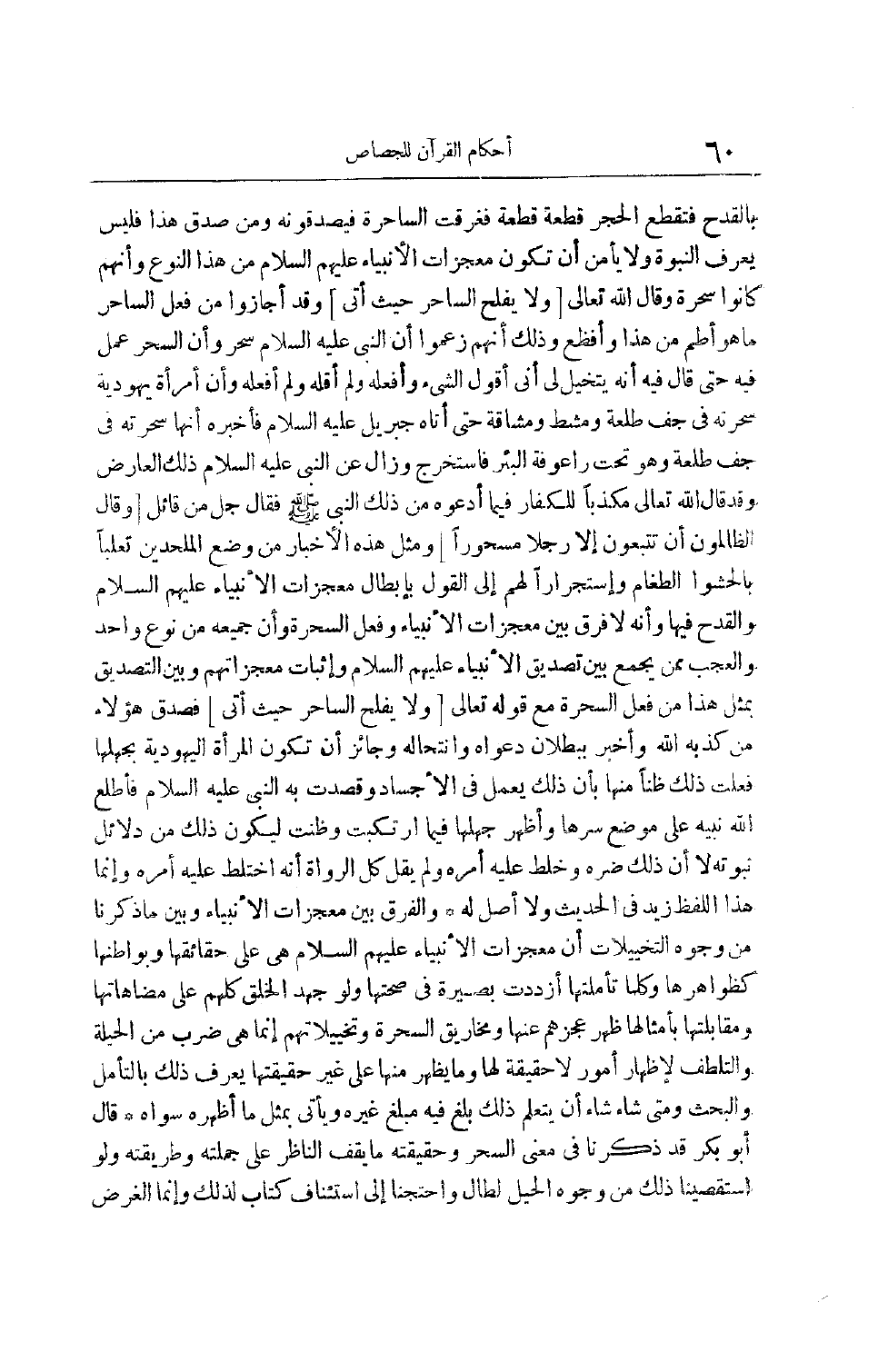 بِالْقَدَحِ فَتَقَطَّعَ الْحَجَرُ قِطْعَةً قِطْعَةً فَغَرِقَتْ السَّاحِرَةُ فَيُصَدِّقُونَهُ وَمَنْ صَدَّقَ هَذَا فَلَيْسَ يَعْرِفُ النُّبُوَّةَ ولا يأمن أَنْ تَكُونَ مُعْجِزَاتُ الْأَنْبِيَاءِ عَلَيْهِمْ السَّلَامُ مِنْ هَذَا النَّوْعِ وَأَنَّهُمْ كَانُوا سَحَرَةً وَقَالَ اللَّهُ تعالى [وَلا يُفْلِحُ السَّاحِرُ حَيْثُ أَتى] وَقَدْ أَجَازُوا مِنْ فِعْلِ السَّاحِرِ مَا هُوَ أَطَمُّ مِنْ هَذَا وَأَفْظَعُ وَذَلِكَ أَنَّهُمْ زَعَمُوا أَنَّ النَّبِيَّ عَلَيْهِ السَّلَامُ سُحِرَ وَأَنَّ السِّحْرَ عَمِلَ فِيهِ حَتَّى قَالَ فِيهِ إنَّهُ يُتَخَيَّلُ لِي أَنِّي أَقُولُ الشَّيْءَ وَأَفْعَلُهُ وَلَمْ أَقُلْهُ وَلَمْ أَفْعَلْهُ وَأَنَّ امْرَأَةً يَهُودِيَّةً سَحَرْته فِي جُفِّ طَلْعَةٍ وَمُشْطٍ وَمُشَاقَةٍ حَتَّى أَتَاهُ جِبْرِيلُ عَلَيْهِ السَّلَامُ فَأَخْبَرَهُ أَنَّهَا سَحَرَتْهُ فِي جُفِّ طَلْعَةٍ وَهُوَ تَحْتَ رَاعُوفَةِ الْبِئْرِ فَاسْتُخْرِجَ وَزَالَ عَنْ النَّبِيِّ عَلَيْهِ السَّلَامُ ذَلِكَ الْعَارِضُ وَقَدْ قَالَ اللَّهُ تَعَالَى مُكَذِّبًا لِلْكُفَّارِ فِيمَا ادَّعَوْهُ من ذَلِكَ النَّبِيَّ صَلَّى اللَّهُ عَلَيْهِ وَسَلَّمَ فَقَالَ جَلَّ مِنْ قَائِلٍ [وَقالَ الظَّالِمُونَ إِنْ تَتَّبِعُونَ إِلَّا رَجُلًا مَسْحُوراً] ومثل هذه الأخبار من وضع الملحدين تعليا بالحشوا الطَّغَامِ وَاسْتِجْرَارًا لَهُمْ إلَى الْقَوْلِ بِإِبْطَالِ مُعْجِزَاتِ الْأَنْبِيَاءِ عَلَيْهِمْ السَّلَامُ وَالْقَدْحِ فِيهَا وَأَنَّهُ لَا فَرْقَ بَيْنَ مُعْجِزَات الْأَنْبِيَاءِ وَفِعْلِ السَّحَرَةِ وَأَنَّ جَمِيعَهُ مِنْ نَوْعٍ وَاحِدٍ وَالْعَجَبُ مِمَّنْ يَجْمَعُ بَيْنَ تَصْدِيقِ الْأَنْبِيَاءِ عَلَيْهِمْ السَّلَامُ وَإِثْبَاتِ مُعْجِزَاتِهِمْ وَبَيْنَ التَّصْدِيقِ بِمِثْلِ هَذَا مِنْ فِعْلِ السَّحَرَةِ مَعَ قَوْله تَعَالَى [وَلا يُفْلِحُ السَّاحِرُ حَيْثُ أَتى] فَصَدَّقَ هَؤُلَاءِ مَنْ كَذَّبَهُ اللَّهُ وَأَخْبَرَ بِبُطْلَانِ دَعْوَاهُ وَانْتِحَالِهِ وَجَائِزٌ أَنْ تَكُونَ الْمَرْأَةُ الْيَهُودِيَّةُ بِجَهْلِهَا فَعَلَتْ ذَلِكَ ظَنًّا مِنْهَا بِأَنَّ ذَلِكَ يَعْمَلُ فِي الْأَجْسَادِ وَقَصَدَتْ بِهِ النَّبِيَّ عَلَيْهِ السَّلَامُ فَأَطْلَعَ اللَّهُ نَبِيَّهُ عَلَى مَوْضِعِ سِرِّهَا وَأَظْهَرَ جَهْلَهَا فِيمَا ارْتَكَبَتْ وَظَنَّتْ لِيَكُونَ ذَلِكَ من دلائل نبوته لا أن ذَلِكَ ضَرَّهُ وَخَلَطَ عَلَيْهِ أَمْرَهُ وَلَمْ يَقُلْ كُلُّ الرُّوَاةِ إنَّهُ اخْتَلَطَ عَلَيْهِ أَمْرُهُ وَإِنَّمَا هَذَا اللَّفْظُ زِيدَ فِي الْحَدِيثِ وَلَا أَصْلَ لَهُ وَالْفَرْقُ بَيْنَ مُعْجِزَاتِ الْأَنْبِيَاءِ وَبَيْنَ مَا ذَكَرْنَا مِنْ وُجُوهِ التَّخْيِيلَاتِ أَنَّ مُعْجِزَاتِ الْأَنْبِيَاءِ عَلَيْهِمْ السَّلَامُ هِيَ عَلَى حَقَائِقِهَا وَبَوَاطِنُهَا كَظَوَاهِرِهَا وَكُلَّمَا تَأَمَّلْتهَا ازْدَدْت بَصِيرَةً فِي صِحَّتِهَا وَلَوْ جَهَدَ الْخَلْقُ كُلُّهُمْ عَلَى مُضَاهَاتِهَا وَمُقَابِلَتِهَا بِأَمْثَالِهَا ظَهَرَ عَجْزُهُمْ عَنْهَا وَمَخَارِيقُ السَّحَرَةِ وَتَخْيِيلَاتُهُمْ إنَّمَا هِيَ ضَرْبٌ مِنْ الْحِيلَةِ وَالتَّلَطُّفِ لِإِظْهَارِ أُمُورٍ لَا حَقِيقَةَ لَهَا وَمَا يَظْهَرُ مِنْهَا عَلَى غَيْرِ حَقِيقَتِهَا يُعْرَفُ ذَلِكَ بِالتَّأَمُّلِ وَالْبَحْثِ وَمَتَى شاء شَاءَ أَنْ يَتَعَلَّمَ ذَلِكَ بَلَغَ فِيهِ مَبْلَغَ غَيْرِهِ وَيَأْتِي بِمِثْلِ مَا أَظْهَرَهُ سِوَاهُ قَالَ أَبُو بَكْرٍ قَدْ ذَكَرْنَا فِي مَعْنَى السِّحْرِ وَحَقِيقَتِهِ مَا يَقِفُ النَّاظِرُ عَلَى جُمْلَتِهِ وَطَرِيقَتِهِ وَلَوْ اسْتَقْصَيْنَا ذَلِكَ مِنْ وُجُوهِ الْحِيَلِ لَطَالَ وَاحْتَجْنَا إلَى اسْتِئْنَافِ كِتَابٍ 