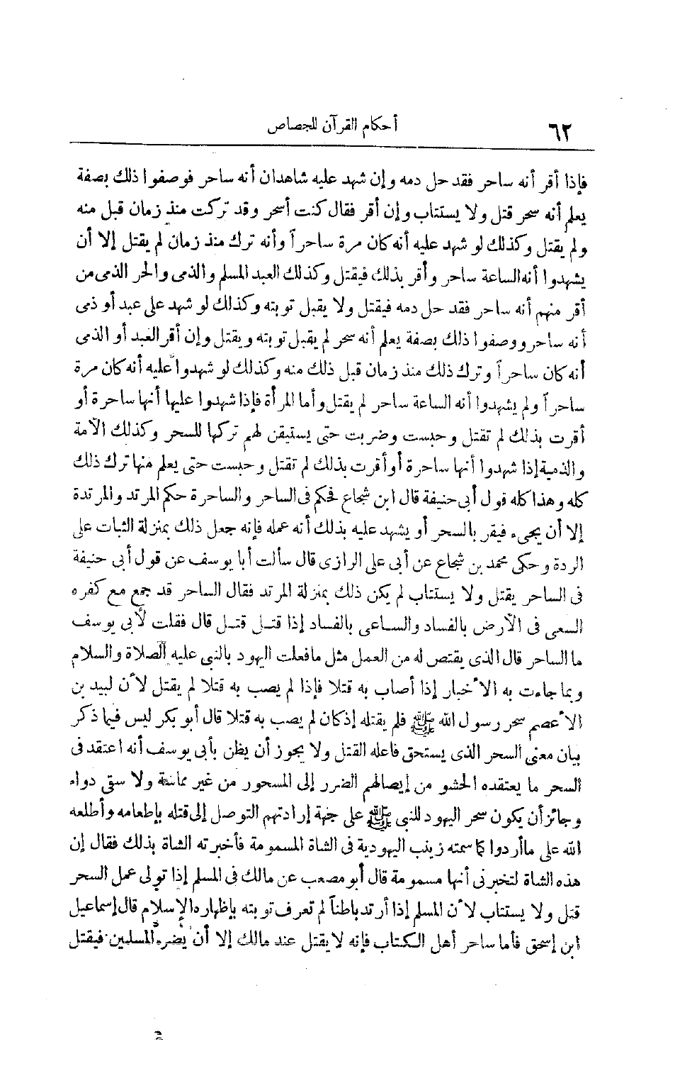 فَإِذَا أَقَرَّ أَنَّهُ سَاحِرٌ فَقَدْ حَلَّ دَمُهُ وَإِنْ شَهِدَ عَلَيْهِ شَاهِدَانِ أَنَّهُ سَاحِرٌ فَوَصَفُوا ذَلِكَ بِصِفَةٍ يُعْلَمُ أَنَّهُ سِحْرٌ قُتِلَ وَلَا يُسْتَتَابُ وَإِنَّ أَقَرَّ فَقَالَ كُنْت أَسْحَرُ وَقَدْ تَرَكْت مُنْذُ زَمَانٍ قُبِلَ مِنْهُ وَلَمْ يُقْتَلْ وَكَذَلِكَ لَوْ شَهِدَ عَلَيْهِ أَنَّهُ كَانَ مَرَّةً سَاحِرًا وَأَنَّهُ تَرَكَ مُنْذُ زَمَانٍ لَمْ يُقْتَلْ إلَّا أَنْ يَشْهَدُوا أَنَّهُ السَّاعَةَ سَاحِرٌ وَأَقَرَّ بِذَلِكَ فَيُقْتَلُ وَكَذَلِكَ الْعَبْدُ الْمُسْلِمُ وَالذِّمِّيُّ وَالْحُرُّ الذِّمِّيُّ مَنْ أَقَرَّ مِنْهُمْ أَنَّهُ سَاحِرٌ فَقَدْ حَلَّ دَمُهُ فَيُقْتَلُ وَلَا يُقْبَلُ تَوْبَتُهُ وَكَذَلِكَ لَوْ شُهِدَ عَلَى عَبْدٍ أَوْ ذِمِّيٍّ أَنَّهُ سَاحِرٌ وَوَصَفُوا ذَلِكَ بِصِفَةِ يُعْلَمُ أَنَّهُ سِحْرٌ لم يقبل تَوْبَتُهُ وَيَقْتُل وَإِنْ أَقَرَّ الْعَبْدُ أَوْ الذِّمِّيُّ أَنَّهُ كَانَ سَاحِرًا وَتَرَكَ ذَلِكَ مُنْذُ زَمَانٍ قبل ذلك منه وَكَذَلِكَ لَوْ شَهِدُوا عَلَيْهِ أَنَّهُ كَانَ مَرَّةً سَاحِرًا وَلَمْ يَشْهَدُوا أَنَّهُ السَّاعَةَ سَاحِرٌ لَمْ يُقْتَلْ وَأَمَّا الْمَرْأَةُ فَإِذَا شَهِدُوا عَلَيْهَا أَنَّهَا سَاحِرَةٌ أَوْ أَقَرَّتْ بِذَلِكَ لَمْ تُقْتَلْ وَحُبِسَتْ وَضُرِبَتْ حَتَّى يَسْتَيْقِنَ لَهُمْ تَرْكُهَا لِلسِّحْرِ وَكَذَلِكَ الْأَمَةُ وَالذِّمِّيَّةُ إذَا شَهِدُوا أَنَّهَا سَاحِرَةٌ أَوْ أَقَرَّتْ بِذَلِكَ لَمْ تُقْتَلْ وَحُبِسَتْ حَتَّى يُعْلَمَ مِنْهَا تَرْكُ ذَلِكَ كُلِّهِ وَهَذَا كُلُّهُ قَوْلُ أَبِي حَنِيفَةَ قَالَ ابْنُ شُجَاعٍ فَحَكَمَ فِي السَّاحِرِ وَالسَّاحِرَةِ حُكْمَ الْمُرْتَدِّ وَالْمُرْتَدَّةِ إلَّا أَنْ يَجِيءَ فَيُقِرَّ بِالسِّحْرِ أَوْ يُشْهَدَ عَلَيْهِ بِذَلِكَ أَنَّهُ عَمِلَهُ فَإِنَّهُ جَعَلَ ذَلِكَ بِمَنْزِلَةِ الثَّبَاتِ عَلَى الرِّدَّةِ وَحَكَى مُحَمَّدُ بْنُ شُجَاعٍ عَنْ أَبِي عَلِيٍّ الرَّازِيّ قَالَ سَأَلْت أَبَا يُوسُفَ عَنْ قَوْلِ أَبِي حَنِيفَةَ فِي السَّاحِرِ يُقْتَلُ ولا يستتاب لَمْ يَكُنْ ذَلِكَ بِمَنْزِلَةِ الْمُرْتَدِّ فَقَالَ السَّاحِرُ قَدْ جَمَعَ مَعَ كُفْرِهِ السَّعْيَ فِي الْأَرْضِ بِالْفَسَادِ وَالسَّاعِي بِالْفَسَادِ إذَا قَتَلَ قُتِلَ قَالَ فَقُلْت لِأَبِي يُوسُفَ مَا السَّاحِرُ قَالَ الَّذِي يُقْتَصُّ لَهُ مِنْ الْعَمَلِ مِثْلُ مَا فَعَلَتْ الْيَهُودُ بِالنَّبِيِّ عَلَيْهِ الصَّلَاةُ وَالسَّلَامُ وَبِمَا جَاءَتْ بِهِ الْأَخْبَارُ إذَا أَصَابَ بِهِ قَتْلًا فَإِذَا لَمْ يُصِبْ بِهِ قَتْلًا لَمْ يُقْتَلْ لِأَنَّ لَبِيدَ بْنَ الْأَعْصَمِ سَحَرَ رَسُولَ اللَّهِ صَلَّى اللَّهُ عَلَيْهِ وَسَلَّمَ فَلَمْ يَقْتُلْهُ إذْ كَانَ لَمْ يُصِبْ بِهِ قَتْلًا قَالَ أَبُو بَكْرٍ لَيْسَ فِيمَا ذَكَرَ بَيَانُ مَعْنَى السِّحْرِ الَّذِي يَسْتَحِقُّ فَاعِلُهُ الْقَتْلَ وَلَا يَجُوزُ أَنْ يُظَنَّ بِأَبِي يُوسُفَ أَنَّهُ اعْتَقَدَ فِي السِّحْرِ مَا يَعْتَقِدُهُ الْحَشْوُ مِنْ إيصَالِهِمْ الضَّرَرَ إلَى الْمَسْحُورِ مِنْ غَيْرِ مُمَاسَّةٍ وَلَا سَقْيِ دَوَاءٍ وَجَائِزٌ أن يكون سحر اليهود للنبي صلّى الله عليه وسلم عَلَى جِهَةِ إرَادَتِهِمْ التَّوَصُّلَ إلَى قَتْلِهِ بِإِطْعَامِهِ وأطلعه الله على ما أردوا كَمَا سَمَّتْهُ زَيْنَبُ الْيَهُودِيَّةُ فِي الشَّاةِ الْمَسْمُومَةِ فَأَخْبَرَتْهُ الشَّاةُ بِذَلِكَ فَقَالَ إنَّ هَذِهِ الشَّاةَ لَتُخْبِرُنِي أَنَّهَا مَسْمُومَةٌ قَالَ أَبُو مُصْعَبٍ عَنْ مَالِكٍ فِي الْمُسْلِمِ إذَا تَوَلَّى عَمَلَ السِّحْرِ قُتِلَ وَلَا يُسْتَتَابُ لِأَنَّ الْمُسْلِمَ إذَا ارْتَدَّ بَاطِنًا لَمْ تُعْرَفْ تَوْبَتُهُ بِإِظْهَارِهِ الْإِسْلَامَ قَالَ إس