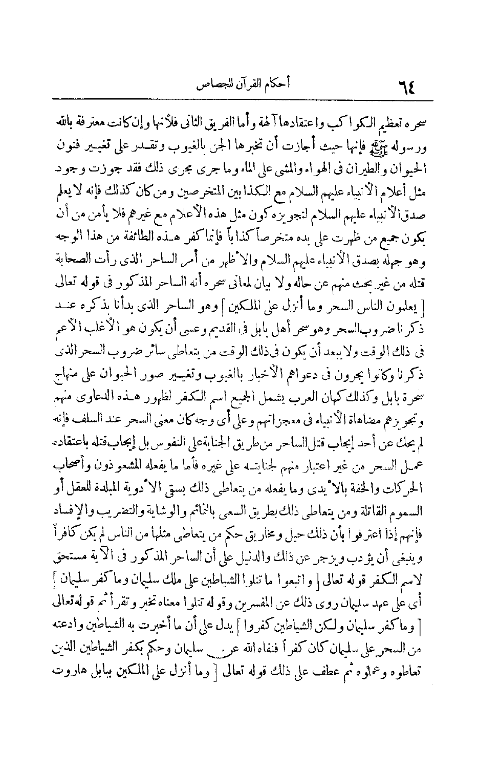 سِحْرِهِ تَعْظِيمَ الْكَوَاكِبِ وَاعْتِقَادَهَا آلِهَةً وَأَمَّا الْفَرِيقُ الثَّانِي فَلِأَنَّهَا وَإِنْ كَانَتْ مُعْتَرِفَةً بِاَللَّهِ وَرَسُولِهِ صَلَّى اللَّهُ عَلَيْهِ وَسَلَّمَ فَإِنَّهَا حَيْثُ أَجَازَتْ أَنْ تُخْبِرَهَا الْجِنُّ بِالْغُيُوبِ وَتَقْدِرُ عَلَى تَغْيِيرِ فُنُونِ الْحَيَوَانِ وَالطَّيَرَانِ فِي الْهَوَاءِ وَالْمَشْيِ عَلَى الْمَاءِ وَمَا جَرَى مَجْرَى ذَلِكَ فَقَدْ جَوَّزَتْ وُجُودَ مِثْلِ أَعْلَامِ الْأَنْبِيَاءِ عَلَيْهِمْ السَّلَامُ مَعَ الْكَذَّابِينَ الْمُتَخَرِّصَيْنِ وَمَنْ كَانَ كَذَلِكَ فَإِنَّهُ لَا يَعْلَمُ صِدْقَ الْأَنْبِيَاءِ عَلَيْهِمْ السَّلَامُ لِتَجْوِيزِهِ كَوْنَ مِثْلِ هَذِهِ الْأَعْلَامِ مَعَ غَيْرِهِمْ فَلَا يَأْمَنُ من أَنْ يَكُونَ جَمِيعُ مَنْ ظَهَرَتْ عَلَى يَدِهِ مُتَخَرِّصًا كَذَّابًا فَإِنَّمَا كُفْرُ هَذِهِ الطَّائِفَةِ مِنْ هَذَا الْوَجْهِ وَهُوَ جَهْلُهُ بِصِدْقِ الْأَنْبِيَاءِ عَلَيْهِمْ السَّلَامُ وَالْأَظْهَرُ مِنْ أَمْرِ السَّاحِرِ الَّذِي رَأَتْ الصَّحَابَةُ قَتْلَهُ مِنْ غَيْرِ بَحْثٍ مِنْهُمْ عَنْ حَالِهِ وَلَا بَيَانٍ لِمَعَانِي سِحْرِهِ أَنَّهُ السَّاحِرُ الْمَذْكُورُ فِي قَوْله تَعَالَى [يُعَلِّمُونَ النَّاسَ السِّحْرَ وَما أُنْزِلَ عَلَى الْمَلَكَيْنِ] وَهُوَ السَّاحِرُ الَّذِي بَدَأْنَا بِذِكْرِهِ عِنْدَ ذِكْرِنَا ضُرُوبَ السِّحْرِ وَهُوَ سِحْرُ أَهْلِ بَابِلَ فِي الْقَدِيمِ وَعَسَى أَنْ يَكُونَ هُوَ الْأَغْلَبَ الْأَعَمَّ فِي ذَلِكَ الْوَقْتِ وَلَا يَبْعُدُ أَنْ يَكُونَ فِي ذَلِكَ الْوَقْتِ مَنْ يَتَعَاطَى سَائِرَ ضُرُوبِ السَّحَر الَّذِي ذَكَرْنَا وَكَانُوا يَجْرُونَ فِي دَعْوَاهُمْ الْإِخْبَارَ بِالْغُيُوبِ وَتَغْيِيرِ صُوَرِ الْحَيَوَانِ عَلَى مِنْهَاجِ سَحَرَةِ بَابِلَ وَكَذَلِكَ كُهَّانُ الْعَرَبِ يَشْمَلُ الْجَمِيعَ اسْمُ الْكُفْرِ لِظُهُورِ هَذِهِ الدَّعَاوَى مِنْهُمْ وَتَجْوِيزِهِمْ مُضَاهَاةِ الْأَنْبِيَاءِ فِي مُعْجِزَاتِهِمْ وَعَلَى أَيِّ وَجْهٍ كَانَ مَعْنَى السِّحْرِ عِنْدَ السَّلَفِ فَإِنَّهُ لَمْ يُحْكَ عَنْ أَحَدٍ إيجَابُ قَتْلِ السَّاحِرِ مِنْ طَرِيقِ الْجِنَايَةِ عَلَى النُّفُوسِ بَلْ إيجَابُ قَتْلِهِ بِاعْتِقَادِهِ عَمَلَ السِّحْرِ مِنْ غَيْرِ اعْتِبَارٍ مِنْهُمْ لِجِنَايَتِهِ عَلَى غَيْرِهِ فَأَمَّا مَا يَفْعَلُهُ الْمُشَعْوِذُونَ وَأَصْحَابُ الْحَرَكَاتِ وَالْخِفَّةِ بِالْأَيْدِي وَمَا يَفْعَلُهُ مَنْ يَتَعَاطَى ذَلِكَ بِسَقْيِ الْأَدْوِيَةِ الْمُبَلِّدَةِ لِلْعَقْلِ أَوْ السُّمُومِ الْقَاتِلَةِ وَمَنْ يَتَعَاطَى ذَلِكَ بِطَرِيقِ السَّعْيِ بِالنَّمَائِمِ وَالْوِشَايَةِ وَالتَّضْرِيبِ وَالْإِفْسَادِ فَإِنَّهُمْ إذَا اعْتَرَفُوا بِأَنَّ ذَلِكَ حِيَلٌ وَمَخَارِيقُ حُكْمُ مَنْ يَتَعَاطَى مِثْلَهَا مِنْ النَّاس لَمْ يَكُنْ كَافِرًا وَيَنْبَغِي أَنْ يُؤَدَّبَ وَيُزْجَرَ عَنْ ذَلِكَ وَالدَّلِيلُ عَلَى أَنَّ السَّاحِرَ الْمَذْكُورَ فِي الْآيَةِ مُسْتَحِقٌّ لِاسْمِ الكفر قوله تعالى [وَاتَّبَعُوا ما تَتْلُوا الشَّياطِينُ عَلى مُلْكِ سُلَيْمانَ وَما كَفَرَ سُلَيْمانُ] أَيْ عَلَى عَهْدِ سُلَيْمَانَ رُوِيَ ذَلِكَ عَنْ المفسرين وقوله تتلوا مَعْنَاهُ تُخْبِرُ وَتَقْرَأُ ثُمَّ قَوْله تَعَالَى [وَما كَفَرَ سُلَيْمانُ وَلكِنَّ الشَّياطِينَ كَفَرُوا] يَدُلُّ عَلَى أَنَّ مَا أَخْبَرَتْ بِهِ الشَّيَاطِينُ وَادَّعَتْهُ مِنْ السِّحْرِ عَلَى سُلَيْمَانَ كَانَ كُفْرًا فَنَفَاهُ اللَّهُ عَنْ سُلَيْمَانَ وَحَكَمَ بِكُفْرِ الشَّيَاطِينِ الَّذِينَ تَعَاطَوْهُ وَعَمِلُوهُ ثُمَّ عَطَفَ عَلَى ذَلِكَ قَوْله تَعَالَى [وَما أُنْزِلَ عَلَى الْمَلَكَيْنِ بِبابِلَ هارُوتَ