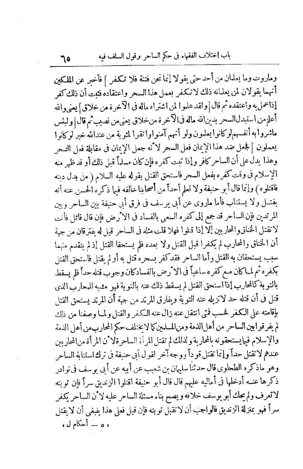 وَإِنَّمَا قَالَ أَبُو حَنِيفَةَ وَلَا نَعْلَمُ أَحَدًا مِنْ أَصْحَابِنَا خَالَفَهُ فِيمَا ذَكَرَهُ الْحَسَنُ عَنْهُ إنَّهُ يُقْتَلُ وَلَا يُسْتَتَابُ فَأَمَّا مَا رُوِيَ عَنْ أَبِي يُوسُفَ فِي فَرْقِ أَبِي حَنِيفَةَ بَيْنَ السَّاحِرِ وَبَيْنَ الْمُرْتَدِّينَ فَإِنَّ السَّاحِرَ قَدْ جَمَعَ إلَى كُفْرِهِ السَّعْيَ بِالْفَسَادِ فِي الْأَرْضِ فَإِنْ قَالَ قَائِلُ فَأَنْتَ لَا تَقْتُلُ الْخُنَّاقَ وَالْمُحَارِبِينَ إلَّا إذَا قَتَلُوا فَهَلَّا قُلْتَ مِثْلَهُ فِي السَّاحِرِ قِيلَ لَهُ يَفْتَرِقَانِ مِنْ جِهَةِ أَنَّ الْخَنَّاقَ وَالْمُحَارِبَ لَمْ يَكْفُرَا قَبْلَ الْقَتْلِ وَلَا بَعْدَهُ فَلَمْ يَسْتَحِقَّا الْقَتْلَ إذْ لَمْ يَتَقَدَّمْ مِنْهُمَا سَبَبٌ يَسْتَحِقَّانِ بِهِ الْقَتْلَ وَأَمَّا السَّاحِرُ فَقَدْ كَفَرَ بِسِحْرِهِ قَتَلَ بِهِ أَوْ لَمْ يَقْتُلْ فَاسْتَحَقَّ الْقَتْلَ بِكُفْرِهِ ثُمَّ لَمَّا كَانَ مَعَ كُفْرِهِ سَاعِيًا فِي الْأَرْضِ بِالْفَسَادِ كَانَ وُجُوبُ قَتْلِهِ حَدًّا فَلَمْ يَسْقُطْ بِالتَّوْبَةِ كَالْمُحَارِبِ إذَا اسْتَحَقَّ الْقَتْلَ لَمْ يَسْقُطْ ذَلِكَ عَنْهُ بِالتَّوْبَةِ فَهُوَ مُشْبِهٌ لِلْمُحَارِبِ الَّذِي قَتَلَ فِي أَنَّ قَتْلَهُ حد لَا تُزِيلُهُ عَنْهُ التَّوْبَةُ وَيُفَارِقَ الْمُرْتَدَّ مِنْ جِهَةِ أَنَّ الْمُرْتَدَّ يَسْتَحِقُّ الْقَتْلَ بِإِقَامَتِهِ عَلَى الْكُفْرِ فَحَسْبُ فَمَتَى انْتَقَلَ عَنْهُ زَالَ عَنْهُ الْكُفْرُ وَالْقَتْلُ وَلِمَا وَصَفْنَا مِنْ ذَلِكَ لَمْ يُفَرِّقُوا بَيْنَ السَّاحِرِ مِنْ أَهْلِ الذِّمَّةِ وَمِنْ الْمُسْلِمِينَ كَمَا لَا يَخْتَلِفُ حُكْمُ الْمُحَارِبِ مِنْ أَهْلِ الذِّمَّةِ وَالْإِسْلَامِ فِيمَا يَسْتَحِقُّونَهُ بِالْمُحَارَبَةِ وَلِذَلِكَ لَمْ تُقْتَلْ الْمَرْأَةُ السَّاحِرَةُ لِأَنَّ الْمَرْأَةَ مِنْ الْمُحَارِبِينَ عِنْدَهُمْ لَا تُقْتَلُ حَدًّا وَإِنَّمَا تُقْتَلُ قَوَدًا وَوَجْهٌ آخَرُ لِقَوْلِ أَبِي حَنِيفَةَ فِي تَرْكِ اسْتِتَابَةِ السَّاحِرِ وَهُوَ مَا ذَكَرَهُ الطَّحَاوِيُّ قَالَ حَدَّثَنَا سُلَيْمَانُ بْنُ شُعَيْبٍ عَنْ أَبِيهِ عَنْ أَبِي يُوسُف فِي نَوَادِرَ ذَكَرَهَا عَنْهُ أَدْخَلَهَا فِي أَمَالِيهِ عَلَيْهِمْ قَالَ قَالَ أَبُو حَنِيفَةَ اُقْتُلُوا الزِّنْدِيقَ سِرًّا فَإِنَّ تَوْبَتَهُ لَا تُعْرَفُ وَلَمْ يَحْكِ أَبُو يُوسُف خِلَافَهُ وَيَصِحُّ بِنَاءُ مَسْأَلَةِ السَّاحِرِ عَلَيْهِ لِأَنَّ السَّاحِرَ يَكْفُرُ سِرًّا فَهُوَ بِمَنْزِلَةِ الزِّنْدِيقِ فَالْوَاجِبُ أَنْ لَا تُقْبَلَ تَوْبَتُهُ فَإِنْ قِيلَ فَعَلَى هَذَا يَنْبَغِي أَنْ لَا يُقْتَلَ