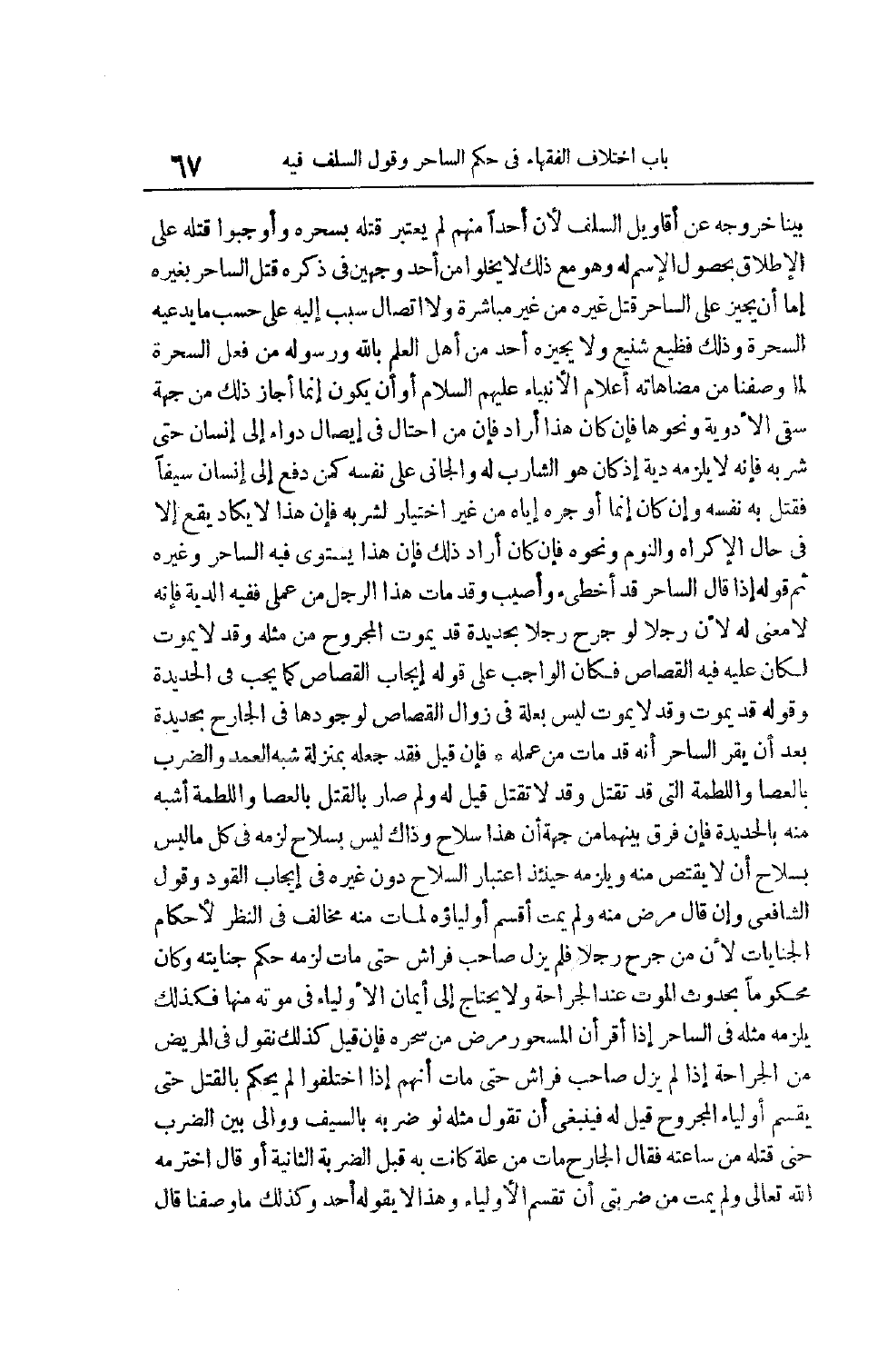 بَيَّنَّا خُرُوجَهُ عَنْ أَقَاوِيلِ السَّلَفِ لِأَنَّ أَحَدًا مِنْهُمْ لَمْ يَعْتَبِرْ قَتْلَهُ بِسِحْرِهِ وَأَوْجَبُوا قَتْلَهُ عَلَى الْإِطْلَاقِ بِحُصُولِ الِاسْمِ لَهُ وَهُوَ مَعَ ذلك لا يخلوا مِنْ أَحَدِ وَجْهَيْنِ فِي ذِكْرِهِ قَتْلَ السَّاحِرِ بِغَيْرِهِ إمَّا أَنْ يُجِيزَ عَلَى السَّاحِرِ قَتْلَ غَيْرِهِ مِنْ غَيْرِ مُبَاشَرَةٍ وَلَا اتِّصَالِ سَبَبٍ إلَيْهِ عَلَى حَسَبِ مَا يَدَّعِيهِ السَّحَرَةُ وَذَلِكَ فَظِيعٌ شَنِيعٌ وَلَا يُجِيزُهُ أَحَدٌ مِنْ أَهْلِ الْعِلْمِ بِاَللَّهِ وَرَسُولِهِ مِنْ فِعْلِ السَّحَرَةِ لِمَا وَصَفْنَا مِنْ مُضَاهَاتِهِ أَعْلَامَ الْأَنْبِيَاءِ عَلَيْهِمْ السَّلَامُ أَوْ أَنْ يَكُونَ إنَّمَا أَجَازَ ذَلِكَ مِنْ جِهَةِ سَقْيِ الْأَدْوِيَةِ وَنَحْوِهَا فَإِنْ كَانَ هَذَا أَرَادَ فَإِنَّ مِنْ احْتَالَ فِي إيصَالِ دَوَاءٍ إلَى إنْسَانٍ حَتَّى شَرِبَهُ فَإِنَّهُ لَا يَلْزَمُهُ دِيَةٌ إذْ كَانَ هُوَ الشَّارِبَ لَهُ وَالْجَانِيَ عَلَى نَفْسِهِ كَمَنْ دَفَعَ إلَى إنْسَانٍ سَيْفًا فقتل به نفسه وإن كان إنما أو جره إيَّاهُ مِنْ غَيْرِ اخْتِيَارٍ لِشُرْبِهِ فَإِنَّ هَذَا لَا يَكَادُ يَقَعُ إلَّا فِي حَالِ الْإِكْرَاهِ وَالنَّوْمِ وَنَحْوِهِ فَإِنْ كَانَ أَرَادَ ذَلِكَ فَإِنَّ هَذَا يَسْتَوِي فِيهِ السَّاحِرُ وَغَيْرُهُ ثُمَّ قَوْلُهُ إذَا قَالَ السَّاحِرُ قَدْ أُخْطِئُ وَأُصِيبُ وَقَدْ مَاتَ هَذَا الرَّجُلُ مِنْ عَمَلِي فَفِيهِ الدِّيَةُ فَإِنَّهُ لَا مَعْنَى لَهُ لِأَنَّ رَجُلًا لَوْ جَرَحَ رَجُلًا بِحَدِيدَةِ قَدْ يَمُوتُ الْمَجْرُوحُ مِنْ مِثْلِهِ وَقَدْ لَا يَمُوتُ لَكَانَ عَلَيْهِ فِيهِ الْقِصَاصُ فَكَانَ الْوَاجِبُ عَلَى قَوْلِهِ إيجَابَ الْقِصَاصِ كَمَا يَجِبُ فِي الْحَدِيدَةِ وَقَوْلُهُ قَدْ يَمُوتُ وَقَدْ لَا يَمُوتُ لَيْسَ بِعِلَّةٍ فِي زَوَالِ الْقِصَاصِ لِوُجُودِهَا فِي الْجَارِحِ بِحَدِيدَةٍ بَعْدَ أَنْ يُقِرَّ السَّاحِرُ أَنَّهُ قَدْ مَاتَ مِنْ عَمَلِهِ فَإِنْ قِيلَ فَقَدْ جَعَلَهُ بِمَنْزِلَةِ شِبْهِ الْعَمْدِ وَالضَّرْبِ بِالْعَصَا وَاللَّطْمَةِ الَّتِي قَدْ تَقْتُلُ وَقَدْ لَا تَقْتُلُ قِيلَ لَهُ وَلِمَ صَارَ بِالْقَتْلِ بِالْعَصَا وَاللَّطْمَةِ أَشْبَهَ مِنْهُ بِالْحَدِيدَةِ فَإِنْ فَرَّقَ بَيْنَهُمَا مِنْ جِهَةِ أَنَّ هَذَا سِلَاحٌ وَذَاكَ لَيْسَ بِسِلَاحِ لَزِمَهُ فِي كُلِّ مَا لَيْسَ بِسِلَاحِ أَنْ لَا يُقْتَصَّ مِنْهُ وَيَلْزَمُهُ حِينَئِذٍ اعْتِبَارُ السِّلَاحِ دُونَ غَيْرِهِ فِي إيجَابِ الْقَوَدِ وَقَوْلُ الشَّافِعِيِّ وَإِنْ قَالَ مَرِضَ مِنْهُ وَلَمْ يَمُتْ أَقْسَمَ أَوْلِيَاؤُهُ لَمَاتَ مِنْهُ مُخَالِفٌ فِي النَّظَرِ لِأَحْكَامِ الْجِنَايَاتِ لِأَنَّ مَنْ جَرَحَ رَجُلًا فَلَمْ يَزَلْ صَاحِبَ فِرَاشٍ حَتَّى مَاتَ لَزِمَهُ حُكْمُ جِنَايَتِهِ وَكَانَ مَحْكُومًا بِحُدُوثِ الْمَوْتِ عِنْدَ الْجِرَاحَةِ وَلَا يُحْتَاجُ إلَى أَيْمَانِ الْأَوْلِيَاءِ فِي مَوْتِهِ مِنْهَا فَكَذَلِكَ يَلْزَمُهُ مِثْلُهُ فِي السَّاحِرِ إذَا أَقَرَّ أَنَّ الْمَسْحُورَ مَرِضَ مِنْ سِحْرِهِ فَإِنْ قِيلَ كَذَلِكَ نَقُولُ فِي الْمَرِيضِ مِنْ الْجِرَاحَةِ إذَا لَمْ يَزَلْ صَاحِبَ فِرَاشٍ حَتَّى مَاتَ أَنَّهُمْ إذَا اخْتَلَفُوا لَمْ يُحْكَمْ بِالْقَتْلِ حَتَّى يُقْسِمَ أَوْلِيَاءُ الْمَجْرُوحِ قِيلَ لَهُ فَيَنْبَغِي أَنْ تَقُولَ مِثْلَهُ لَوْ ضَرَبَهُ بِالسَّيْفِ وَوَالَى بَيْنَ الضَّرْبِ حَتَّى قَتَلَهُ مِنْ سَاعَتِهِ فَقَالَ الْجَارِحُ مَاتَ مِنْ عِلَّةٍ كَانَتْ بِهِ قَبْلَ الضَّرْبَةِ الثَّانِيَةِ أَوْ قَالَ اخْتَرَمَهُ اللَّهُ تَعَالَى وَلَمْ يَمُتْ مِنْ ضَرْبَتِي أَنْ تُقْسِمَ الْأَوْلِيَاءُ وَهَذَا لَا يَقُولُهُ أَحَدٌ وَك