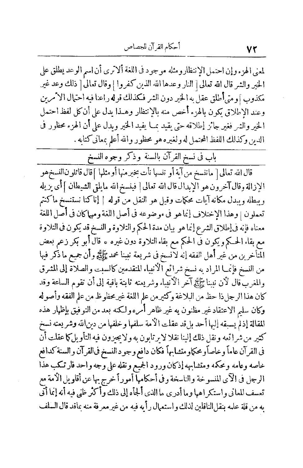 قَالَ اللَّهُ تَعَالَى [مَا نَنْسَخْ مِنْ آيَةٍ أَوْ نُنْسِها نَأْتِ بِخَيْرٍ مِنْها أَوْ مِثْلِها] قَالَ قَائِلُونَ النَّسْخُ هُوَ الْإِزَالَةُ وَقَالَ آخَرُونَ هُوَ الْإِبْدَالُ قَالَ اللَّهُ تَعَالَى [فَيَنْسَخُ اللَّهُ ما يُلْقِي الشَّيْطانُ] أَيْ يُزِيلُهُ وَيُبْطِلُهُ وَيُبَدِّلُ مَكَانَهُ آيَاتٍ مُحْكَمَاتٍ وَقِيلَ هُوَ النَّقْلُ مِنْ قَوْلِهِ [إِنَّا كُنَّا نَسْتَنْسِخُ ما كُنْتُمْ تَعْمَلُونَ] وَهَذَا الِاخْتِلَافُ إنَّمَا هُوَ فِي مَوْضُوعِهِ فِي أَصْلِ اللُّغَةِ وَمَهْمَا كَانَ فِي أَصْلِ اللُّغَةِ مَعْنَاهُ فَإِنَّهُ فِي إطْلَاقِ الشَّرْعِ إنَّمَا هُوَ بَيَانُ مُدَّةِ الْحُكْمِ وَالتِّلَاوَةِ وَالنَّسْخُ قَدْ يَكُونُ فِي التِّلَاوَةِ مَعَ بَقَاءِ الْحُكْمِ وَيَكُونُ فِي الْحُكْمِ مَعَ بَقَاءِ التِّلَاوَةِ دُونَ غَيْرِهِ قَالَ أَبُو بَكْرٍ زَعَمَ بَعْضُ الْمُتَأَخِّرِينَ مِنْ غَيْرِ أَهْلِ الْفِقْهِ أَنَّهُ لَا نَسْخَ فِي شَرِيعَةِ نَبِيّنَا مُحَمَّدٍ صَلَّى اللَّهُ عَلَيْهِ وَسَلَّمَ وَأَنَّ جَمِيعَ مَا ذُكِرَ فِيهَا مِنْ النَّسْخِ فَإِنَّمَا الْمُرَادُ بِهِ نَسْخُ شَرَائِعِ الْأَنْبِيَاءِ الْمُتَقَدِّمِينَ كَالسَّبْتِ وَالصَّلَاةِ إلَى الْمَشْرِقِ وَالْمَغْرِبِ قَالَ لِأَنَّ نَبِيَّنَا صلّى الله عليه وسلم آخِرُ الْأَنْبِيَاءِ وَشَرِيعَتَهُ ثَابِتَةٌ بَاقِيَةٌ إلَى أَنْ تَقُومَ السَّاعَةُ وَقَدْ كَانَ هَذَا الرَّجُلُ ذَا حَظٍّ مِنْ الْبَلَاغَةِ وَكَثِيرٍ مِنْ عِلْمِ اللُّغَةِ غَيْرَ مَحْظُوظٍ مِنْ عِلْمِ الْفِقْهِ وَأُصُولِهِ وَكَانَ سَلِيمَ الِاعْتِقَادِ غَيْرَ مَظْنُونٍ بِهِ غَيْرَ ظَاهِرٍ أَمْرُهُ وَلَكِنَّهُ بَعُدَ مِنْ التَّوْفِيقِ بِإِظْهَارِ هَذِهِ الْمَقَالَةِ إذْ لَمْ يَسْبِقْهُ إلَيْهَا أَحَدٌ بَلْ قَدْ عَقَلَتْ الْأُمَّةُ سَلَفَهَا وَخَلَفَهَا مِنْ دِينِ اللَّهِ وَشَرِيعَتِهِ نَسْخَ كَثِيرٍ مِنْ شَرَائِعِهِ وَنُقِلَ ذَلِكَ إلَيْنَا نَقْلًا لَا يَرْتَابُونَ بِهِ وَلَا يجيزون فيه التأويل كما عَقَلَتْ أَنَّ فِي الْقُرْآنِ عَامًّا وَخَاصًّا وَمُحْكَمًا وَمُتَشَابِهًا فَكَانَ دَافِعُ وُجُودِ النَّسْخِ فِي الْقُرْآنِ وَالسَّنَةِ كَدَافِعِ خَاصِّهِ وَعَامِّهِ وَمُحْكَمِهِ وَمُتَشَابِهِهِ إذْ كَانَ وُرُودُ الْجَمِيعِ وَنَقْلُهُ عَلَى وَجْهٍ وَاحِدٍ فَارْتَكَبَ هَذَا الرَّجُلُ فِي الْآيِ الْمَنْسُوخَةِ وَالنَّاسِخَةِ وَفِي أَحْكَامِهَا أُمُورًا خَرَجَ بِهَا عَنْ أَقَاوِيلِ الْأُمَّةِ مَعَ تَعَسُّفِ الْمَعَانِي وَاسْتِكْرَاهِهَا وَمَا أَدْرِي مَا الَّذِي أَلْجَأَهُ إلَى ذَلِكَ وَأَكْثَرُ ظَنِّي فِيهِ أَنَّهُ إنَّمَا أَتَى بِهِ مِنْ قِلَّةِ عِلْمِهِ بِنَقْلِ النَّاقِلِينَ لِذَلِكَ وَاسْتِعْمَالِ رَأْيِهِ فِيهِ مِنْ غَيْرِ مَعْرِفَةٍ مِنْهُ بِمَا قَدْ قَالَ السلف