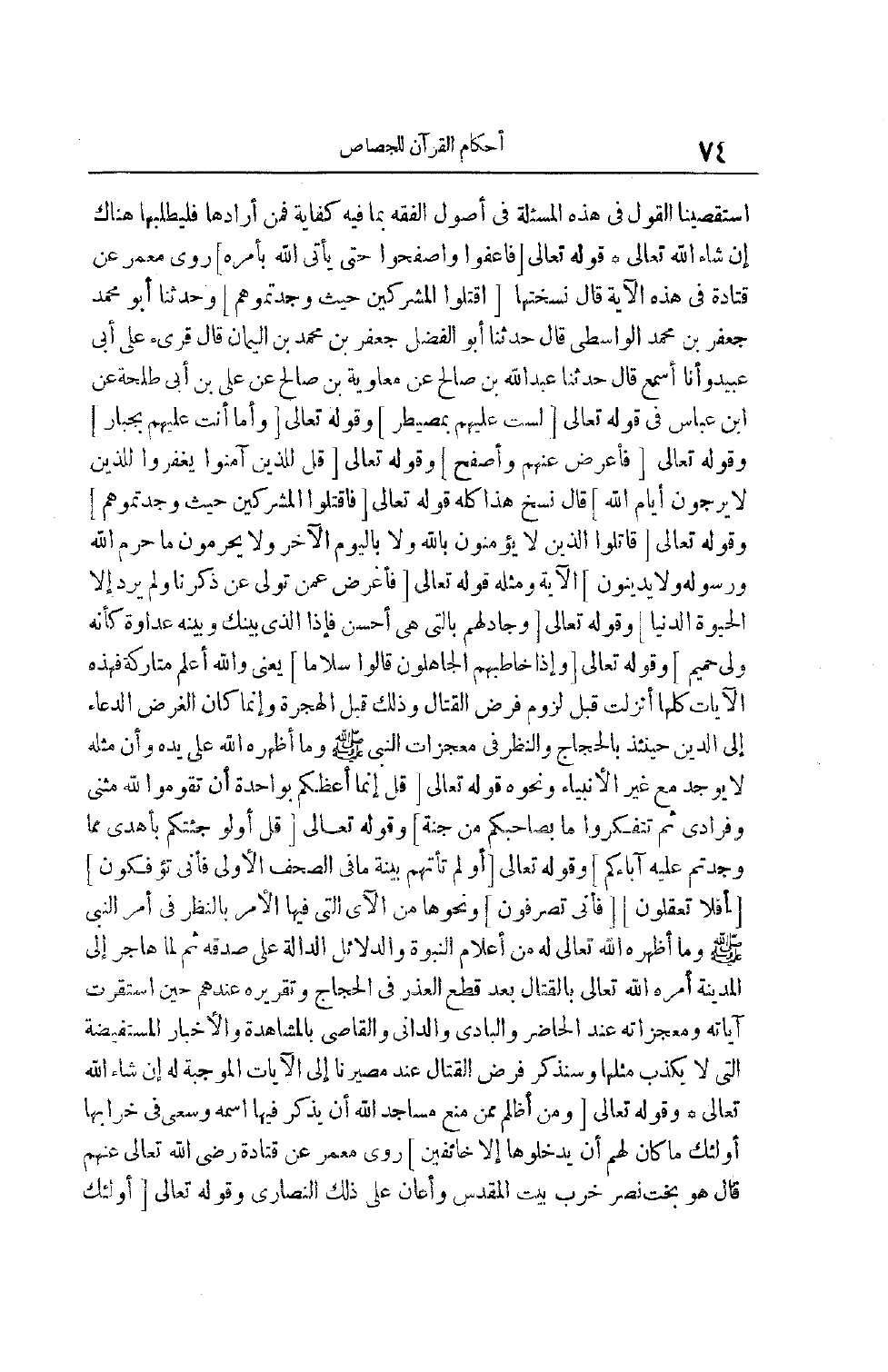 قَوْله تَعَالَى [فَاعْفُوا وَاصْفَحُوا حَتَّى يَأْتِيَ اللَّهُ بِأَمْرِهِ] رَوَى مَعْمَرٌ عَنْ قَتَادَةَ فِي هَذِهِ الْآيَةِ قال نسختها [فَاقْتُلُوا الْمُشْرِكِينَ حَيْثُ وَجَدْتُمُوهُمْ] وَحَدَّثَنَا أَبُو مُحَمَّدٍ جَعْفَرُ بْنُ مُحَمَّدٍ الْوَاسِطِيُّ قال حدثنا أبو الفضل جعفر بن محمد بْنِ الْيَمَانِ قَالَ قُرِئَ عَلَى أَبِي عُبَيْدٍ وَأَنَا أَسْمَعُ قَالَ حَدَّثَنَا عَبْدُ اللَّهِ بْنِ صَالِحٍ عَنْ مُعَاوِيَةَ بْنِ صَالِحٍ عَنْ عَلِيِّ بْنُ أَبِي طَلْحَةَ عَنْ ابْنِ عَبَّاسٍ فِي قَوْله تَعَالَى [لَسْتَ عَلَيْهِمْ بِمُصَيْطِرٍ] وقوله تعالى [وَما أَنْتَ عَلَيْهِمْ بِجَبَّارٍ] وقوله تعالى [فَاعْفُ عَنْهُمْ وَاصْفَحْ] وقَوْله تَعَالَى [قُلْ لِلَّذِينَ آمَنُوا يَغْفِرُوا لِلَّذِينَ لا يَرْجُونَ أَيَّامَ اللَّهِ] قَالَ نَسَخَ هَذَا كُلَّهُ قَوْله تَعَالَى [فَاقْتُلُوا الْمُشْرِكِينَ حَيْثُ وَجَدْتُمُوهُمْ] وقَوْله تَعَالَى [قاتِلُوا الَّذِينَ لا يُؤْمِنُونَ بِاللَّهِ وَلا بِالْيَوْمِ الْآخِرِ وَلا يُحَرِّمُونَ مَا حَرَّمَ اللَّهُ وَرَسُولُهُ وَلا يَدِينُونَ] الْآيَةُ وَمِثْلُهُ قَوْله تَعَالَى [فَأَعْرِضْ عَنْ مَنْ تَوَلَّى عَنْ ذِكْرِنا وَلَمْ يُرِدْ إِلَّا الْحَياةَ الدُّنْيا] وقوله تعالى [وَجادِلْهُمْ بِالَّتِي هِيَ أَحْسَنُ فَإِذَا الَّذِي بَيْنَكَ وَبَيْنَهُ عَداوَةٌ كَأَنَّهُ وَلِيٌّ حَمِيمٌ] وقَوْله تَعَالَى [وَإِذا خاطَبَهُمُ الْجاهِلُونَ قالُوا سَلاماً] يَعْنِي وَاَللَّهُ أَعْلَمُ مُتَارَكَةً فَهَذِهِ الْآيَاتُ كُلُّهَا أُنْزِلَتْ قَبْلَ لُزُومِ فَرْضِ الْقِتَالِ وَذَلِكَ قَبْلَ الْهِجْرَةِ وَإِنَّمَا كَانَ الْغَرَضُ الدُّعَاءَ إلَى الدِّينِ حِينَئِذٍ بِالْحِجَاجِ وَالنَّظَرِ فِي مُعْجِزَاتِ النَّبِيِّ صَلَّى اللَّهُ عَلَيْهِ وَسَلَّمَ وَمَا أَظْهَرَهُ اللَّهُ عَلَى يَدِهِ وَأَنَّ مِثْلَهُ لَا يُوجَدُ مَعَ غَيْرِ الْأَنْبِيَاءِ وَنَحْوُهُ قَوْله تَعَالَى [قُلْ إِنَّما أَعِظُكُمْ بِواحِدَةٍ أَنْ تَقُومُوا لِلَّهِ مَثْنى وَفُرادى ثُمَّ تَتَفَكَّرُوا ما بِصاحِبِكُمْ مِنْ جِنَّةٍ] وقَوْله تَعَالَى [قالَ أَوَلَوْ جِئْتُكُمْ بِأَهْدى مِمَّا وَجَدْتُمْ عَلَيْهِ آباءَكُمْ] وقَوْله تَعَالَى [أَوَلَمْ تَأْتِهِمْ بَيِّنَةُ مَا فِي الصُّحُفِ الْأُولى فَأَنَّى تُؤْفَكُونَ] [أَفَلا تَعْقِلُونَ] [فَأَنَّى تُصْرَفُونَ] وَنَحْوُهَا مِنْ الْآيِ الَّتِي فِيهَا الْأَمْرُ بِالنَّظَرِ فِي أَمْرِ النَّبِيِّ صَلَّى اللَّهُ عَلَيْهِ وَسَلَّمَ وَمَا أَظْهَرْهُ اللَّهُ تَعَالَى لَهُ مِنْ أَعْلَامِ النُّبُوَّةِ وَالدَّلَائِلِ الدَّالَّةِ عَلَى صِدْقِهِ ثُمَّ لَمَّا هَاجَرَ إلَى الْمَدِينَةِ أَمَرَهُ اللَّهُ تَعَالَى بِالْقِتَالِ بَعْدَ قَطْعِ الْعُذْرِ فِي الْحِجَاجِ وَتَقْرِيرِهِ عِنْدَهُمْ حِينَ اسْتَقَرَّتْ آيَاتُهُ وَمُعْجِزَاتُهُ عِنْدَ الْحَاضِرِ وَالْبَادِي وَالدَّانِي وَالْقَاصِي بِالْمُشَاهَدَةِ وَالْأَخْبَارِ الْمُسْتَفِيضَةِ الَّتِي لَا يُكَذَّبُ مِثْلُهَا وَسَنَذْكُرُ فَرْضَ الْقِتَالِ عِنْدَ مَصِيرِنَا إلَى الْآيَاتِ الْمُوجِبَةِ لَهُ إنْ شَاءَ اللَّهُ تَعَالَى