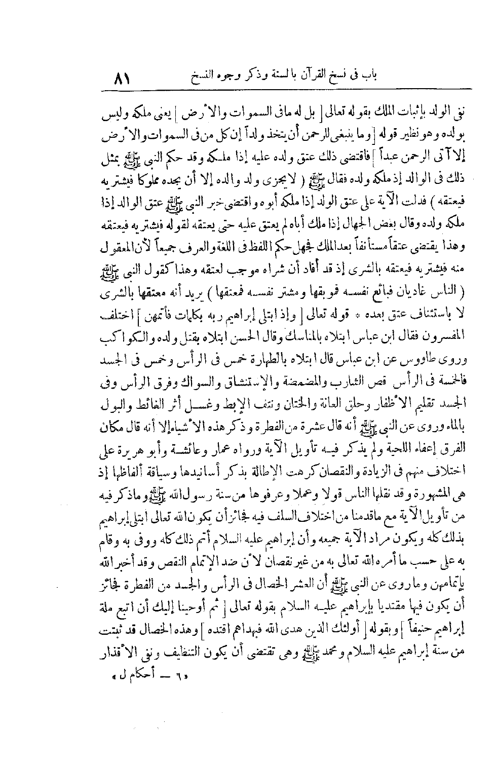 عَلَى اخْتِلَافٍ مِنْهُمْ فِي الزِّيَادَةِ وَالنُّقْصَانِ كَرِهْتُ الْإِطَالَةَ بِذِكْرِ أَسَانِيدِهَا وَسِيَاقَةِ أَلْفَاظِهَا إذْ هِيَ الْمَشْهُورَةُ وَقَدْ نَقَلَهَا النَّاسُ قَوْلًا وَعَمَلًا وَعَرَفُوهَا مِنْ سُنَّةِ رَسُولِ اللَّهِ صَلَّى اللَّهُ عَلَيْهِ وَسَلَّمَ وَمَا ذُكِرَ فِيهِ مِنْ تَأْوِيلِ الْآيَةِ مَعَ مَا قَدَّمْنَا مِنْ اخْتِلَافِ السَّلَفِ فِيهِ فَجَائِزٌ أَنْ يَكُونَ اللَّهُ تَعَالَى ابْتَلَى إبْرَاهِيمَ بِذَلِكَ كُلِّهِ وَيَكُونُ مُرَادُ الْآيَةِ جَمِيعَهُ وَأَنَّ إبْرَاهِيمَ عَلَيْهِ السَّلَامُ أَتَمَّ ذَلِكَ كُلَّهُ وَوَفَّى بِهِ وَقَامَ بِهِ عَلَى حَسَبِ مَا أَمَرَهُ اللَّه تَعَالَى بِهِ مِنْ غَيْرِ نُقْصَانٍ لِأَنَّ ضِدَّ الْإِتْمَامِ النَّقْصُ وَقَدْ أَخْبَرَ اللَّهُ بِإِتْمَامِهِنَّ وَمَا