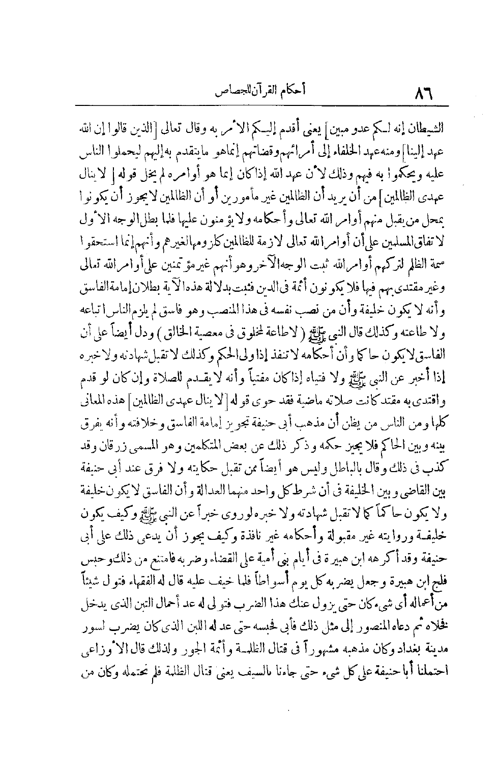 وَدَلَّ أَيْضًا عَلَى أَنَّ الْفَاسِقَ لَا يَكُونُ حَاكِمًا وَأَنَّ أَحْكَامَهُ لَا تَنْفُذُ إذَا وَلِيَ الْحُكْمَ وَكَذَلِكَ لَا تُقْبَلُ شَهَادَتُهُ وَلَا خَبَرُهُ إذَا أَخْبَرَ عَنْ النَّبِيِّ صَلَّى اللَّهُ عَلَيْهِ وَسَلَّمَ وَلَا فُتْيَاهُ إذَا كَانَ مُفْتِيًا وَأَنَّهُ لَا يُقَدَّمُ لِلصَّلَاةِ وَإِنْ كَانَ لَوْ قُدِّمَ وَاقْتَدَى بِهِ مُقْتَدٍ كَانَتْ صَلَاتُهُ مَاضِيَةً فَقَدْ حَوَى قوله [لا يَنالُ عَهْدِي الظَّالِمِينَ] هَذِهِ الْمَعَانِي كُلِّهَا وَمِنْ النَّاسِ مَنْ يَظُنُّ أَنَّ مَذْهَبَ أَبِي حَنِيفَةَ تَجْوِيزُ إمَامَةِ الْفَاسِقِ وَخِلَافَتِهِ وَأَنَّهُ يُفَرِّقُ بَيْنَهُ وَبَيْنَ الْحَاكِمِ فَلَا يُجِيزُ حُكْمَهُ وَذُكِرَ ذَلِكَ عَنْ بَعْضِ الْمُتَكَلِّمِينَ وَهُوَ الْمُسَمَّى زُرْقَانَ وَقَدْ كَذَبَ فِي ذَلِكَ وَقَالَ بِالْبَاطِلِ وَلَيْسَ هُوَ أَيْضًا مِمَّنْ تُقْبَلُ حِكَايَتُهُ وَلَا فَرْقَ عِنْدَ أَبِي حَنِيفَةَ بَيْنَ الْقَاضِي وَبَيْنَ الْخَلِيفَةِ فِي أَنَّ شَرْطَ كُلِّ وَاحِدٍ مِنْهُمَا الْعَدَالَةُ وَأَنَّ الْفَاسِقَ لَا يَكُونُ خَلِيفَةً وَلَا يَكُونُ حَاكِمًا كَمَا لَا تُقْبَلُ شَهَادَتُهُ وَلَا خَبَرُهُ لَوْ رَوَى خَبَرًا عَنْ النبي صلّى الله عليه وسلم وَكَيْفَ يَكُونُ خَلِيفَةً وَرِوَايَتُهُ غَيْرُ مَقْبُولَةٍ وَأَحْكَامُهُ غَيْرُ نَافِذَةٍ وَكَيْفَ يَجُوزُ أَنْ يُدْعَى ذَلِكَ عَلَى أَبِي حَنِيفَةَ وَقَدْ أَكْرَهَهُ ابْنُ هُبَيْرَةَ فِي أَيَّامِ بَنِي أُمَيَّةَ عَلَى الْقَضَاءِ وَضَرَبَهُ فَامْتَنَعَ مِنْ ذَلِكَ وَحُبِسَ فَلَجَّ ابْنُ هُبَيْرَةَ وَجَعَلَ يَضْرِبُهُ كُلَّ يَوْمٍ أَسْوَاطًا فَلَمَّا خِيفَ عَلَيْهِ قَالَ لَهُ الْفُقَهَاءُ فَتَوَلَّ شَيْئًا مِنْ أَعْمَالِهِ أَيَّ شَيْءٍ كَانَ حَتَّى يَزُولَ عَنْك هَذَا الضَّرْبُ فَتَوَلَّى لَهُ عَدَّ أَحْمَالِ التِّبْنِ الَّذِي يَدْخُلُ فَخَلَّاهُ ثُمَّ دَعَاهُ الْمَنْصُورُ إلَى مثل ذلك فأبى فحبسه حتى عدله اللَّبِنَ الَّذِي كَانَ يُضْرَبُ لِسُورِ مَدِينَةِ بَغْدَادَ وَكَانَ مَذْهَبُهُ مَشْهُورًا فِي قِتَالِ الظَّلَمَةِ وَأَئِمَّةِ الْجَوْرِ وَلِذَلِكَ قَالَ الْأَوْزَاعِيُّ احْتَمَلْنَا أَبَا حَنِيفَةَ عَلَى كُلِّ شَيْءٍ حَتَّى جَاءَنَا بِالسَّيْفِ يَعْنِي قِتَالَ الظَّلَمَةِ فَلَمْ نَحْتَمِلْهُ وَكَانَ مِنْ