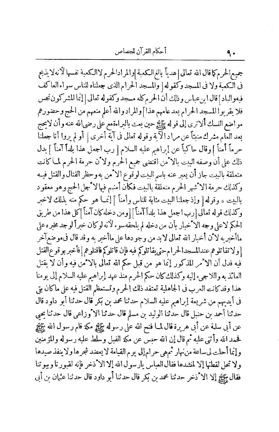 وَقَالَ حَاكِيًا عَنْ إبْرَاهِيمَ عَلَيْهِ السَّلَامُ [رَبِّ اجْعَلْ هذا بَلَداً آمِناً] يَدُلُّ ذَلِكَ عَلَى أَنَّ وَصْفَهُ الْبَيْتَ بِالْأَمْنِ اقْتَضَى جَمِيعَ الْحَرَمِ وَلِأَنَّ حُرْمَةَ الْحَرَمِ لَمَّا كَانَتْ مُتَعَلِّقَةً بِالْبَيْتِ جَازَ أَنْ يُعَبَّرَ عَنْهُ بِاسْمِ الْبَيْتِ لِوُقُوعِ الْأَمْنِ بِهِ وَحَظْرِ الْقِتَالِ وَالْقَتْلِ فِيهِ وَكَذَلِكَ حُرْمَةُ الْأَشْهُرِ الْحُرُمِ مُتَعَلِّقَةٌ بِالْبَيْتِ فَكَانَ أَمْنُهُمْ فِيهَا لِأَجْلِ الْحَجِّ وَهُوَ مَعْقُودٌ بِالْبَيْتِ وَقَوْلُهُ [وَإِذْ جَعَلْنَا الْبَيْتَ مَثابَةً لِلنَّاسِ وَأَمْناً] إنَّمَا هُوَ حُكْمٌ مِنْهُ بِذَلِكَ لَا خَبَرٌ وَكَذَلِكَ قَوْله تَعَالَى [رَبِّ اجْعَلْ هَذَا بَلَداً آمِناً] [وَمَنْ دَخَلَهُ كانَ آمِناً] كُلُّ هَذَا مِنْ طَرِيقِ الْحُكْمِ لَا عَلَى وَجْهِ الْإِخْبَارِ بِأَنَّ مَنْ دَخَلَهُ لَمْ يَلْحَقْهُ سُوءٌ لِأَنَّهُ لَوْ كَانَ خَبَرًا لَوَجَدَ مُخْبِرُهُ على ما أخبر به لأن أخبار الله تَعَالَى لَا بُدَّ مِنْ وُجُودِهَا عَلَى مَا أَخْبَرَ بِهِ وَقَدْ قَالَ فِي مَوْضِعٍ آخَرَ [وَلا تُقاتِلُوهُمْ عِنْدَ الْمَسْجِدِ الْحَرامِ حَتَّى يُقاتِلُوكُمْ فِيهِ فَإِنْ قاتَلُوكُمْ فَاقْتُلُوهُمْ] فَأَخْبَرَ بِوُقُوعِ الْقَتْلِ فِيهِ فَدَلَّ أَنَّ الْأَمْرَ الْمَذْكُورَ إنَّمَا هُوَ مِنْ قَبْلِ حُكْمِ اللَّهِ تَعَالَى بِالْأَمْنِ فِيهِ وَأَنْ لَا يُقْتَلَ الْعَائِذُ بِهِ وَاللَّاجِئُ إلَيْهِ وَكَذَلِكَ كَانَ حُكْمُ الْحَرَمِ مُنْذُ عَهْدِ إبْرَاهِيمَ عَلَيْهِ السَّلَامُ إلَى يَوْمِنَا هَذَا وَقَدْ كَانَتْ الْعَرَبُ فِي الْجَاهِلِيَّةِ تَعْتَقِدُ ذلك الحرم وَتَسْتَعْظِمُ الْقَتْلَ فِيهِ عَلَى مَا كَانَ بَقِيَ فِي أَيْدِيهِمْ مِنْ شَرِيعَةِ إبْرَاهِيمَ عَلَيْهِ السَّلَامُ