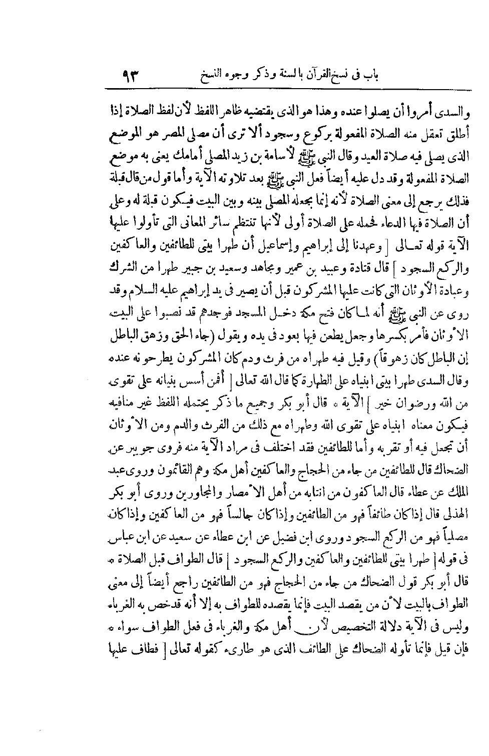 يَعْنِي بِهِ مَوْضِعَ الصَّلَاةِ الْمَفْعُولَةِ وَقَدْ دَلَّ عَلَيْهِ أَيْضًا فِعْلُ النَّبِيِّ صَلَّى اللَّهُ عَلَيْهِ وَسَلَّمَ بَعْدَ تِلَاوَتِهِ الْآيَةَ وَأَمَّا قَوْلُ مَنْ قَالَ قِبْلَةٌ فَذَلِكَ يَرْجِعُ إلَى مَعْنَى الصَّلَاةِ لِأَنَّهُ إنَّمَا يَجْعَلُهُ الْمُصَلِّي بَيْنَهُ وَبَيْنَ الْبَيْتِ فَيَكُونُ قِبْلَةً لَهُ وَعَلَى أَنَّ الصَّلَاةَ فِيهَا الدُّعَاءُ فَحَمْلُهُ عَلَى الصَّلَاةِ أَوْلَى لِأَنَّهَا تَنْتَظِمُ سَائِرَ الْمَعَانِي الَّتِي تَأَوَّلُوا عَلَيْهَا الْآيَةَ قَوْله تَعَالَى [وَعَهِدْنا إِلى إِبْراهِيمَ وَإِسْماعِيلَ أَنْ طَهِّرا بَيْتِيَ لِلطَّائِفِينَ وَالْعاكِفِينَ وَالرُّكَّعِ السُّجُودِ] قَالَ قَتَادَةُ وَعُبَيْدُ بْنُ عُمَيْرٍ وَمُجَاهِدٌ وَسَعِيدُ بْنُ جُبَيْرٍ طَهِّرَا مِنْ الشِّرْكِ وَعِبَادَةِ الْأَوْثَانِ التي كانت عَلَيْهَا الْمُشْرِكُونَ قَبْلَ أَنْ يَصِيرَ فِي يَدِ إبْرَاهِيمَ عَلَيْهِ السَّلَامُ