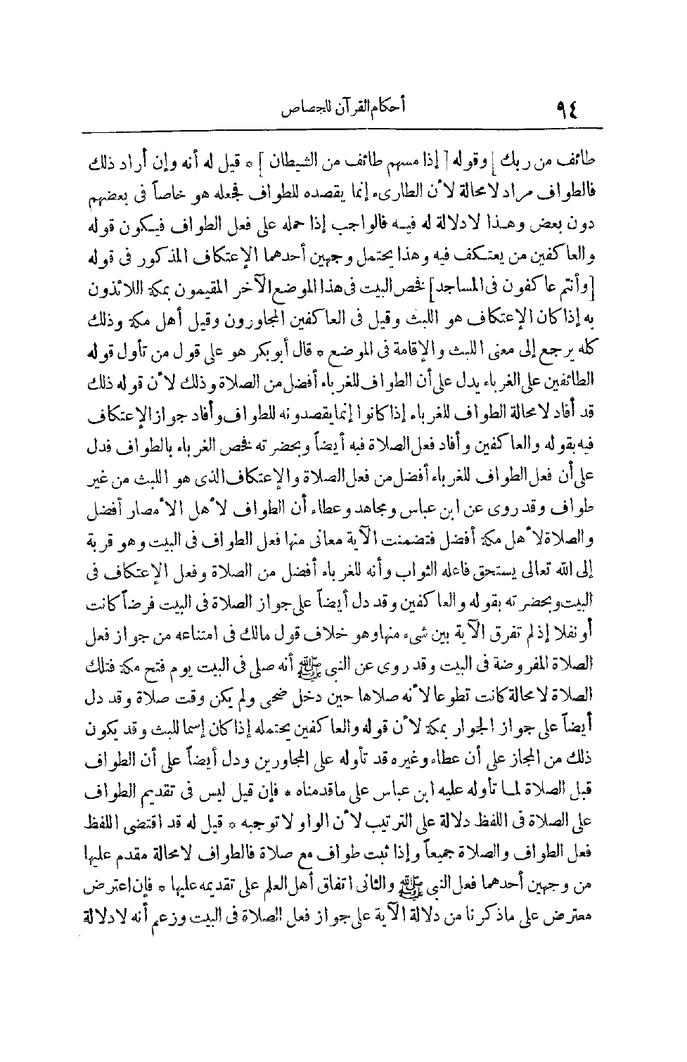 وقوله [إِذا مَسَّهُمْ طائِفٌ مِنَ الشَّيْطانِ] قِيلَ لَهُ إنَّهُ وَإِنْ أَرَادَ ذَلِكَ فَالطَّوَافُ مُرَادٌ لَا مَحَالَةَ لِأَنَّ الطَّارِئَ إنَّمَا يَقْصِدُهُ لِلطَّوَافِ فَجَعَلَهُ هُوَ خَاصًّا فِي بَعْضِهِمْ دُونَ بَعْضٍ وَهَذَا لَا دَلَالَةَ لَهُ فِيهِ فَالْوَاجِبُ إذَا حَمَلَهُ عَلَى فِعْلِ الطَّوَافِ فَيَكُونُ قَوْلُهُ وَالْعَاكِفِينَ مَنْ يَعْتَكِفُ فِيهِ وَهَذَا يَحْتَمِلُ وَجْهَيْنِ أَحَدُهُمَا الِاعْتِكَافُ الْمَذْكُورُ فِي قَوْلِهِ [وَأَنْتُمْ عاكِفُونَ فِي الْمَساجِدِ] فخص البيت في هذا الموضع الْآخَرُ الْمُقِيمُونَ بِمَكَّةَ اللَّائِذُونَ بِهِ إذَا كَانَ الِاعْتِكَافُ هُوَ اللُّبْثُ وَقِيلَ فِي الْعَاكِفِينَ الْمُجَاوِرُونَ وَقِيلَ أَهْلُ مَكَّةَ وَذَلِكَ كُلُّهُ يَرْجِعُ إلَى مَعْنَى اللُّبْثِ وَالْإِقَامَةِ فِي الْمَوْضِعِ قَالَ أَبُو بكر هو عَلَى قَوْلِ مَنْ تَأَوَّلَ قَوْلَهُ الطَّائِفِينَ عَلَى الْغُرَبَاءِ يَدُلُّ عَلَى أَنَّ الطَّوَافَ لِلْغُرَبَاءِ أَفْضَلُ مِنْ الصَّلَاةِ وَذَلِكَ لِأَنَّ قَوْلَهُ ذَلِكَ قَدْ أفاد لا محالة الطواف للغرباء إذا كَانُوا إنَّمَا يَقْصِدُونَهُ لِلطَّوَافِ وَأَفَادَ جَوَازَ الِاعْتِكَافِ فيه بقوله والعاكفين وَأَفَادَ فِعْلَ الصَّلَاةِ فِيهِ أَيْضًا وَبِحَضْرَتِهِ فَخَصَّ الْغُرَبَاءَ بِالطَّوَافِ فَدَلَّ عَلَى أَنَّ فِعْلَ الطَّوَافِ لِلْغُرَبَاءِ أَفْضَلُ مِنْ فِعْلِ الصَّلَاةِ وَالِاعْتِكَافِ الَّذِي هو اللبث مِنْ غَيْرِ طَوَافٍ وَقَدْ رُوِيَ عَنْ ابْنِ عَبَّاسٍ وَمُجَاهِدٍ وَعَطَاءٍ أَنَّ الطَّوَافَ لِأَهْلِ الْأَمْصَارِ أَفْضَلُ وَالصَّلَاةَ لِأَهْلِ مَكَّةَ أَفْضَلُ فَتَضَمَّنَتْ الْآيَةُ مَعَانِيَ مِنْهَا فِعْلُ الطَّوَافِ فِي الْبَيْتِ وَهُوَ قُرْبَةٌ إلَى اللَّهِ تَعَالَى يَسْتَحِقُّ فَاعِلُهُ الثَّوَابَ وَأَنَّهُ لِلْغُرَبَاءِ أَفْضَلُ مِنْ الصَّلَاةِ وَفِعْلُ الِاعْتِكَافِ في البيت وبحضرته بقوله والعاكفين وَقَدْ دَلَّ أَيْضًا عَلَى جَوَازِ الصَّلَاةِ فِي الْبَيْتِ فَرْضًا كَانَتْ أَوْ نَفْلًا إذْ لَمْ تُفَرِّقَ الْآيَةُ بَيْنَ شَيْءٍ مِنْهَا وَهُوَ خِلَافُ قَوْلِ مَالِكٍ فِي امْتِنَاعِهِ مِنْ جَوَازِ فِعْلِ الصَّلَاةِ الْمَفْرُوضَةِ فِي الْبَيْتِ