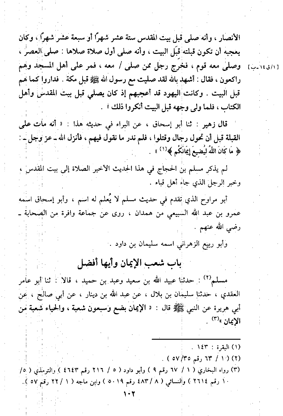 مُسلم: حَدثنَا عبيد الله بن سعيد وَعبد بن حميد، قَالَا: ثَنَا أَبُو عَامر الْعَقدي، حَدثنَا سُلَيْمَان بن بِلَال، عَن عبد الله بن دِينَار، عَن أبي صَالح، عَن أبي هُرَيْرَة عَن النَّبِي - صَلَّى اللَّهُ عَلَيْهِ وَسَلَّم َ - قَالَ: " الْإِيمَان بضع وَسَبْعُونَ شُعْبَة، وَالْحيَاء شُعْبَة من الْإِيمَان ".