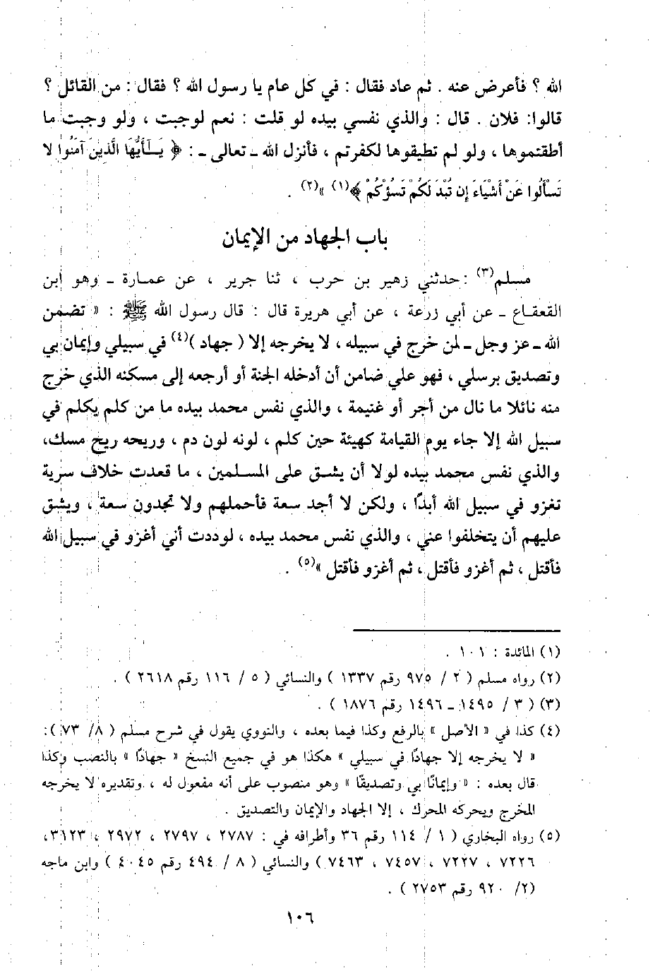 مُسلم: حَدثنِي زُهَيْر بن حَرْب، ثَنَا جرير، عَن عمَارَة - وَهُوَ ابْن الْقَعْقَاع - عَن أبي زرْعَة، عَن أبي هُرَيْرَة قَالَ: قَالَ رَسُول الله - صَلَّى اللَّهُ عَلَيْهِ وَسَلَّم َ -: " تضمن الله - عز وَجل - لمن خرج فِي سَبيله، لَا يُخرجهُ إِلَّا (جِهَاد) فِي سبيلي وإيمان بِي وتصديق برسلي، فَهُوَ عَليّ ضَامِن أَن أدخلهُ الْجنَّة أَو أرجعه إِلَى مَسْكَنه الَّذِي خرج مِنْهُ نائلا مَا نَالَ من أجر أَو غنيمَة، وَالَّذِي نفس مُحَمَّد بِيَدِهِ مَا من كلم يكلم فِي سَبِيل الله إِلَّا جَاءَ يَوْم الْقِيَامَة كَهَيئَةِ حِين كلم، لَونه لون دم، وريحه ريح مسك، وَالَّذِي نفس مُحَمَّد بِيَدِهِ لَوْلَا أَن يشق على الْمُسلمين، مَا قعدت خلاف سَرِيَّة تغزو فِي سَبِيل الله أبدا، وَلَكِن لَا أجد سَعَة فأحملهم وَلَا تَجِدُونَ سَعَة، ويشق عَلَيْهِم أَن يتخلفوا عني، وَالَّذِي نفس مُحَمَّد بِيَدِهِ، لَوَدِدْت أَنِّي أغزو فِي سَبِيل الله فأقتل، ثمَّ أغزوا فأقتل، ثمَّ أغزو فأقتل ".