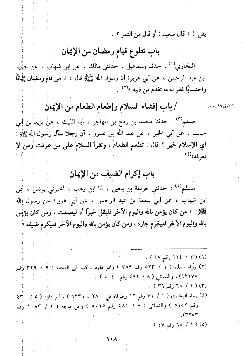 البُخَارِيّ: حَدثنَا إِسْمَاعِيل، حَدثنِي مَالك، عَن ابْن شهَاب، عَن حميد ابْن عبد الرَّحْمَن، عَن أبي هُرَيْرَة أَن رَسُول الله - صَلَّى اللَّهُ عَلَيْهِ وَسَلَّم َ - قَالَ: " من قَامَ رَمَضَان إِيمَانًا واحتساباً غفر لَهُ مَا تقدم من ذَنبه ".