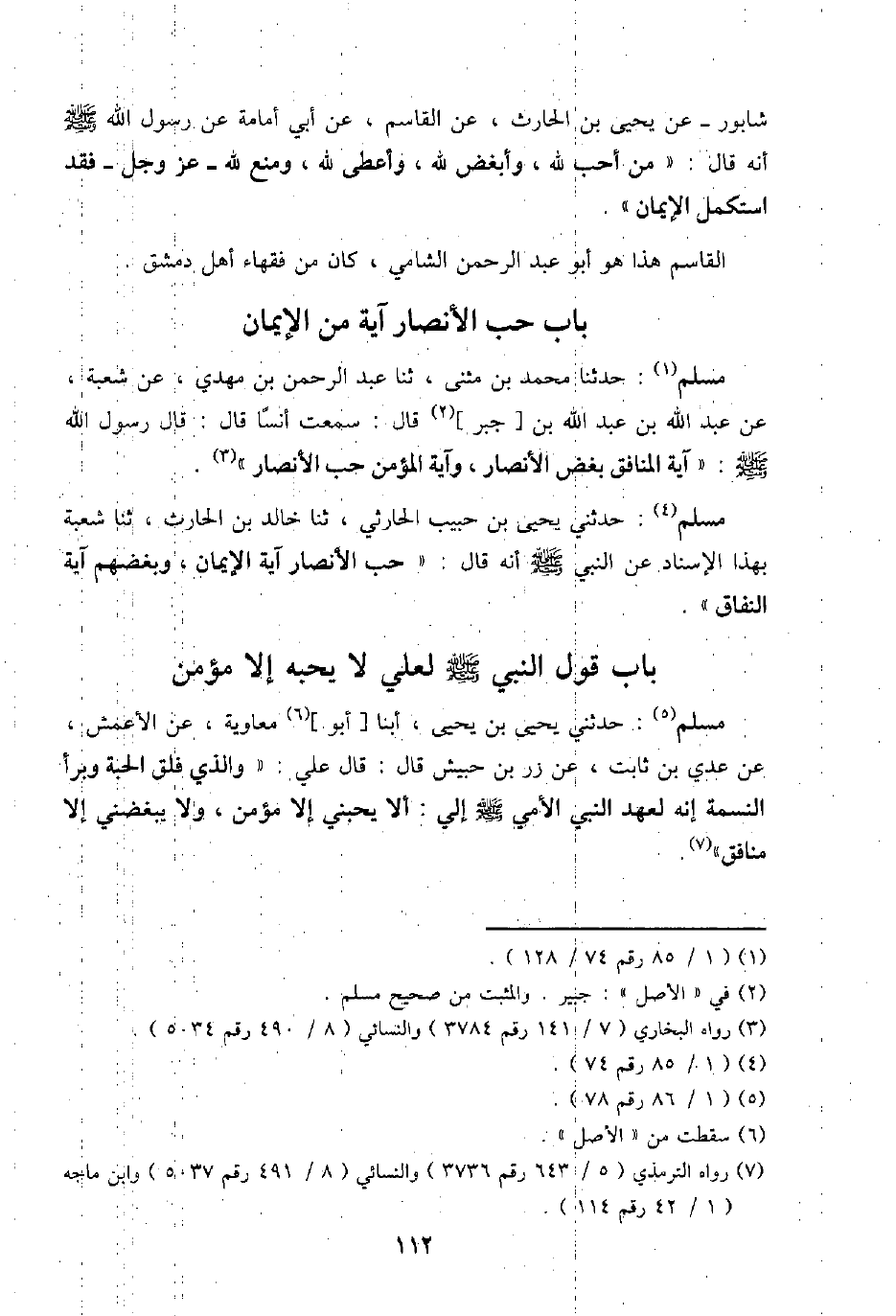 مُسلم: حَدثنِي يحيى بن حبيب الْحَارِثِيّ، ثَنَا خَالِد بن الْحَارِث، ثَنَا شُعْبَة بِهَذَا الْإِسْنَاد عَن النَّبِي - صَلَّى اللَّهُ عَلَيْهِ وَسَلَّم َ - أَنه قَالَ: " حب الْأَنْصَار آيَة الْإِيمَان، وبغضهم آيَة النِّفَاق ".