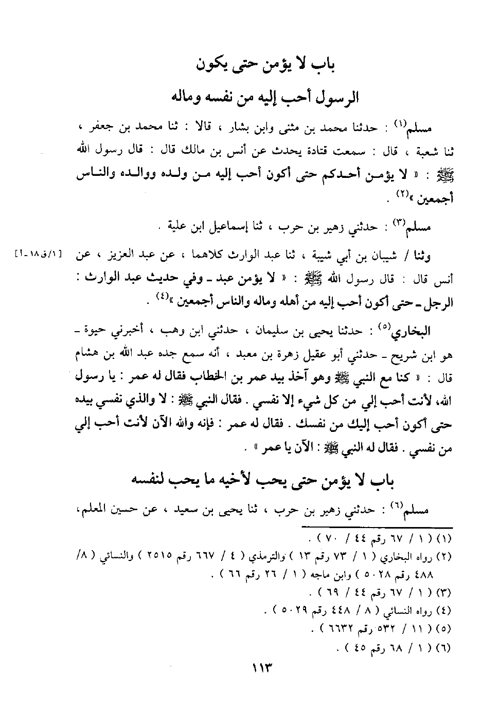 مُسلم: حَدثنَا مُحَمَّد بن مثنى وَابْن بشار، قَالَا: ثَنَا مُحَمَّد بن جَعْفَر، ثَنَا شُعْبَة، قَالَ: سَمِعت قَتَادَة يحدث عَن أنس بن مَالك قَالَ: قَالَ رَسُول الله - صَلَّى اللَّهُ عَلَيْهِ وَسَلَّم َ -: " لَا يُؤمن أحدكُم حَتَّى أكون أحب إِلَيْهِ من وَلَده ووالده وَالنَّاس أَجْمَعِينَ ".