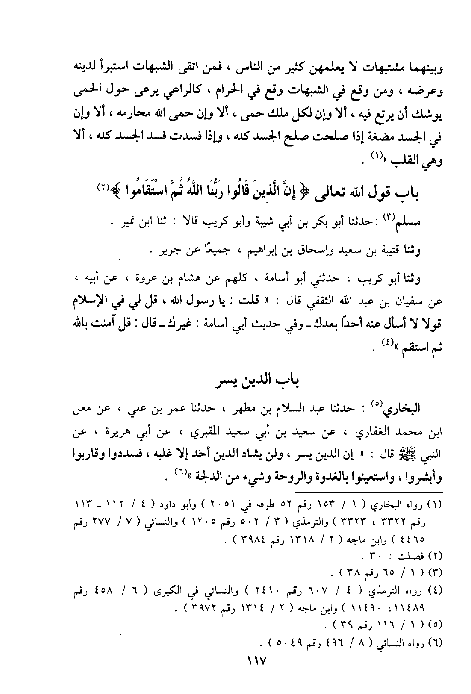 وَبَينهمَا مُشْتَبهَات لَا يعلمهُنَّ كثير من النَّاس، فَمن اتَّقى الشُّبُهَات اسْتَبْرَأَ لدينِهِ وَعرضه، وَمن وَقع فِي الشُّبُهَات وَقع فِي الْحَرَام، كَالرَّاعِي يرْعَى حول الْحمى يُوشك أَن يرتع فِيهِ، أَلا وَإِن لكل ملك حمى، أَلا وَإِن حمى الله مَحَارمه، أَلا وَإِن فِي الْجَسَد مُضْغَة إِذا صلحت صلح الْجَسَد كُله، وَإِذا فَسدتْ فسد الْجَسَد كُله، أَلا وَهِي الْقلب ".