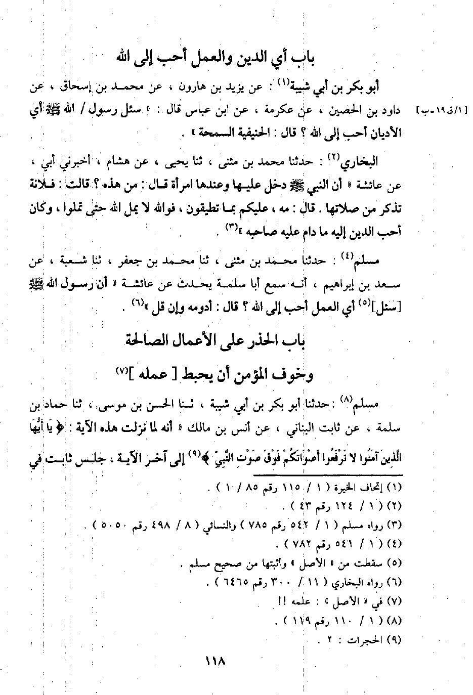 مُسلم: حَدثنَا مُحَمَّد بن مثنى، ثَنَا مُحَمَّد بن جَعْفَر، ثَنَا شُعْبَة، عَن سعد بن إِبْرَاهِيم، أَنه سمع أَبَا سَلمَة يحدث عَن عَائِشَة " أَن رَسُول الله - صَلَّى اللَّهُ عَلَيْهِ وَسَلَّم َ -[سُئِلَ] أَي الْعَمَل أحب إِلَى الله؟ قَالَ: أَدْوَمه وَإِن قل ".