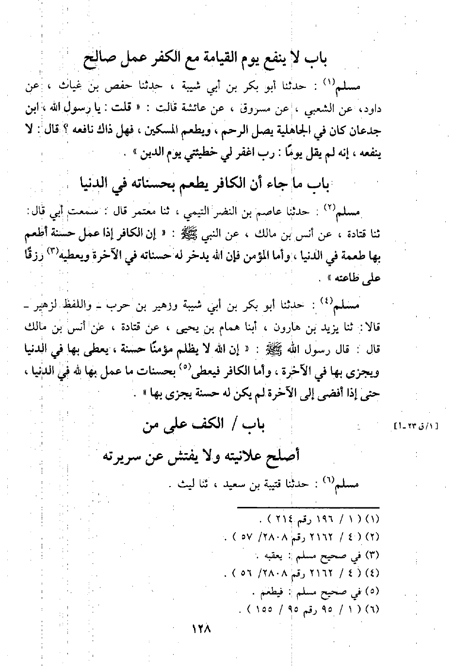 مُسلم: حَدثنَا أَبُو بكر بن أبي شيبَة، حَدثنَا حَفْص بن غياث، عَن دَاوُد، عَن الشّعبِيّ، عَن مَسْرُوق، عَن عَائِشَة قَالَت: " قلت: يَا رَسُول الله، ابْن جدعَان كَانَ فِي الْجَاهِلِيَّة يصل الرَّحِم، وَيطْعم الْمِسْكِين، فَهَل ذَاك نافعه؟ قَالَ: لَا يَنْفَعهُ، إِنَّه لم يقل يَوْمًا: رب أَغفر لي خطيئتي يَوْم الدَّين ".