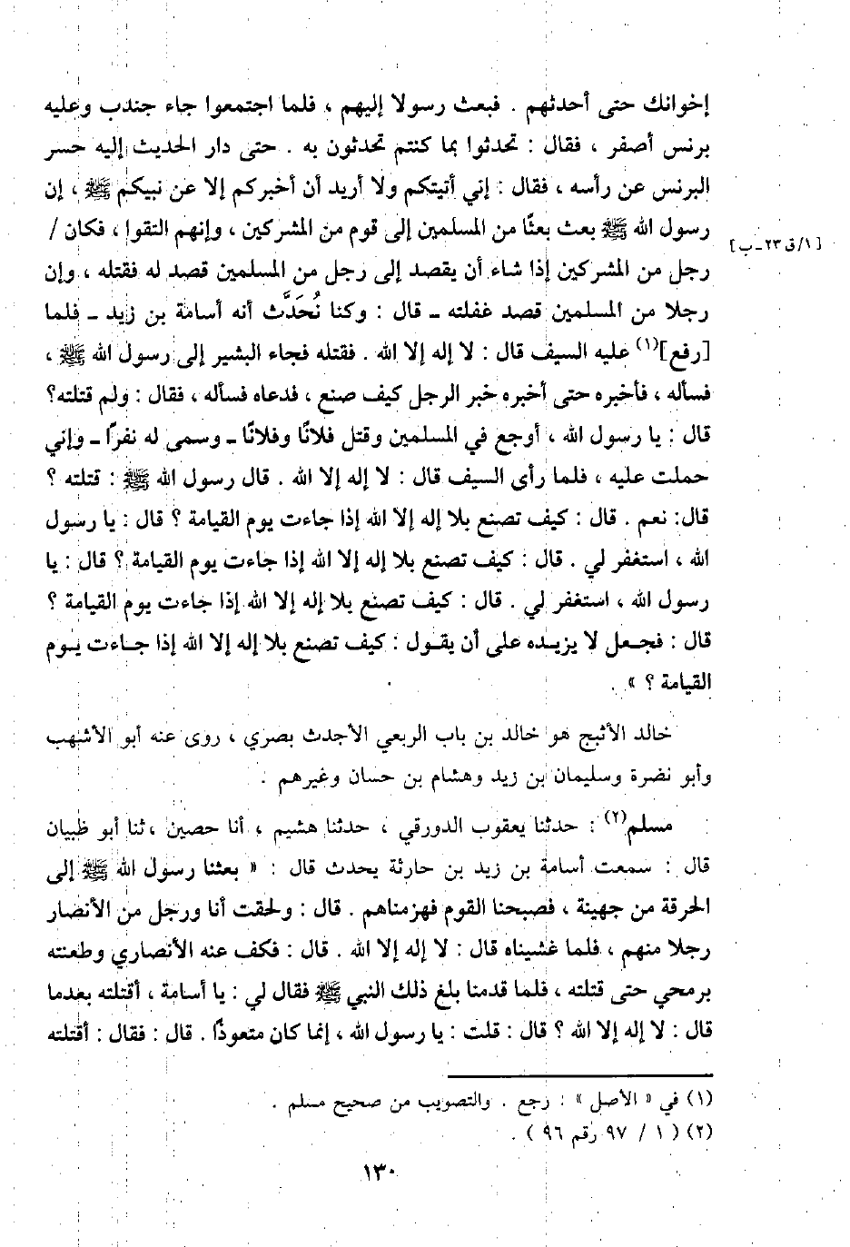 مُسلم: حَدثنَا يَعْقُوب الدَّوْرَقِي، حَدثنَا هشيم، أَنا حُصَيْن، ثَنَا أَبُو ظبْيَان قَالَ: سَمِعت أُسَامَة بن زيد بن حَارِثَة يحدث قَالَ: " بعثنَا رَسُول الله - صَلَّى اللَّهُ عَلَيْهِ وَسَلَّم َ - إِلَى الحرقة من جُهَيْنَة، فصبحنا الْقَوْم فهزمناهم. قَالَ: وَلَحِقت أَنا وَرجل من الْأَنْصَار رجلا مِنْهُم، فَلَمَّا غشيناه قَالَ: لَا إِلَه إِلَّا الله. قَالَ: فَكف عَنهُ الْأنْصَارِيّ وطعنته برمحي حَتَّى قتلته، فَلَمَّا قدمنَا بلغ ذَلِك النَّبِي - صَلَّى اللَّهُ عَلَيْهِ وَسَلَّم َ - فَقَالَ لي: يَا أُسَامَة،، أقتلته بَعْدَمَا قَالَ: لَا إِلَه إِلَّا الله؟ قَالَ: قلت: يَا رَسُول الله، إِنَّمَا كَانَ مُتَعَوِّذًا. قَالَ: فَقَالَ: أقتلته