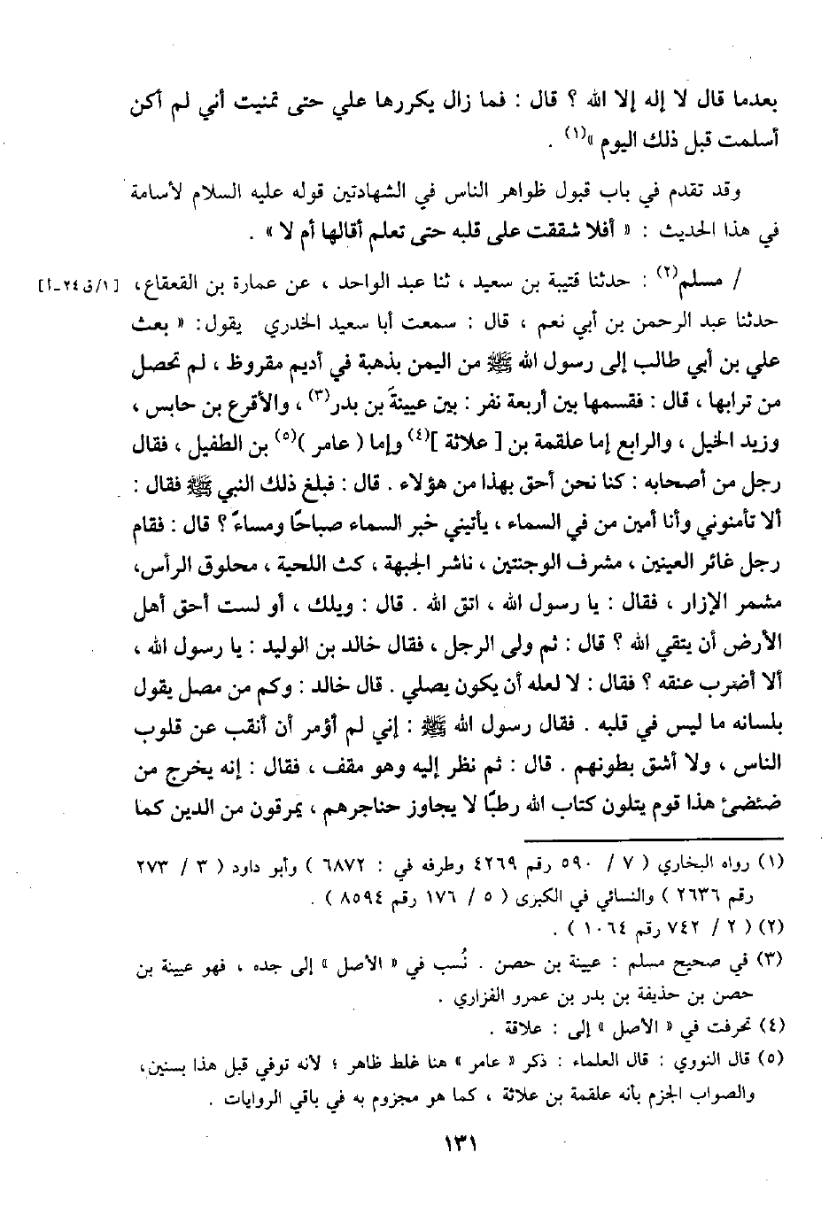 / مُسلم: حَدثنَا قُتَيْبَة بن سعيد، ثَنَا عبد الْوَاحِد، عَن عمَارَة بن الْقَعْقَاع، حَدثنَا عبد الرَّحْمَن بن أبي نعم، قَالَ: سَمِعت أَبَا سعيد الْخُدْرِيّ يَقُول: " بعث عَليّ بن أبي طَالب إِلَى رَسُول الله - صَلَّى اللَّهُ عَلَيْهِ وَسَلَّم َ - من الْيمن بذهبة فِي أَدِيم مقروظ، لم تحصل من ترابها، قَالَ: فَقَسمهَا بَين أَرْبَعَة نفر: بَين عُيَيْنَة بن بدر، والأقرع بن حَابِس، وَزيد الْخَيل، وَالرَّابِع إِمَّا عَلْقَمَة بن [علاثة] وَإِمَّا (عَامر) بن الطُّفَيْل، فَقَالَ: أَلا تأمنوني وَأَنا أَمِين من فِي السَّمَاء، يأتيني خبر السَّمَاء صباحاً وَمَسَاء؟ قَالَ: فَقَامَ رجل غائر الْعَينَيْنِ، مشرف الوجنتين، ناشر الْجَبْهَة، كث اللِّحْيَة، محلوق الرَّأْس، مشمر الْإِزَار فَقَالَ: يَا رَسُول الله، اتَّقِ الله. قَالَ: وَيلك، أَو لست أَحَق أهل الأَرْض أَن يَتَّقِي الله؟ قَالَ: ثمَّ ولى الرجل، فَقَالَ خَالِد بن الْوَلِيد: يَا رَسُول الله، أَلا أضْرب عُنُقه؟ فَقَالَ: لَا لَعَلَّه أَن يكون يُصَلِّي. قَالَ خَالِد: وَكم من مصل يَقُول بِلِسَانِهِ مَا لَيْسَ فِي قلبه. فَقَالَ رَسُول الله - صَلَّى اللَّهُ عَلَيْهِ وَسَلَّم َ -: إِنِّي لم أُؤمر أَن أنقب عَن قُلُوب النَّاس، وَلَا أشق بطونهم. قَالَ: ثمَّ نظر إِلَيْهِ وَهُوَ مقف، فقلا: إِنَّه يخرج من ضئضئ هَذَا قوم يَتلون كتاب الله رطبا لَا يُجَاوز حَنَاجِرهمْ، يَمْرُقُونَ من الدَّين كَمَا