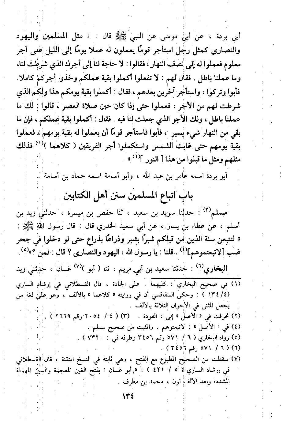 أبي بردة، عَن أبي مُوسَى عَن النَّبِي - صَلَّى اللَّهُ عَلَيْهِ وَسَلَّم َ - قَالَ: " مثل الْمُسلمين وَالْيَهُود وَالنَّصَارَى كَمثل رجل اسْتَأْجر قوما يعْملُونَ لَهُ عملا يَوْمًا إِلَى اللَّيْل على أجر مَعْلُوم فعملوا لَهُ إِلَى نصف النَّهَار، فَقَالُوا: لَا حَاجَة لنا إِلَى أجرك الَّذِي شرطت لنا، وَمَا عَملنَا بَاطِل، فَقَالَ لَهُم: لَا تَفعلُوا أكملوا بَقِيَّة عَمَلكُمْ وخذوا أجركُم كَامِلا. فَأَبَوا وَتركُوا، واستأجر آخَرين بعدهمْ، فَقَالَ: أكملوا بَقِيَّة يومكم هَذَا وَلكم الَّذِي شرطت لَهُم من الْأجر، فعملوا حَتَّى إِذا كَانَ حِين صَلَاة الْعَصْر، قَالُوا: لَك مَا عَملنَا بَاطِل، وَلَك الْأجر الَّذِي جعلت لنا فِيهِ. فَقَالَ: أكملوا بَقِيَّة عَمَلكُمْ، فَإِن مَا بَقِي من النَّهَار شَيْء يسير، فَأَبَوا فاستأجر قوما أَن يعملوا لَهُ بَقِيَّة يومهم، فعملوا بَقِيَّة يومهم حَتَّى غَابَتْ الشَّمْس واستكملوا أجر الْفَرِيقَيْنِ (كِلَاهُمَا) فَذَلِك مثلهم وَمثل مَا قبلوا من هَذَا [النُّور] ". أَبُو بردة اسْمه عَامر بن عبد الله، وَأَبُو أُسَامَة اسْمه حَمَّاد بن أُسَامَة.