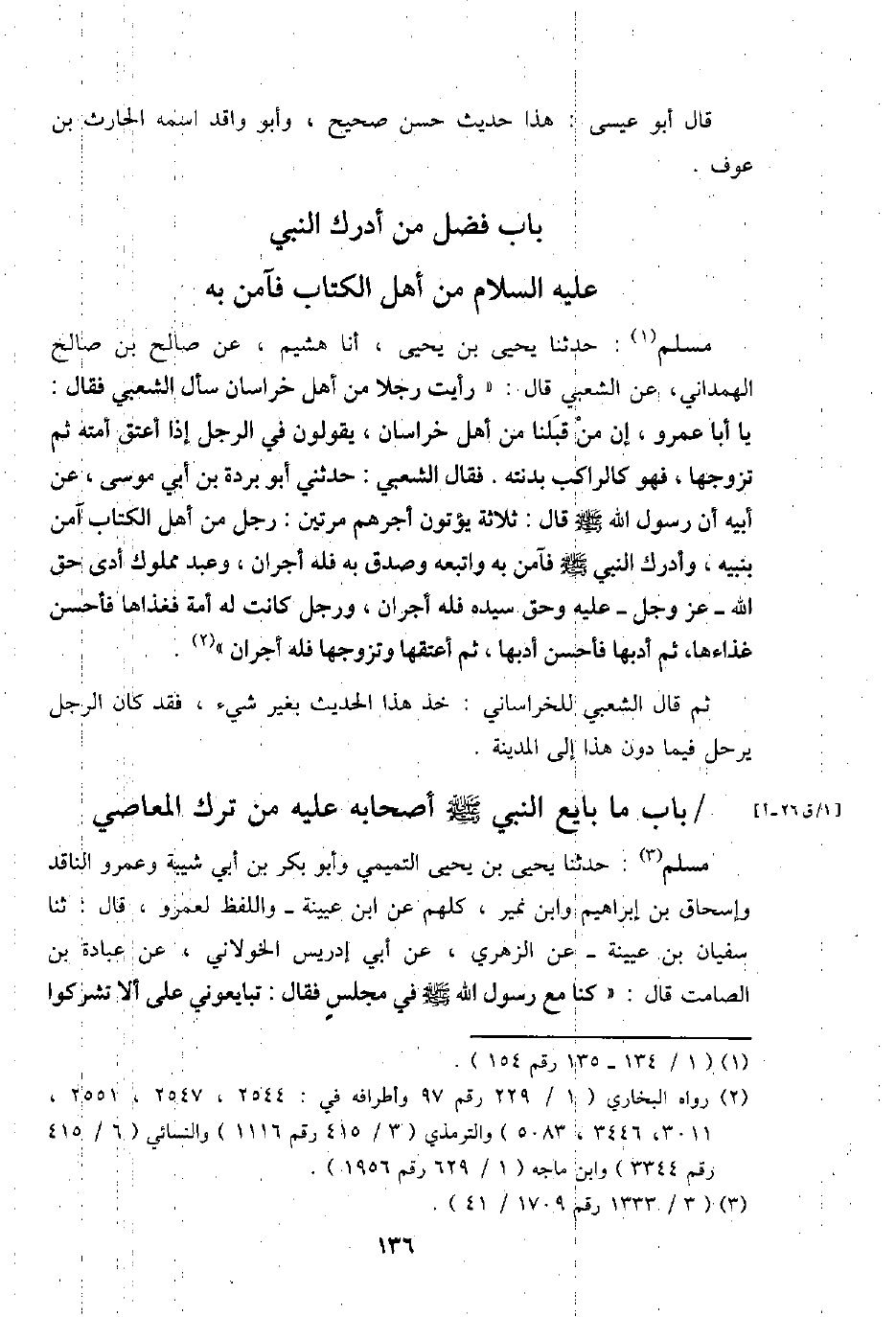 مُسلم: حَدثنَا يحيى بن يحيى، أَنا هشيم، عَن صَالح بن صَالح الهمذاني، عَن الشّعبِيّ قَالَ: " رَأَيْت رجلا من أهل خُرَاسَان سَأَلَ الشّعبِيّ فَقَالَ: يَا أَبَا عَمْرو، إِن من قبلنَا من أهل خُرَاسَان، يَقُولُونَ فِي الرجل إِذا أعتق أمته ثمَّ تزَوجهَا، فَهُوَ كالراكب بدنته. فَقَالَ الشّعبِيّ: حَدثنِي أَبُو بردة بن أبي مُوسَى، عَن أَبِيه أَن رَسُول الله - صَلَّى اللَّهُ عَلَيْهِ وَسَلَّم َ - قَالَ: ثَلَاثَة يُؤْتونَ أجرهم مرَّتَيْنِ: رجل من أهل الْكتاب آمن بِنَبِيِّهِ، وَأدْركَ النَّبِي - صَلَّى اللَّهُ عَلَيْهِ وَسَلَّم َ - فَآمن بِهِ وَاتبعهُ وَصدق بِهِ فَلهُ أَجْرَانِ، وَعبد مَمْلُوك أدّى حق الله - عز وَجل - عَلَيْهِ وَحقّ سَيّده فَلهُ أَجْرَانِ، وَرجل كَانَت لَهُ أمة فغذاها فَأحْسن غذاءها، ثمَّ أدبها فَأحْسن أدبها، ثمَّ أعْتقهَا وَتَزَوجهَا فَلهُ أَجْرَانِ ".