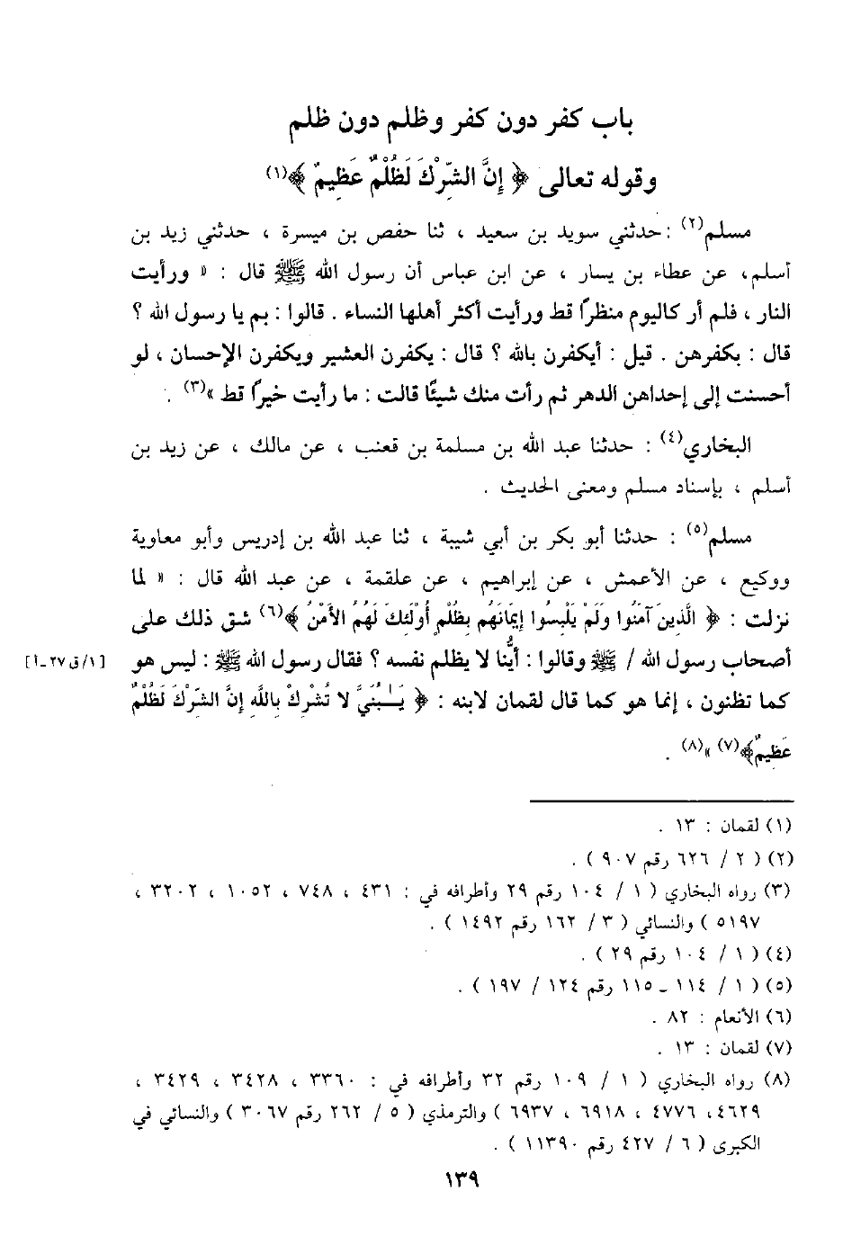 مُسلم: حَدثنَا أَبُو بكر بن أبي شيبَة، ثَنَا عبد الله بن إِدْرِيس وَأَبُو مُعَاوِيَة ووكيع، عَن الْأَعْمَش، عَن إِبْرَاهِيم، عَن عَلْقَمَة، عَن عبد الله قَالَ: " لما نزلت: {الَّذين آمنُوا وَلم يلبسوا إِيمَانهم بظُلْم أُولَئِكَ لَهُم الْأَمْن} شقّ ذَلِك على أَصْحَاب رَسُول الله / - صَلَّى اللَّهُ عَلَيْهِ وَسَلَّم َ - وَقَالُوا: أَيّنَا لَا يظلم نَفسه؟ فَقَالَ رَسُول الله - صَلَّى اللَّهُ عَلَيْهِ وَسَلَّم َ -: لَيْسَ هُوَ كَمَا تظنون، إِنَّمَا هُوَ كَمَا قَالَ لُقْمَان لِابْنِهِ: {يَا بني لَا تشرك بِاللَّه إِن الشّرك الظُّلم عَظِيم} ".