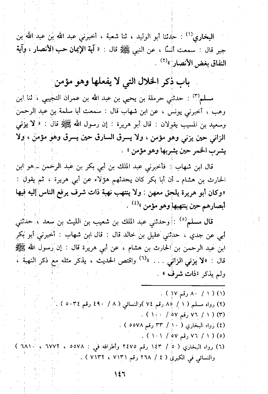 مُسلم: حَدثنِي حَرْمَلَة بن يحيى بن عبد الله بن عمرَان التجِيبِي، ثَنَا ابْن وهب، أَخْبرنِي يُونُس، عَن ابْن شهَاب قَالَ: سَمِعت أَبَا سَلمَة بن عبد الرَّحْمَن وَسَعِيد بن الْمسيب يَقُولَانِ: قَالَ أَبُو هُرَيْرَة: إِن رَسُول الله - صَلَّى اللَّهُ عَلَيْهِ وَسَلَّم َ - قَالَ: " لَا يَزْنِي الزَّانِي حِين يزنى وَهُوَ مُؤمن، وَلَا يسرق السَّارِق حِين يسرق وَهُوَ مُؤمن، وَلَا يشرب الْخمر حِين يشْربهَا وَهُوَ مُؤمن ".
