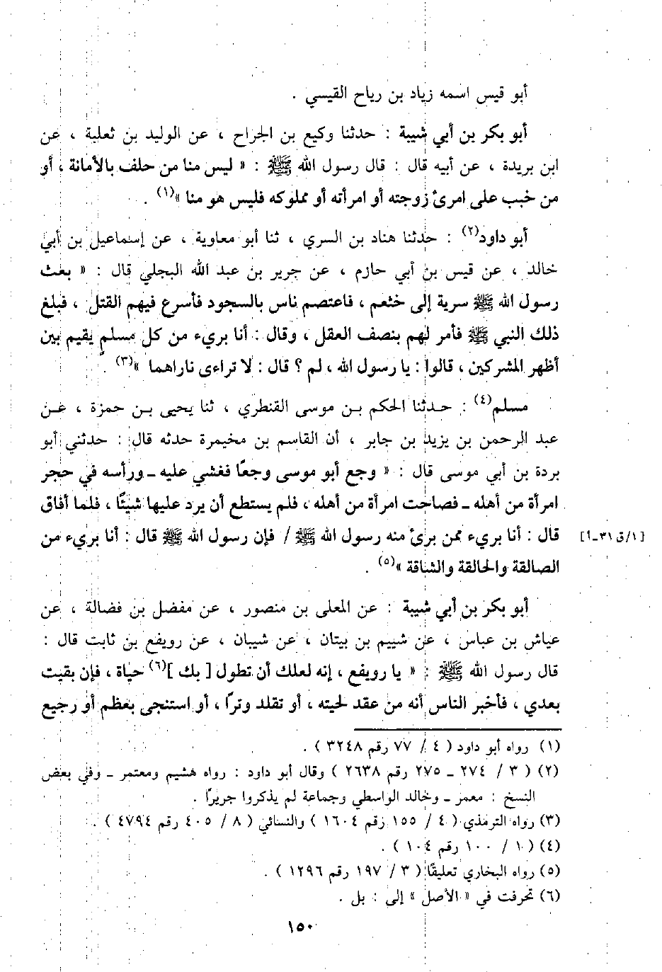 أَبُو بكر بن أبي شيبَة: عَن الْمُعَلَّى بن مَنْصُور، عَن مفضل بن فضَالة، عَن عَيَّاش بن عَبَّاس، عَن شييم بن بيتان، عَن شَيبَان، عَن رويفع بن ثَابت قَالَ: قَالَ رَسُول الله - صَلَّى اللَّهُ عَلَيْهِ وَسَلَّم َ -: " يَا رويفع، إِنَّه لَعَلَّك أَن تطول [بك] حَيَاة، فَإِن بقيت بعدِي، فَأخْبر النَّاس أَنه من عقد لحيته، أَو تقلد وترا، أَو استنجى بِعظم أَو رجيع