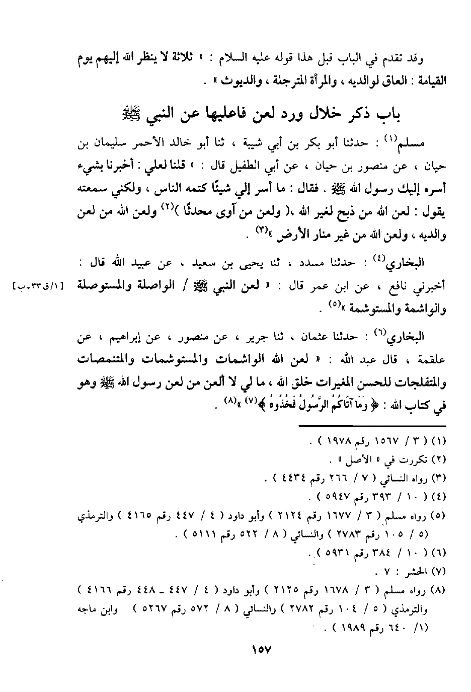 البُخَارِيّ: حَدثنَا عُثْمَان، ثَنَا جرير، عَن مَنْصُور، عَن إِبْرَاهِيم، عَن عَلْقَمَة، قَالَ عبد الله: " لعن الله الْوَاشِمَات وَالْمُسْتَوْشِمَات وَالْمُتَنَمِّصَات وَالْمُتَفَلِّجَات لِلْحسنِ الْمُغيرَات خلق الله، مَا لي لَا ألعن من لعن رَسُول الله - صَلَّى اللَّهُ عَلَيْهِ وَسَلَّم َ - وَهُوَ فِي كتاب الله: {وَمَا آتَاكُم الرَّسُول فَخُذُوهُ} ".