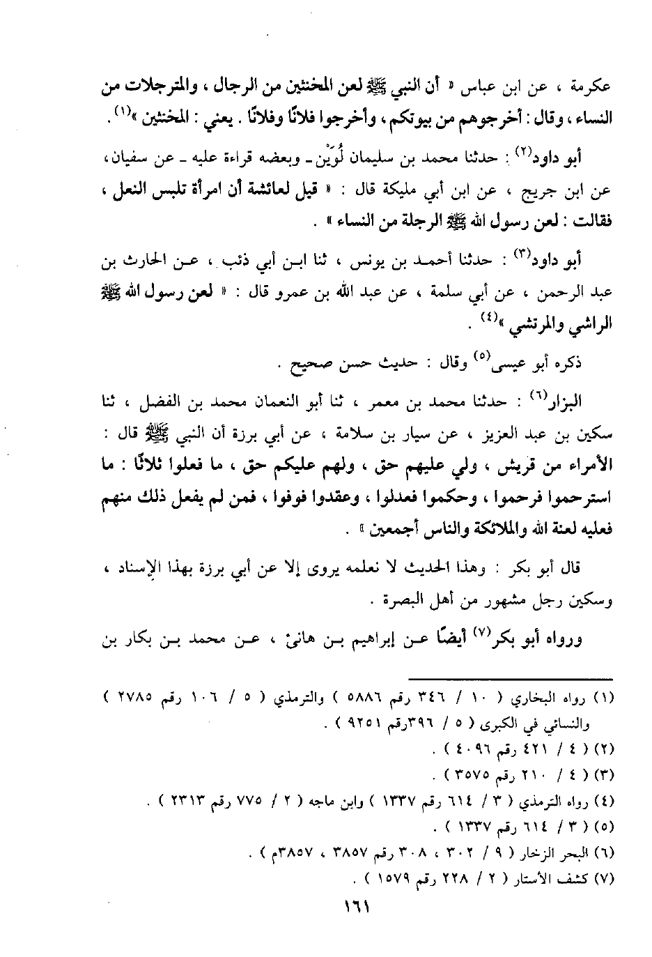 عِكْرِمَة، عَن ابْن عَبَّاس " أَن النَّبِي - صَلَّى اللَّهُ عَلَيْهِ وَسَلَّم َ - لعن المخنثين من الرِّجَال، والمترجلات من النِّسَاء، وَقَالَ: أخرجوهم من بُيُوتكُمْ، وأخرجوا فلَانا وَفُلَانًا. يَعْنِي: المخنثين ".