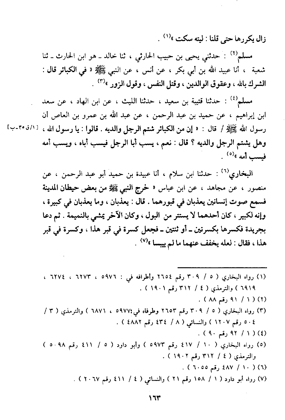 مُسلم: حَدثنَا قُتَيْبَة بن سعيد، حَدثنَا اللَّيْث، عَن ابْن الْهَاد، عَن سعد ابْن إِبْرَاهِيم، عَن حميد بن عبد الرَّحْمَن، عَن عبد الله بن عَمْرو بن الْعَاصِ أَن رَسُول الله - صَلَّى اللَّهُ عَلَيْهِ وَسَلَّم َ - / قَالَ: " إِن من الْكَبَائِر شتم الرجل وَالِديهِ. قَالُوا: يَا رَسُول الله، وَهل يشْتم الرجل وَالِديهِ؟ قَالَ: نعم، يسب أَبَا الرجل فيسب أَبَاهُ، ويسب أمه فيسب أمه ".