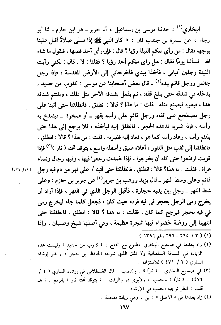 البُخَارِيّ: حَدثنَا مُوسَى بن إِسْمَاعِيل، أَنا جرير - هُوَ ابْن حَازِم - ثَنَا أَبُو رَجَاء، عَن سَمُرَة بن جُنْدُب قَالَ: " كَانَ النَّبِي - صَلَّى اللَّهُ عَلَيْهِ وَسَلَّم َ - إِذا صلى صَلَاة أقبل علينا بِوَجْهِهِ فَقَالَ: من رأى مِنْكُم اللَّيْلَة رُؤْيا؟ قَالَ: فَإِن رأى أحد قصها، فَيَقُول مَا شَاءَ الله. فسألنا يَوْمًا فَقَالَ: هَل رأى مِنْكُم أحد رُؤْيا؟ فَقُلْنَا: لَا. قَالَ: لكني رَأَيْت اللَّيْلَة رجلَيْنِ أتياني، فأخذا بيَدي فأخرجاني إِلَى الأَرْض المقدسة، فَإِذا رجل جَالس وَرجل قَائِم بِيَدِهِ - قَالَ بعض أَصْحَابنَا عَن مُوسَى: كَلوب من حَدِيد - يدْخلهُ فِي شدقه حَتَّى يبلغ قَفاهُ، ثمَّ يفعل بشدقه الآخر مثل ذَلِك، ويلتئم شدقه هَذَا، فَيَعُود فيصنع مثله. قلت: مَا هَذَا؟ قَالَا: انْطلق فَانْطَلَقْنَا حَتَّى أَتَيْنَا على رجل مُضْطَجع على قَفاهُ وَرجل قَائِم على رَأسه بفهر - أَو صَخْرَة - فيشدخ بِهِ رَأسه، فَإِذا ضربه تدهده الْحجر، فَانْطَلق إِلَيْهِ ليأخذه، فَلَا يرجع إِلَى هَذَا حَتَّى يلتئم راسه، وَعَاد رَأسه كَمَا هُوَ، فَعَاد إِلَيْهِ فَضَربهُ. قلت: من هَذَا؟ قَالَا: انْطلق. فَانْطَلَقْنَا إِلَى ثقب مثل التَّنور، أَعْلَاهُ ضيق وأسفله وَاسع، يتوقد تَحْتَهُ (نَار) فَإِذا قويت ارتفعوا حَتَّى كَاد أَن يخرجُوا، فَإِذا خمدت رجعُوا فِيهَا، وفيهَا رجال وَنسَاء عُرَاة. فَقلت: مَا هَذَا؟ قَالَا: انْطلق. فَانْطَلَقْنَا حَتَّى أَتَيْنَا / على نهر من دم فِيهِ رجل قَائِم وعَلى وسط النَّهر - قَالَ يزِيد ووهب بن جرير عَن جرير بن حَازِم: وعَلى شط النَّهر - رجل بَين يَدَيْهِ حِجَارَة، فَأقبل الرجل الَّذِي فِي النَّهر، فَإِذا أَرَادَ أَن يخرج رمى الرجل بِحجر فِي فِيهِ فَرده حَيْثُ كَانَ، فَجعل كلما جَاءَ ليخرج رمى فِي فِيهِ بِحجر فَيرجع كَمَا كَانَ. فَقلت: مَا هَذَا؟ قَالَا: انْطلق. فَانْطَلَقْنَا حَتَّى انتهينا إِلَى رَوْضَة خضراء فِيهَا شَجَرَة عَظِيمَة، وَفِي أَصْلهَا شيخ وصبيان، وَإِذا