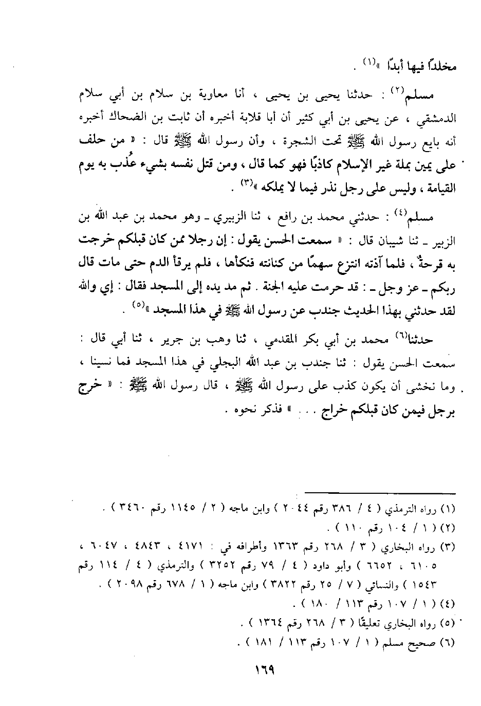 مُسلم: حَدثنَا يحيى بن يحيى، أَنا مُعَاوِيَة بن سَلام بن أبي سَلام الدِّمَشْقِي، عَن يحيى بن أبي كثير أَن أَبَا قلَابَة أخبرهُ أَن ثَابت بن الضَّحَّاك أخبرهُ أَنه بَايع رَسُول الله - صَلَّى اللَّهُ عَلَيْهِ وَسَلَّم َ - تَحت الشَّجَرَة، وَأَن رَسُول الله - صَلَّى اللَّهُ عَلَيْهِ وَسَلَّم َ - قَالَ: " من حلف على يَمِين بِملَّة غير الْإِسْلَام كَاذِبًا فَهُوَ كَمَا قَالَ، وَمن قتل نَفسه بِشَيْء عذب بِهِ يَوْم الْقِيَامَة، وَلَيْسَ على رجل نذر فِيمَا لَا يملكهُ "