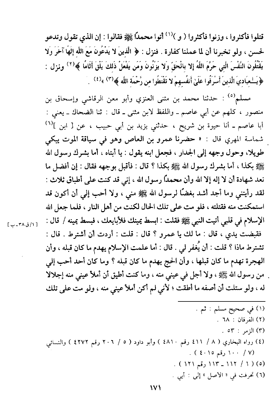 مُسلم: حَدثنَا مُحَمَّد بن مثنى الْعَنزي وَأَبُو معن الرقاشِي وَإِسْحَاق بن مَنْصُور، كلهم عَن أبي عَاصِم - وَاللَّفْظ لِابْنِ مثنى - قَالَ: ثَنَا الضَّحَّاك - يَعْنِي: أَبَا عَاصِم - أَنا حَيْوَة بن شُرَيْح، حَدثنِي يزِيد بن أبي حبيب، عَن [ابْن] شماسَة الْمهرِي قَالَ: " حَضَرنَا عَمْرو بن الْعَاصِ وَهُوَ فِي سِيَاقه الْمَوْت يبكي طَويلا، وحول وَجهه إِلَى الْجِدَار، فَجعل ابْنه يَقُول: يَا أبتاه، أما بشرك رَسُول الله - صَلَّى اللَّهُ عَلَيْهِ وَسَلَّم َ - بِكَذَا، أما بشرك رَسُول الله - صَلَّى اللَّهُ عَلَيْهِ وَسَلَّم َ - بِكَذَا؟ قَالَ: فَأقبل بِوَجْهِهِ فَقَالَ: إِن أفضل مَا نعد شَهَادَة أَن لَا إِلَه إِلَّا الله وَأَن مُحَمَّدًا رَسُول الله، إِنِّي قد كنت على أطباق ثَلَاث: لقد رَأَيْتنِي وَمَا أجد أَشد بغضاً لرَسُول الله - صَلَّى اللَّهُ عَلَيْهِ وَسَلَّم َ - مني، وَلَا أحب إِلَيّ أَن أكون قد اسْتَمْكَنت مِنْهُ فَقتلته، فَلَو مت على تِلْكَ الْحَال لَكُنْت من أهل النَّار، فَلَمَّا جعل الله الْإِسْلَام فِي قلبِي أتيت النَّبِي - صَلَّى اللَّهُ عَلَيْهِ وَسَلَّم َ - فَقلت: ابْسُطْ يَمِينك فلأبايعك، فَبسط / يَمِينه قَالَ: فقبضت يَدي، قَالَ: مَا لَك يَا عَمْرو؟ قَالَ: قلت: أردْت أَن أشْتَرط. قَالَ: تشْتَرط مَاذَا؟ قلت: أَن يغْفر لي. قَالَ: أما علمت الْإِسْلَام يهدم مَا كَانَ قبله، وَأَن الْهِجْرَة تهدم مَا كَانَ قبلهَا، وَأَن الْحَج يهدم مَا كَانَ قبله؟ وَمَا كَانَ أحد أحب أَلِي من رَسُول الله - صَلَّى اللَّهُ عَلَيْهِ وَسَلَّم َ -، وَلَا أجل فِي عَيْني مِنْهُ، وَمَا كنت أُطِيق أَن أملأ عَيْني مِنْهُ إجلالا لَهُ، وَلَو سُئِلت أَن أصفه مَا أطقت، لِأَنِّي لم أكن أملأ عَيْني مِنْهُ، وَلَو مت على تِلْكَ