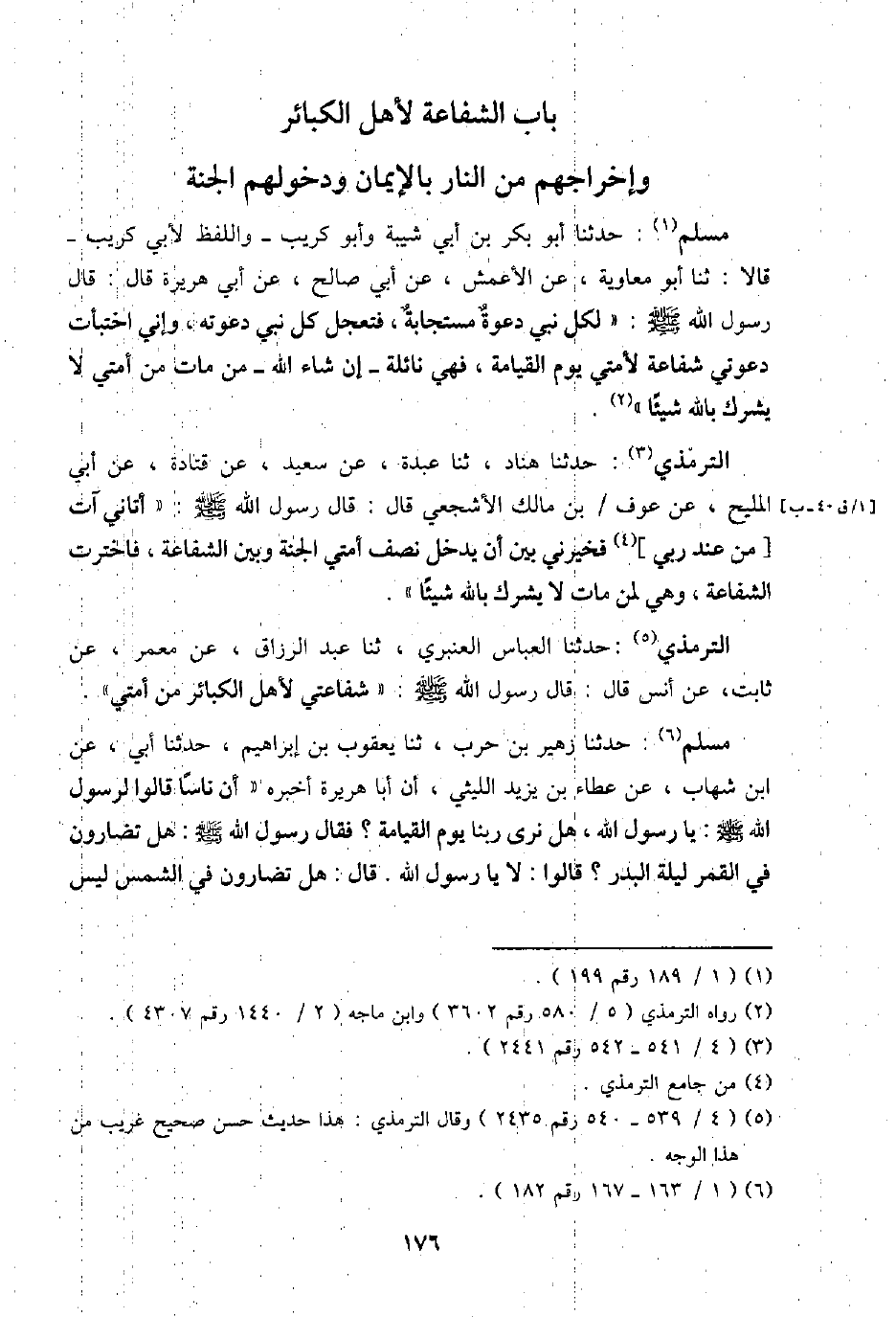 التِّرْمِذِيّ: حَدثنَا هناد، ثَنَا عَبدة، عَن سعيد، عَن قَتَادَة، عَن أبي الْمليح، عَن عَوْف بن مَالك الْأَشْجَعِيّ قَالَ: قَالَ رَسُول الله - صَلَّى اللَّهُ عَلَيْهِ وَسَلَّم َ -: " أتانى آتٍ [من عِنْد رَبِّي] فخيرني بَين أَن يدْخل نصف أمتِي الْجنَّة وَبَين الشَّفَاعَة، فاخترت الشَّفَاعَة، وَهِي لمن مَاتَ لَا يُشْرك بِاللَّه شَيْئا ".